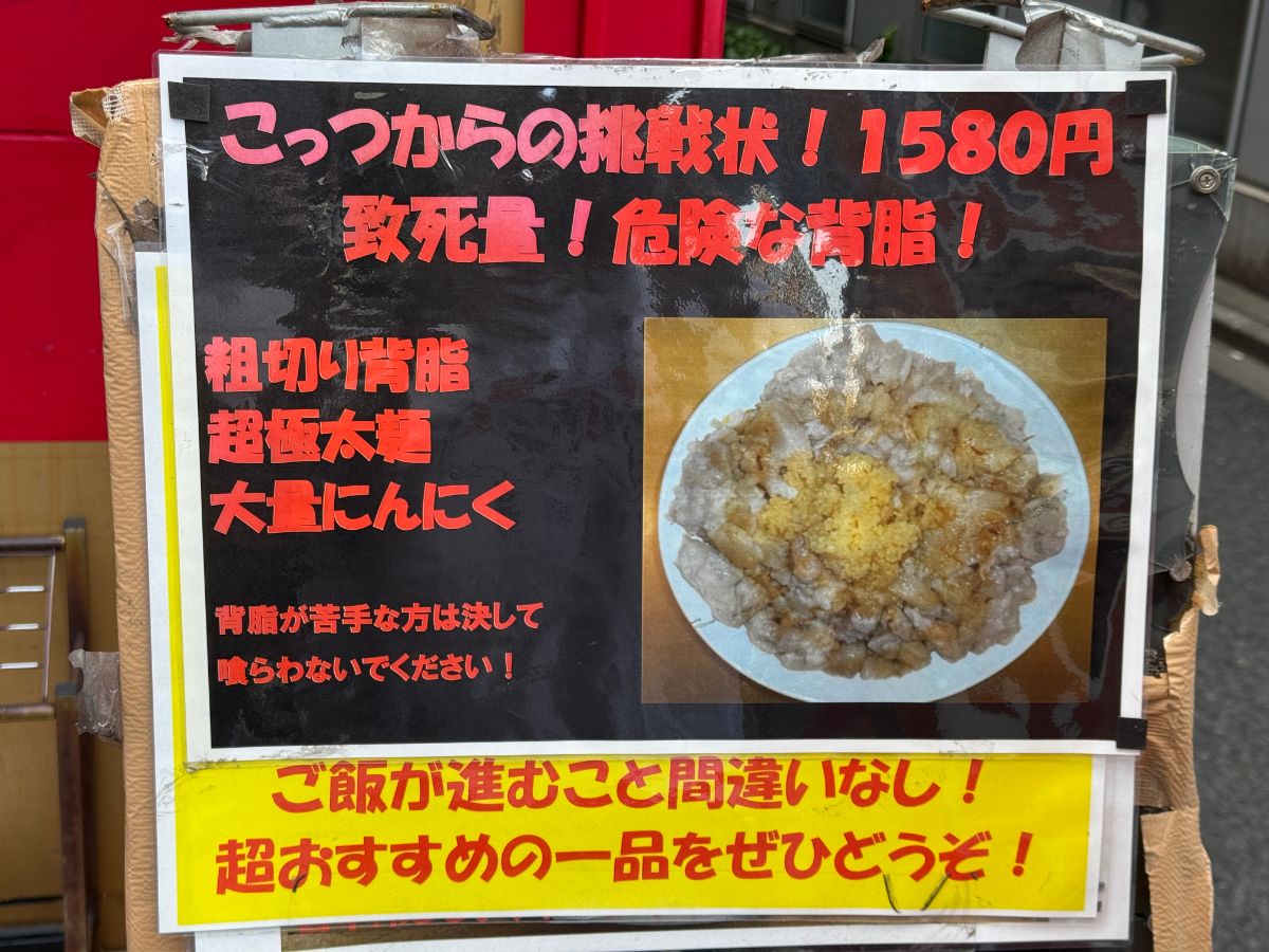 お店に行ってみると……、アブラだらけのラーメン、確かにあった。お店がみずから「致死量! 危険な背脂!」「背脂が苦手な人は決して喰らわないでください!」と注意喚起している! そんなにアブラがヤバイのか! 逆に食べたくなってきた!