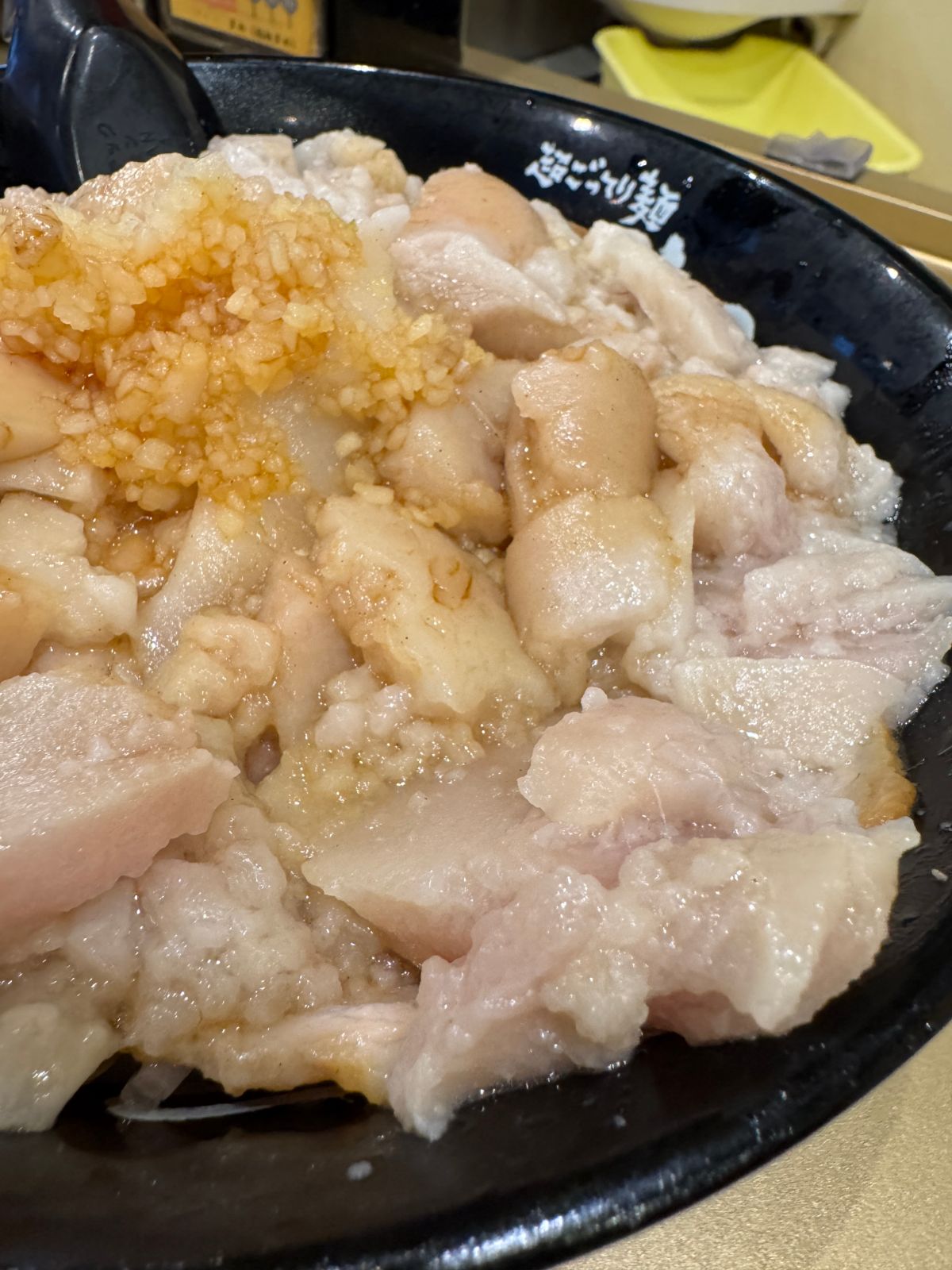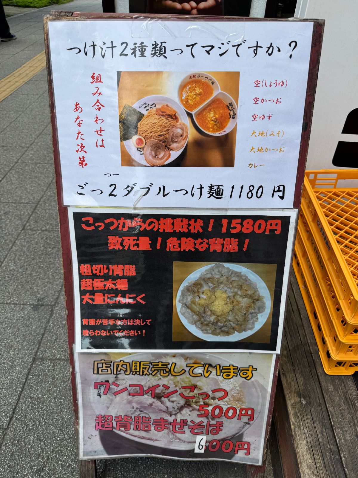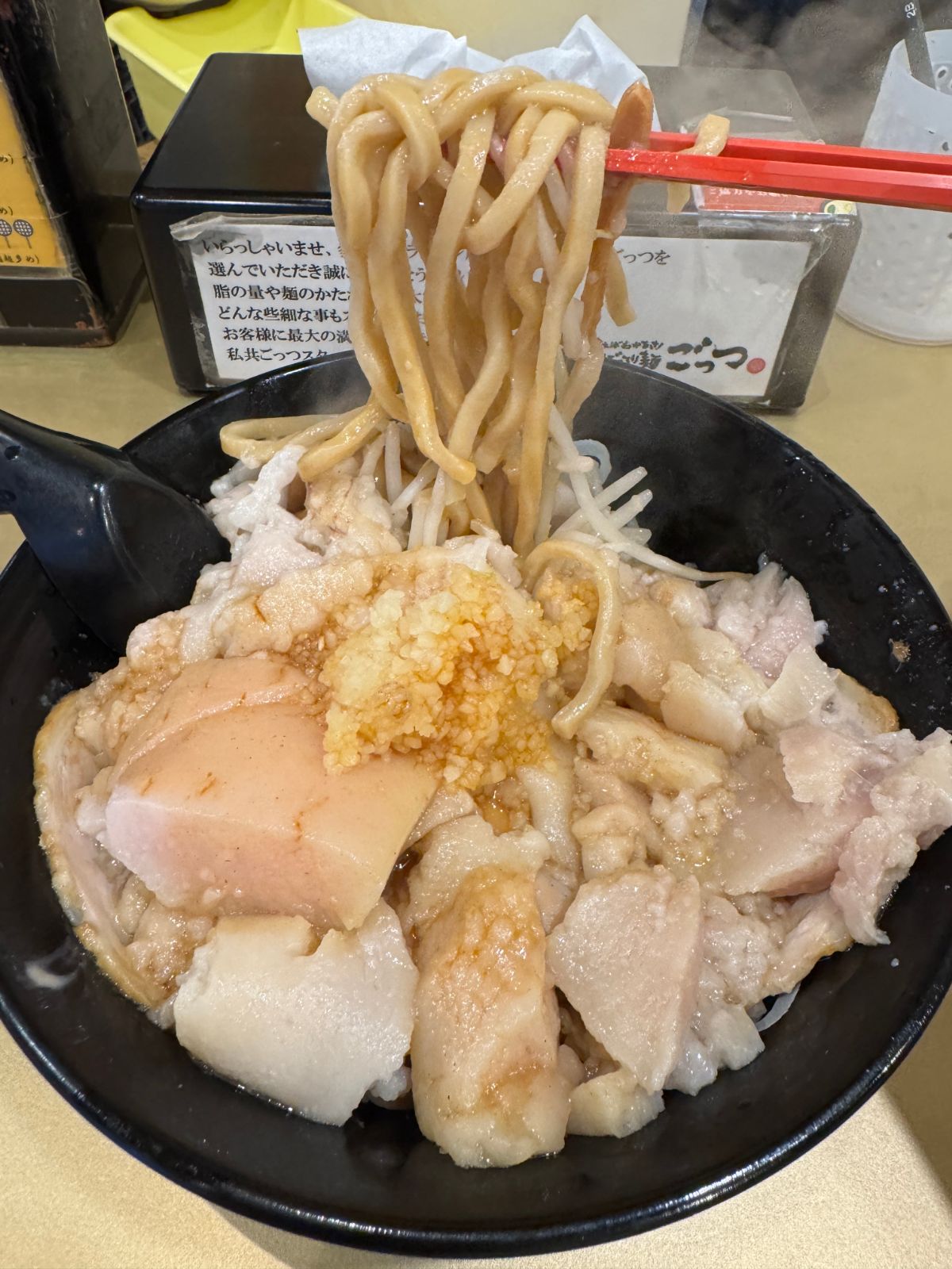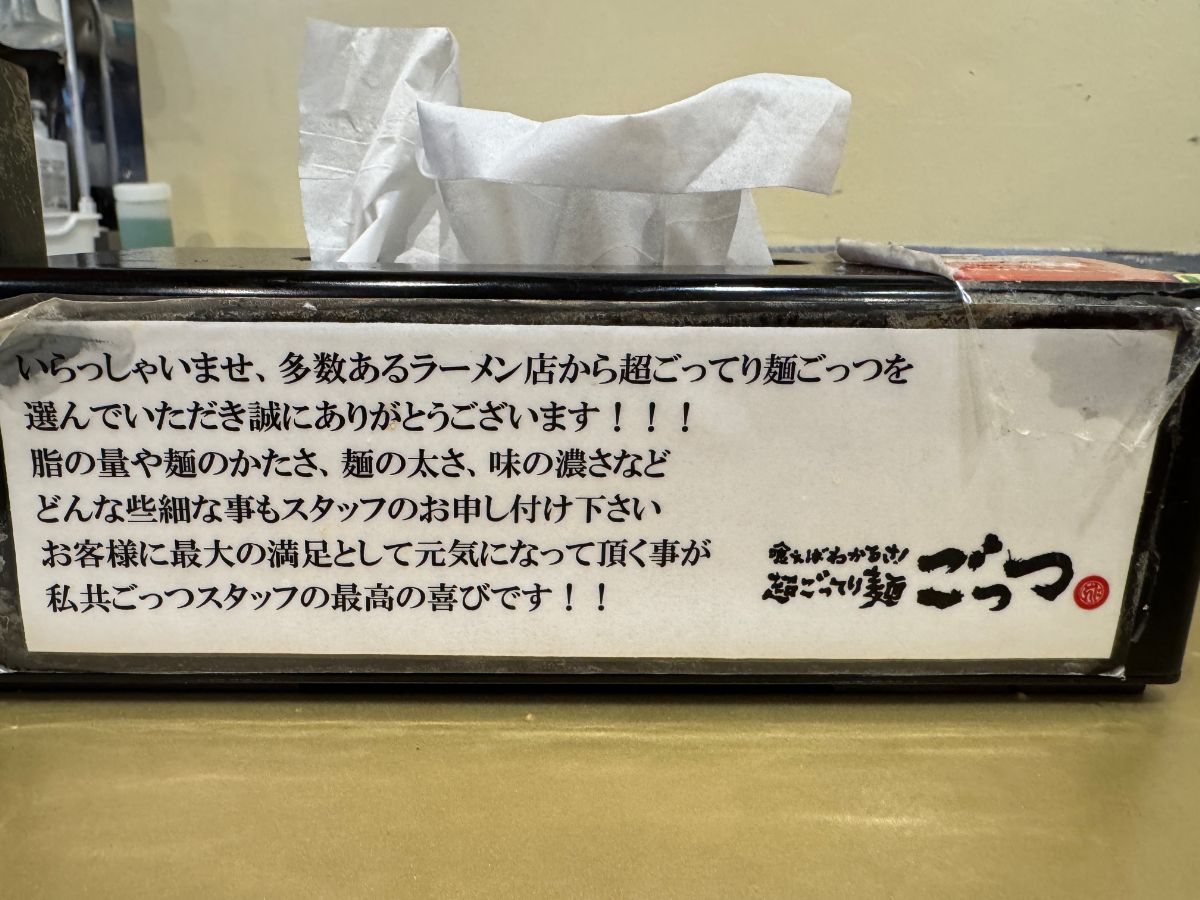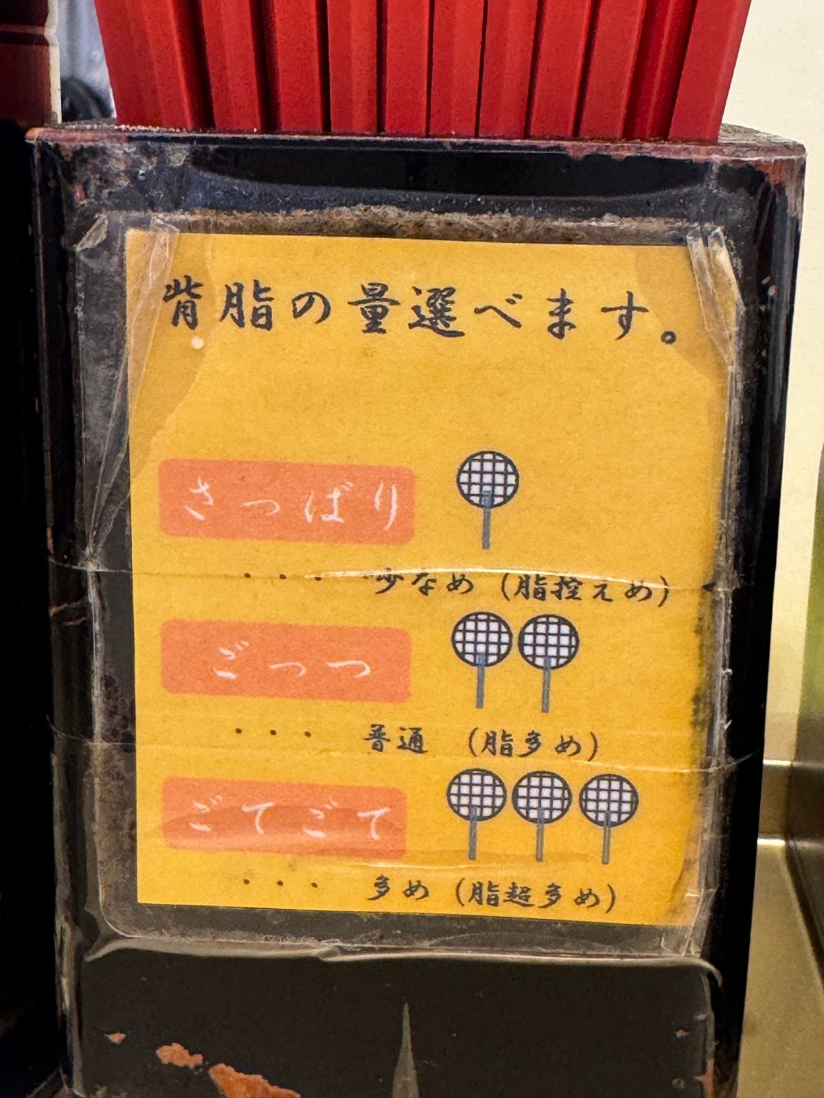 店内に入り、食券を買い、空いている席に着席。店員さんめっちゃ元気で、めっちゃ優しい接客。ステキやん? 壁を見てみると、どうやらアブラの量を増やすことができるらしい。ただでさえアブラ爆盛りなのに、もっと増やせるってコト!? ということで、店員さんに「ごてごてお願いします」と伝える。ごてごてとは「超脂多め」という意味。