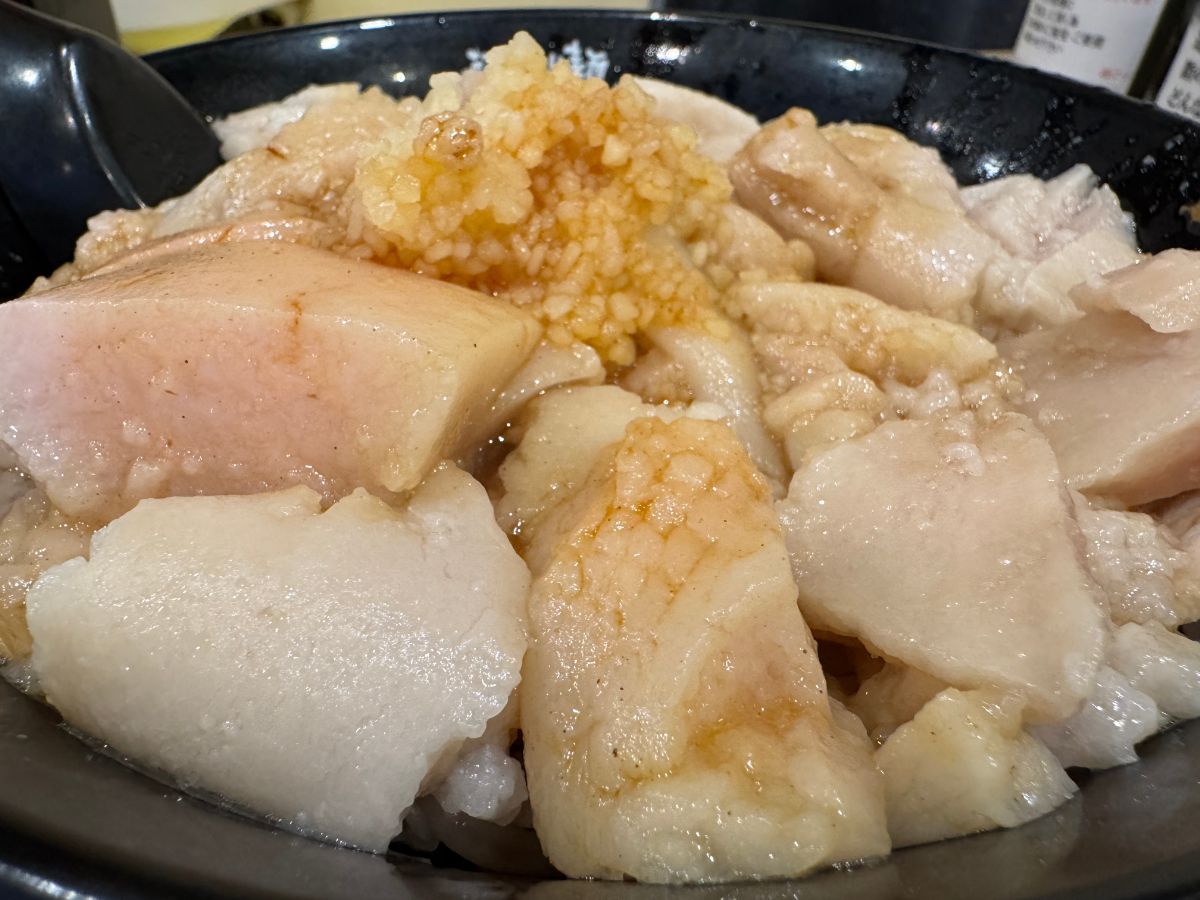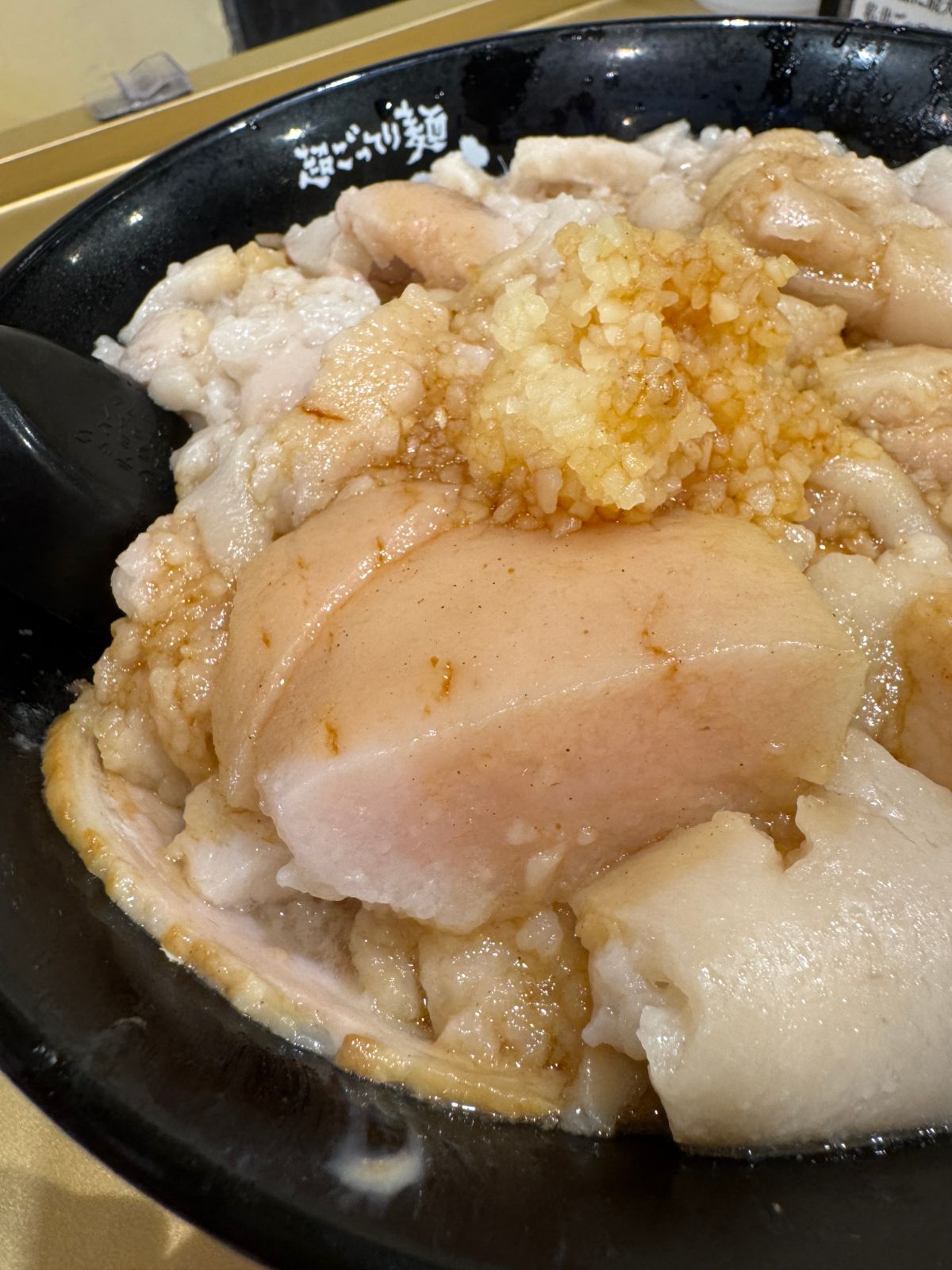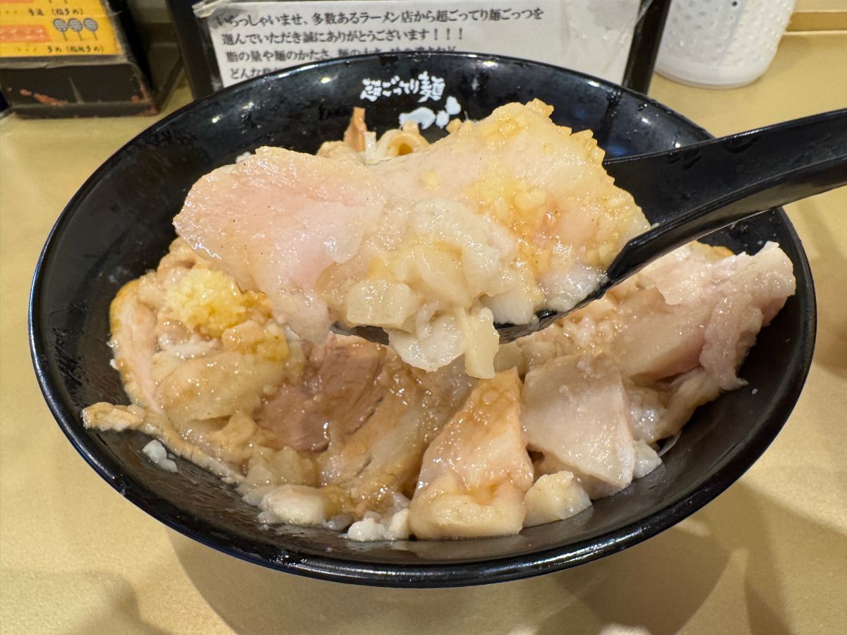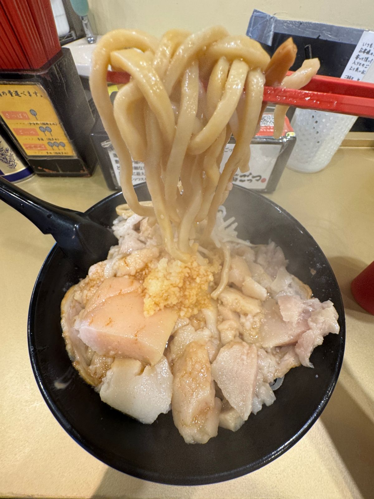 今度は良くかき混ぜて食べる。うまいッ!! 今度はタレが全体的にまわって、均等な濃さに。でもちょっとまって、けっこう麺をズズッとすすりまくっているけど、まっっっっったく、しつこくない! むしろ旨味が濃さと塩味を盛り上げていて良き!!