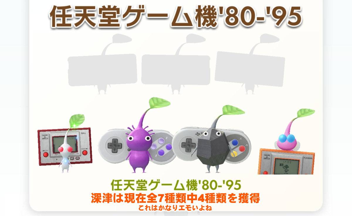 それにちなんで現在開催されている長期イベント“任天堂ゲーム機”は、レトロゲーム機を身に着けたデコピクミンが狙えるコレクション性の高いチャレンジ要素だ。