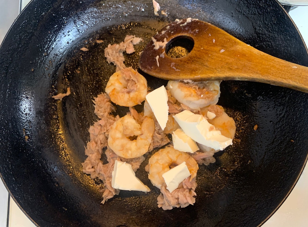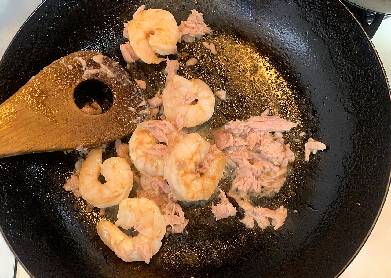 エビがこんがりしてきたらシーチキン1缶を入れてサッと軽く炒めます。