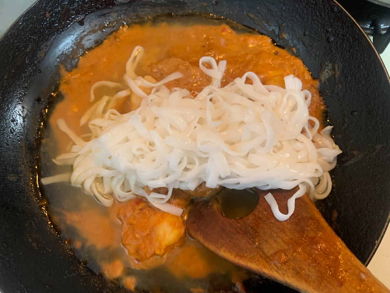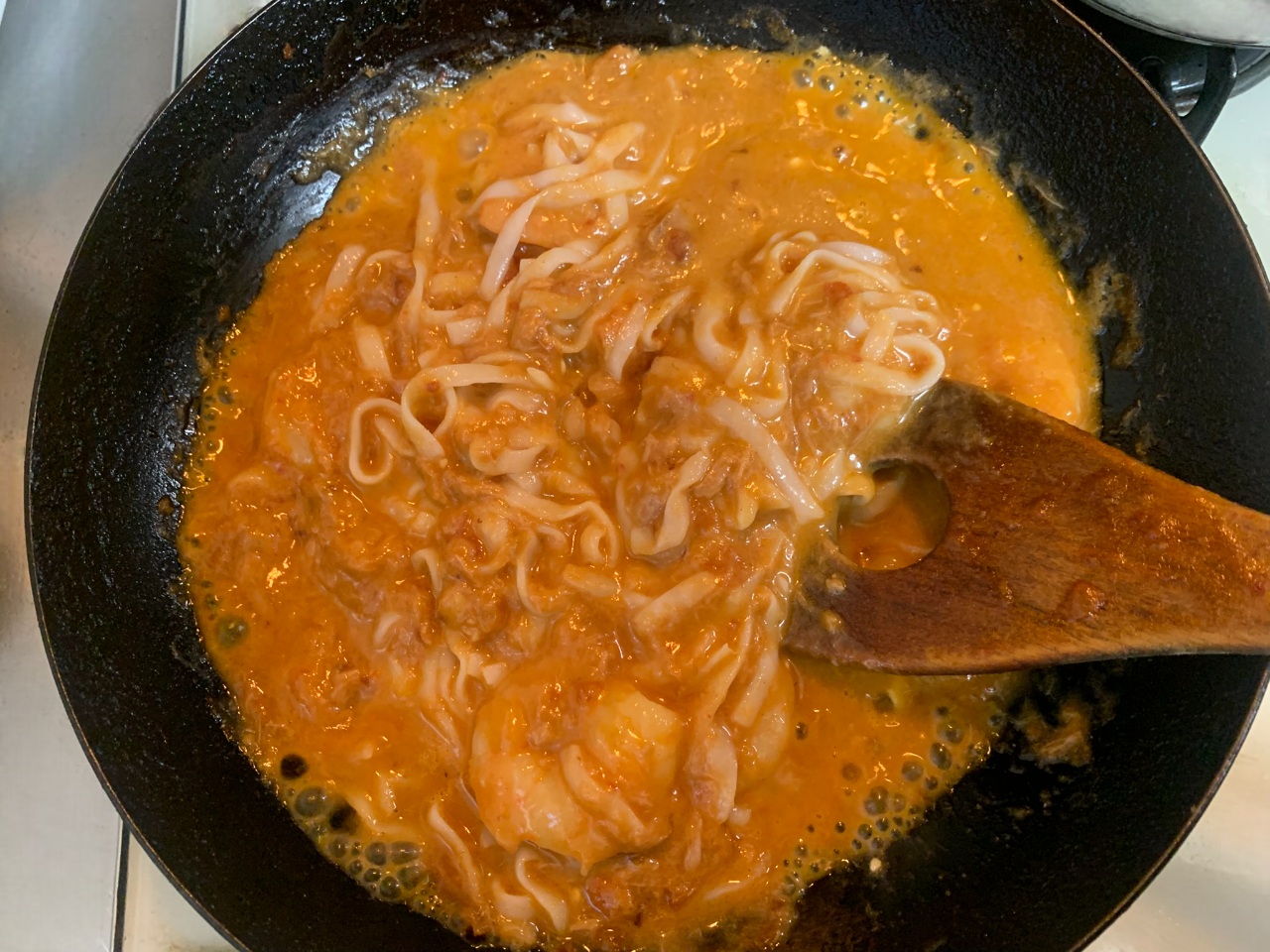 水ごと麺を入れてしまったので、余分な水分を飛ばすために結構長い時間コトコト煮込んだのに全然フニャフニャにならない!! 冷めきってから食べてもプリプリ感は健在で、まずは食感に驚きます!!