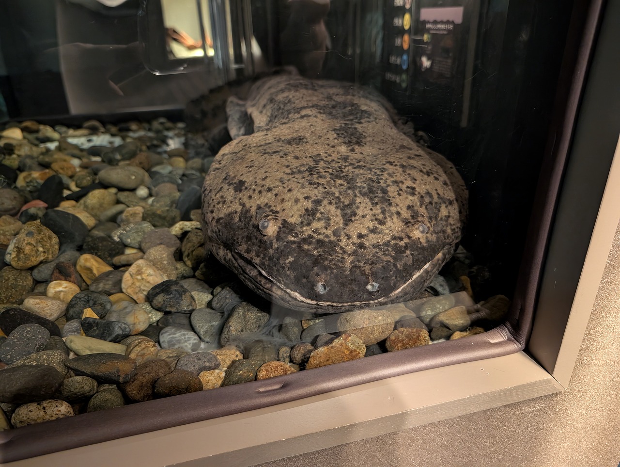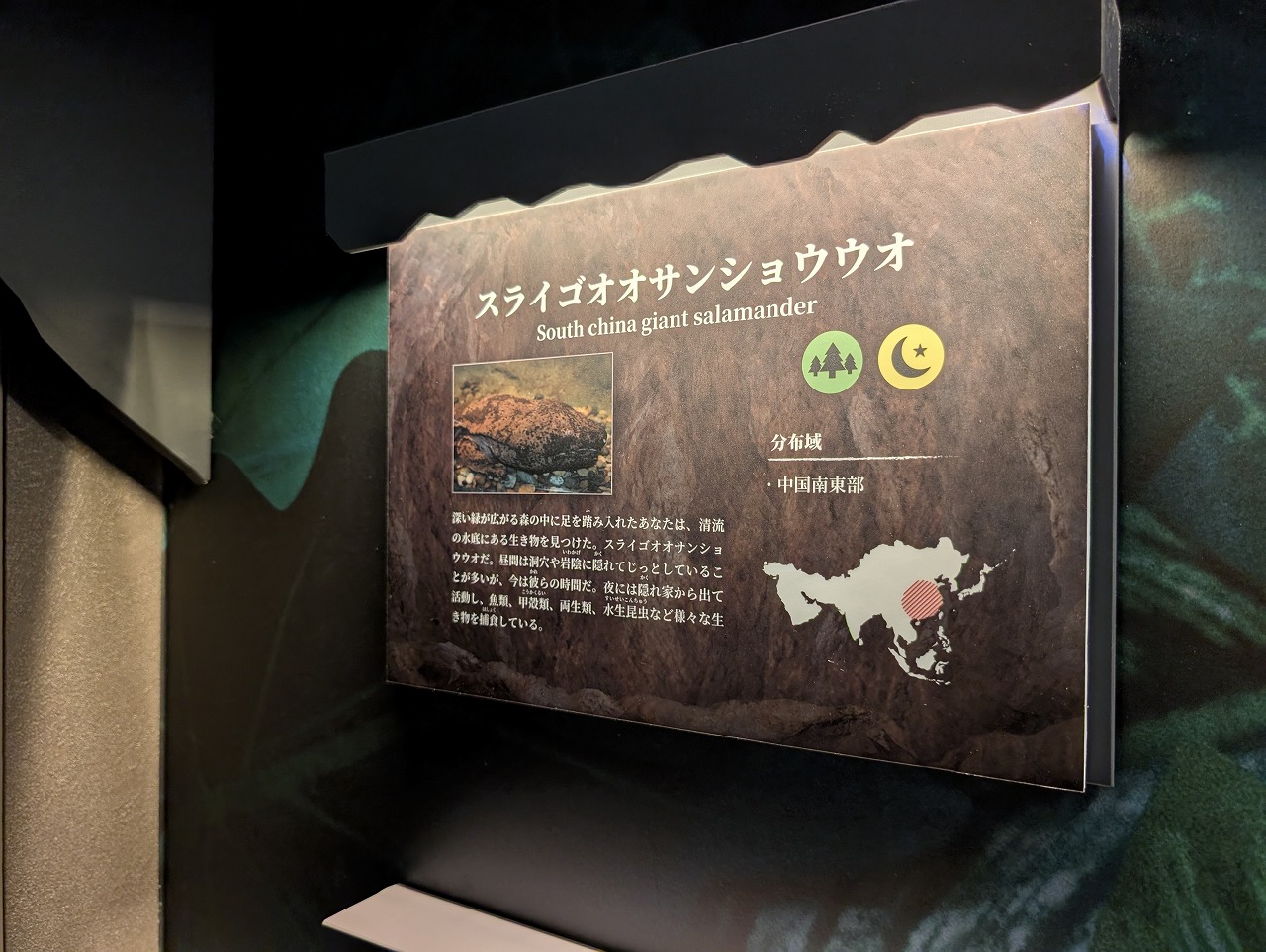 こちらは、中国の野生下では絶滅したと考えられ、日本国内で2個体のみ飼育されているという大変希少性の高いスライゴオオサンショウウオ。エントランスを入ってすぐのエリアに展示され、みなさまを出迎えます。
