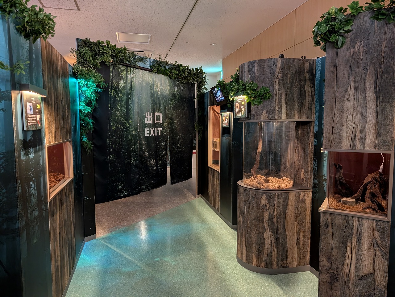 「真夜中のいきもの展」なので、展示エリアを薄暗く演出。日中は寝ていることが多い夜行性の生き物たちが活動する様子や、暗闇で発光する生き物など、普段なかなか見られない生き物たちを観察するチャンスです。