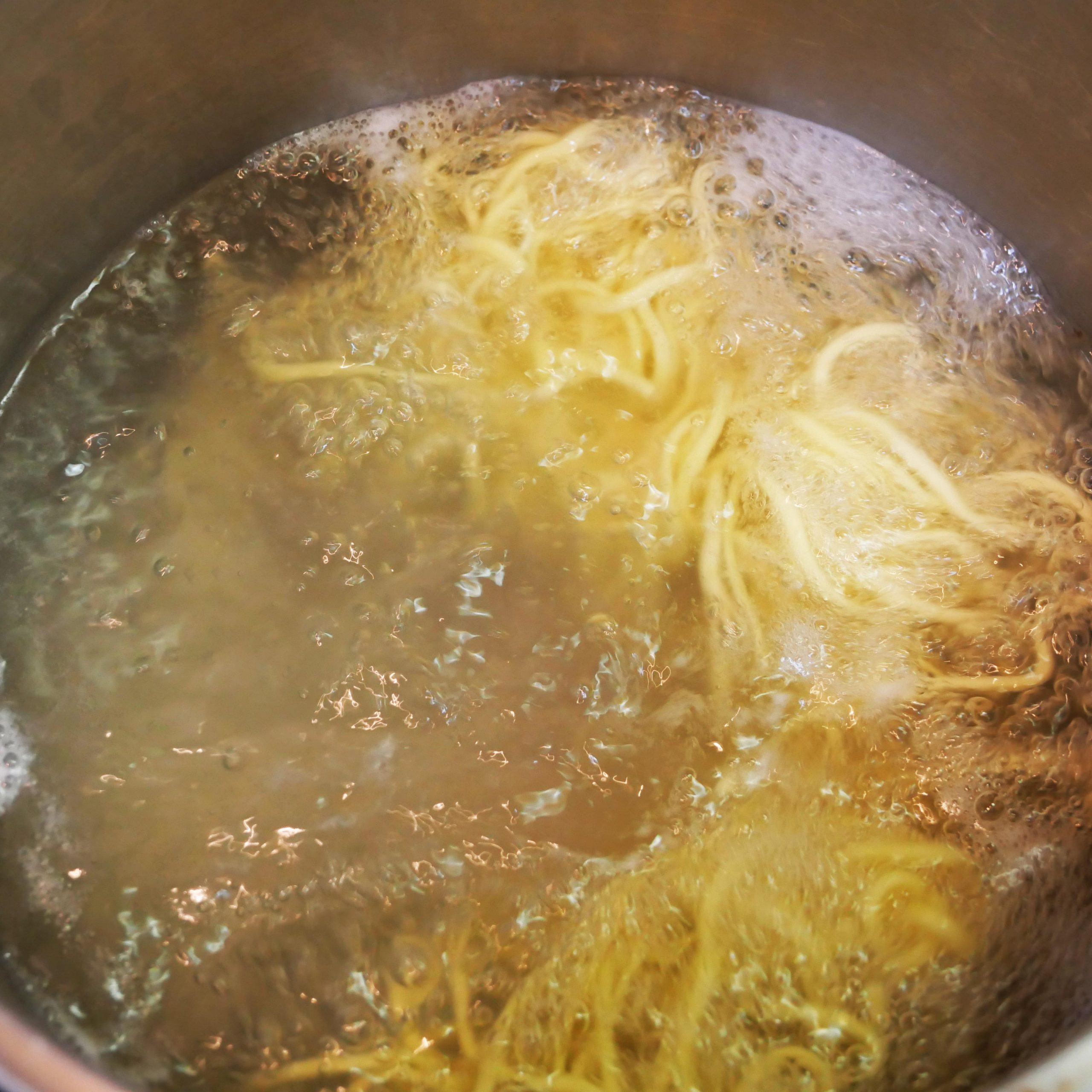 1. キャベツは食べやすい大きさにちぎる。中華めんを表示通りにゆで、ゆで時間残り1分になったらキャベツともやしも入れる。
