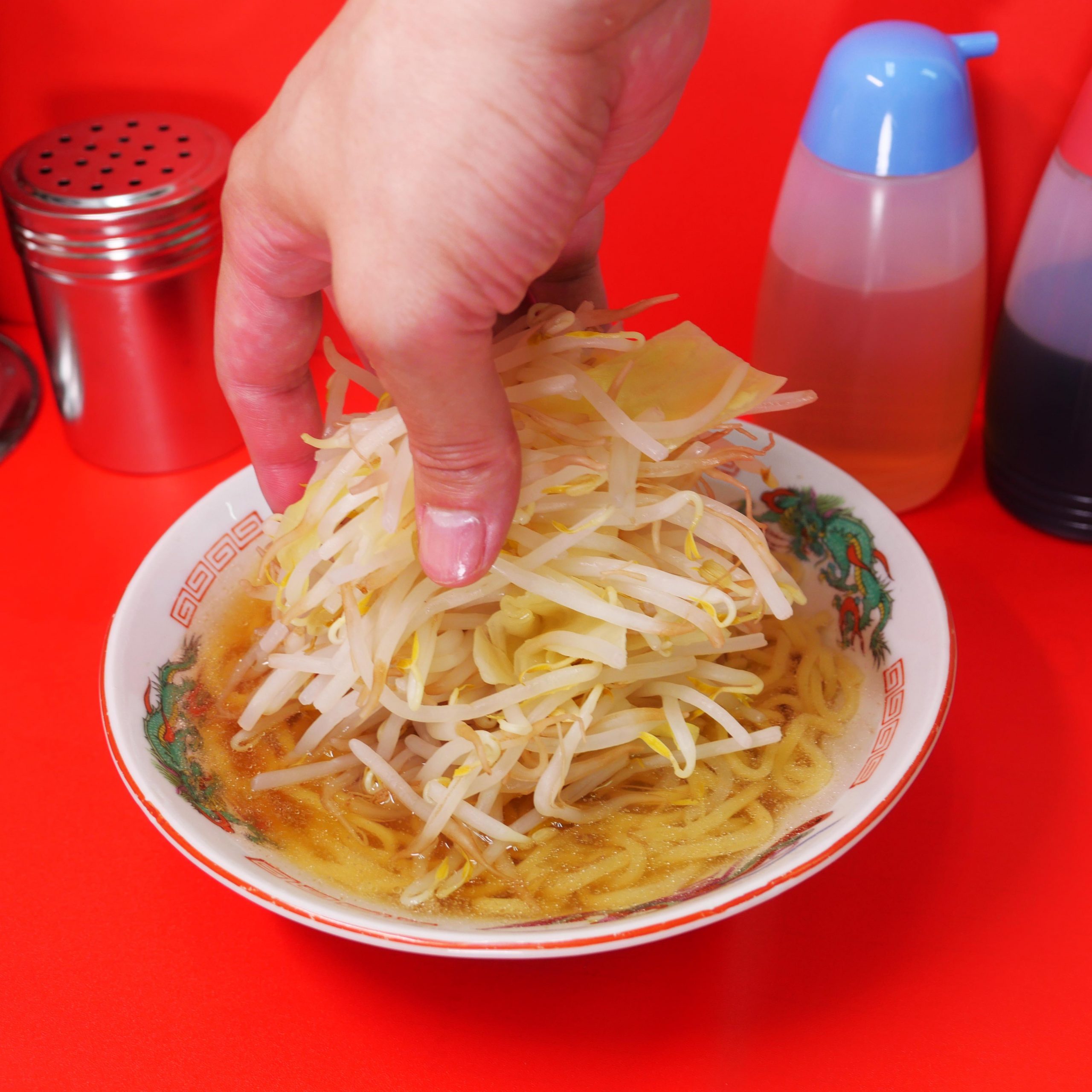 2. スープを器にそそぎ、表示通り茹でた中華めん、もやしとキャベツの順にのせる。焼き豚をそえる。