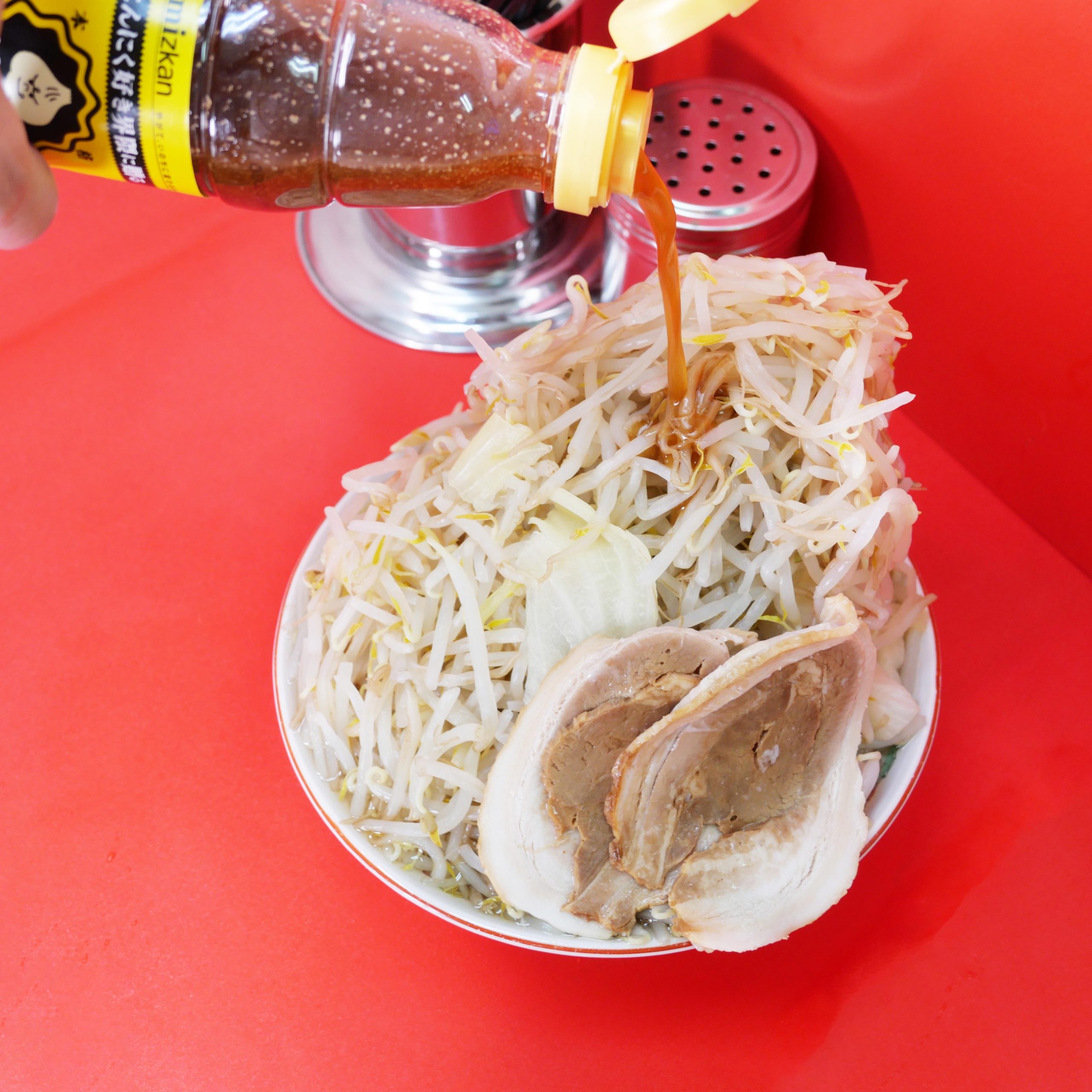 ヤサイマシマシにして、上からダイレクトに「LOVERZたれつゆ にんにく醤油」をかけて、ヤサイカラメマシマシにしましたの。いかがかしら? わたくしにとってはご褒美なのでございます。おいしゅうございます。「LOVERZたれつゆ にんにく醤油」は野菜をもあの店の味っぽくなるのでございます。