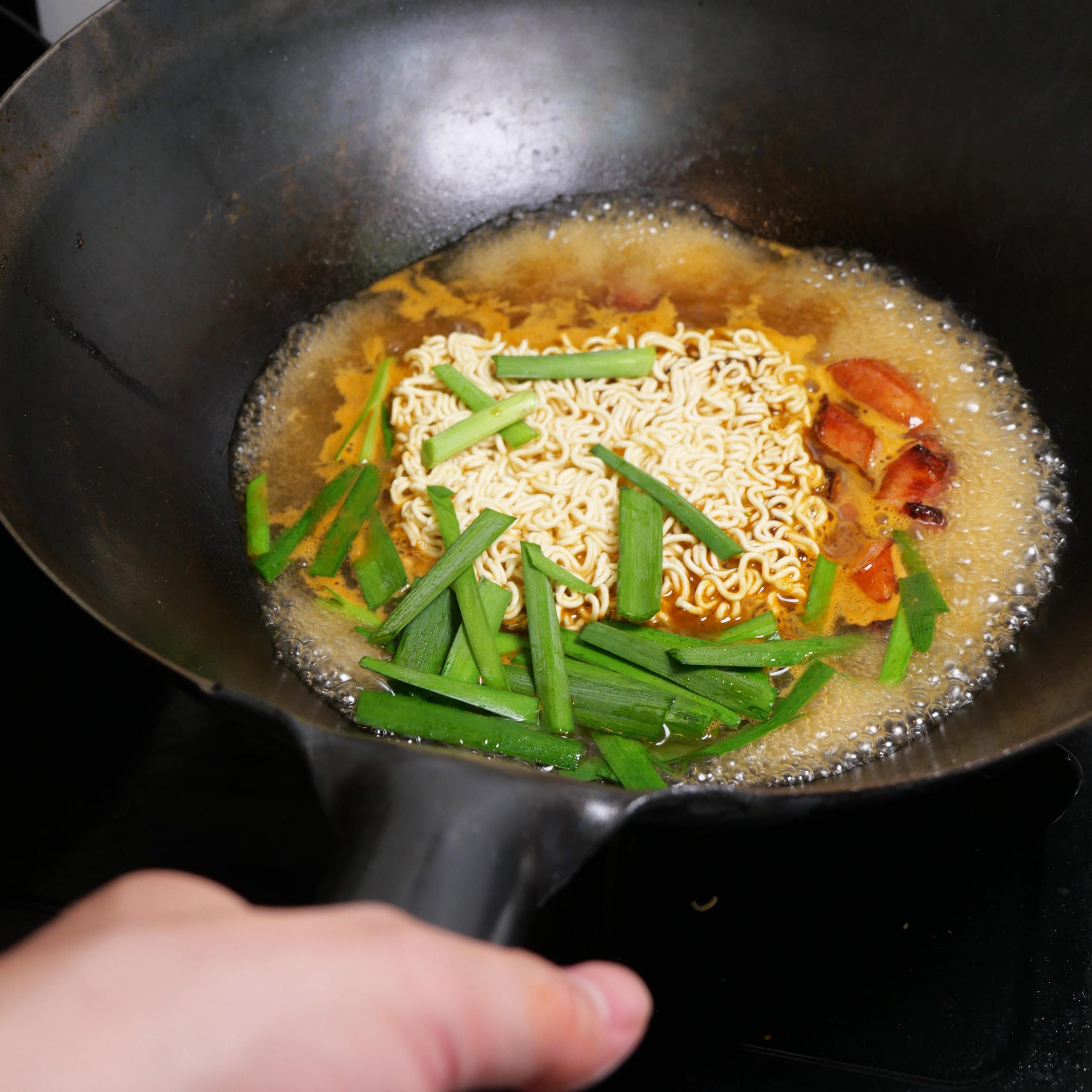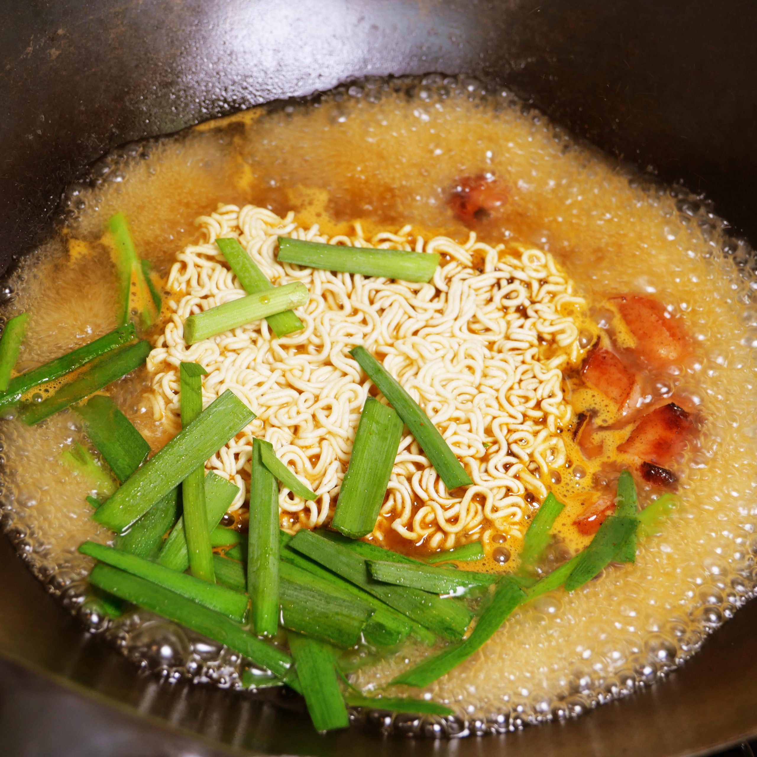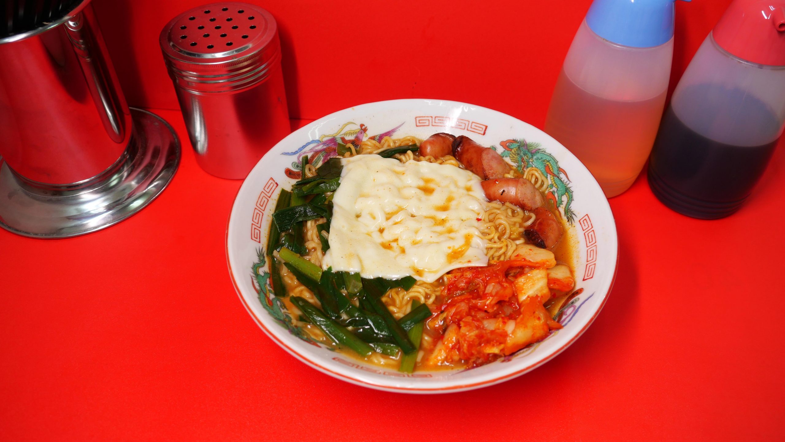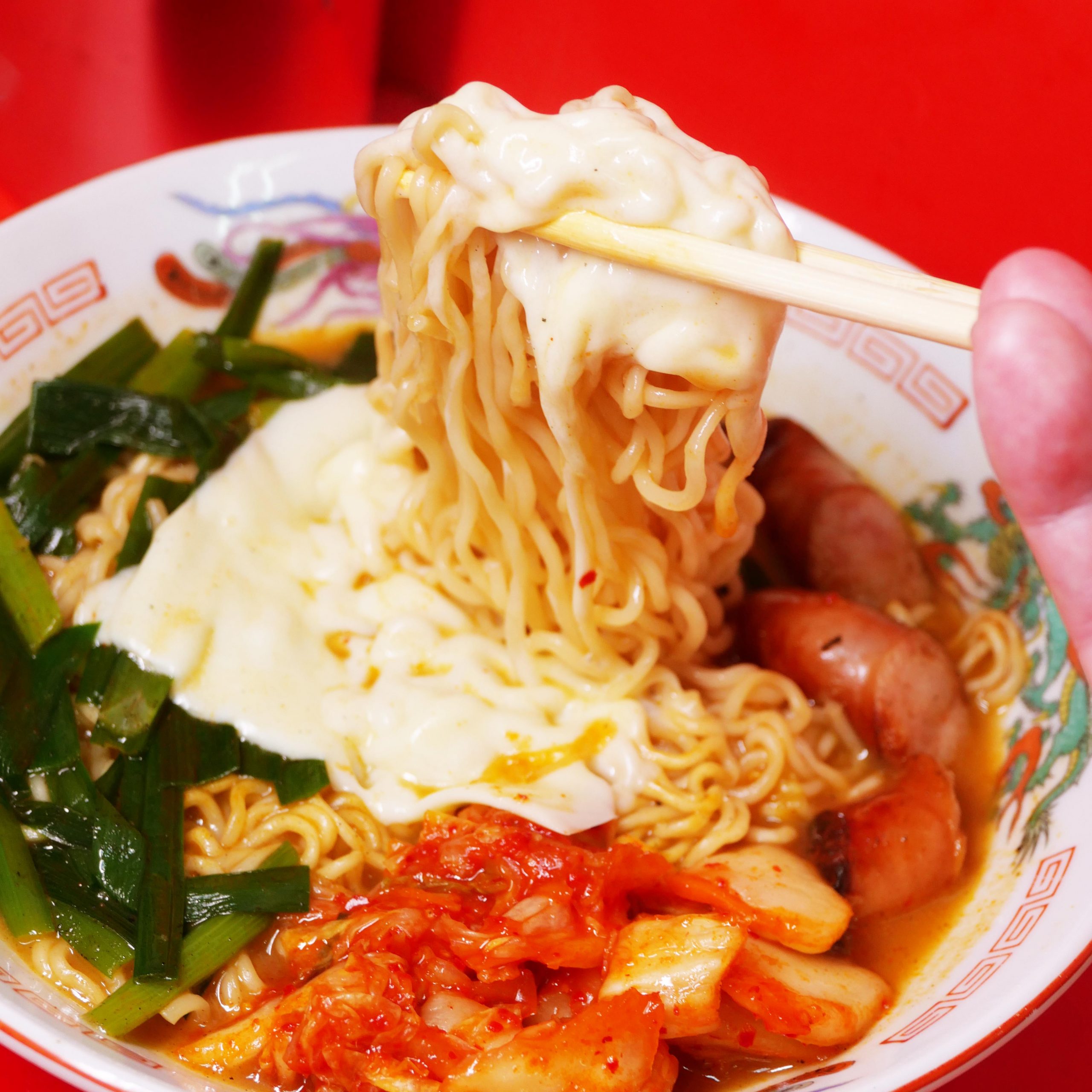 2. 鍋にごま油をひき中火で熱し、ウインナーを炒め、焼き目がついたら「LOVERZたれつゆ 辛旨醤」と水を入れる。沸騰したら、即席中華めんとにらを入れ、めんが柔らかくなり始めたら、器にスープごと盛る(麺はほぐさず、そのまま器に盛ると、よりプデチゲ風の見映えに近づきます)。