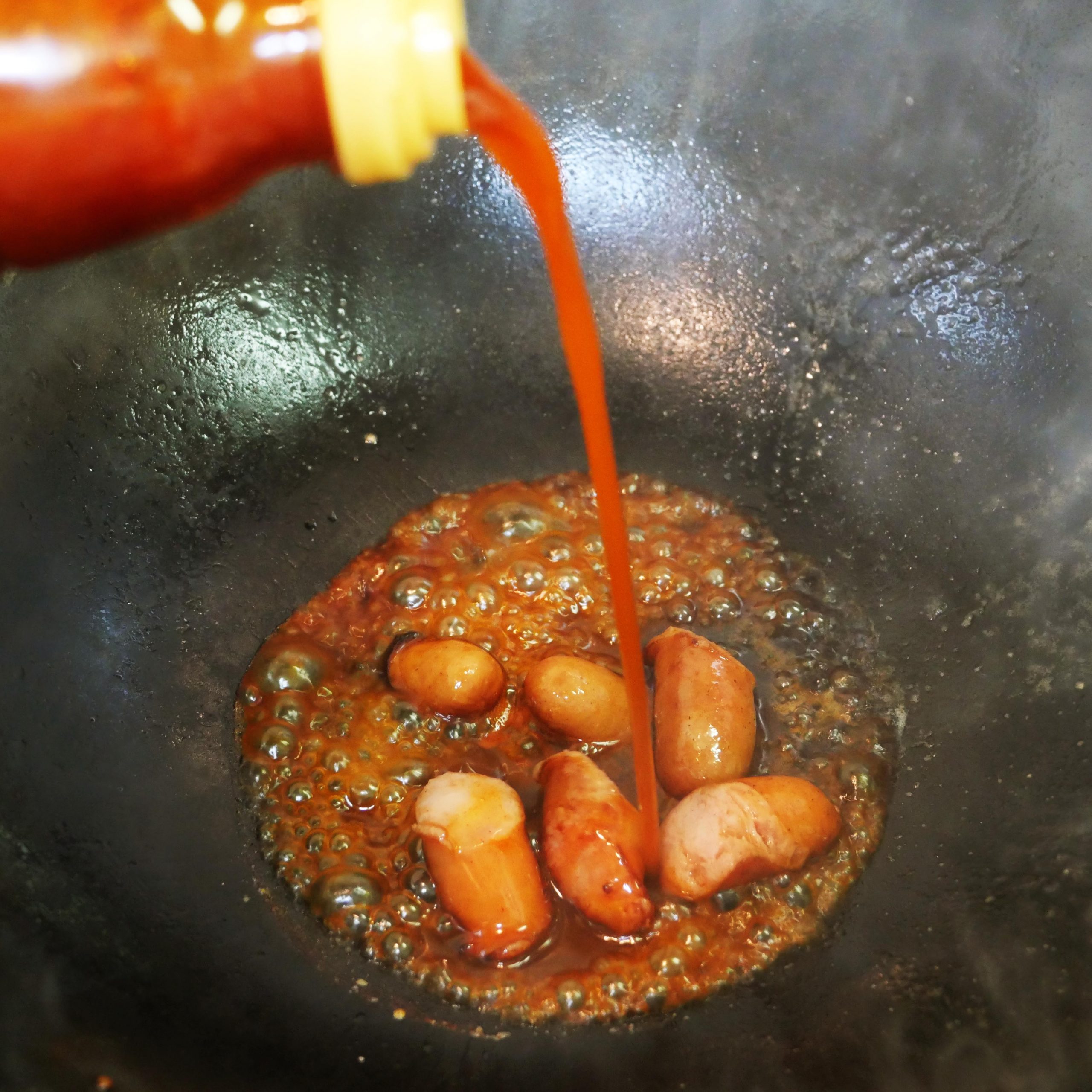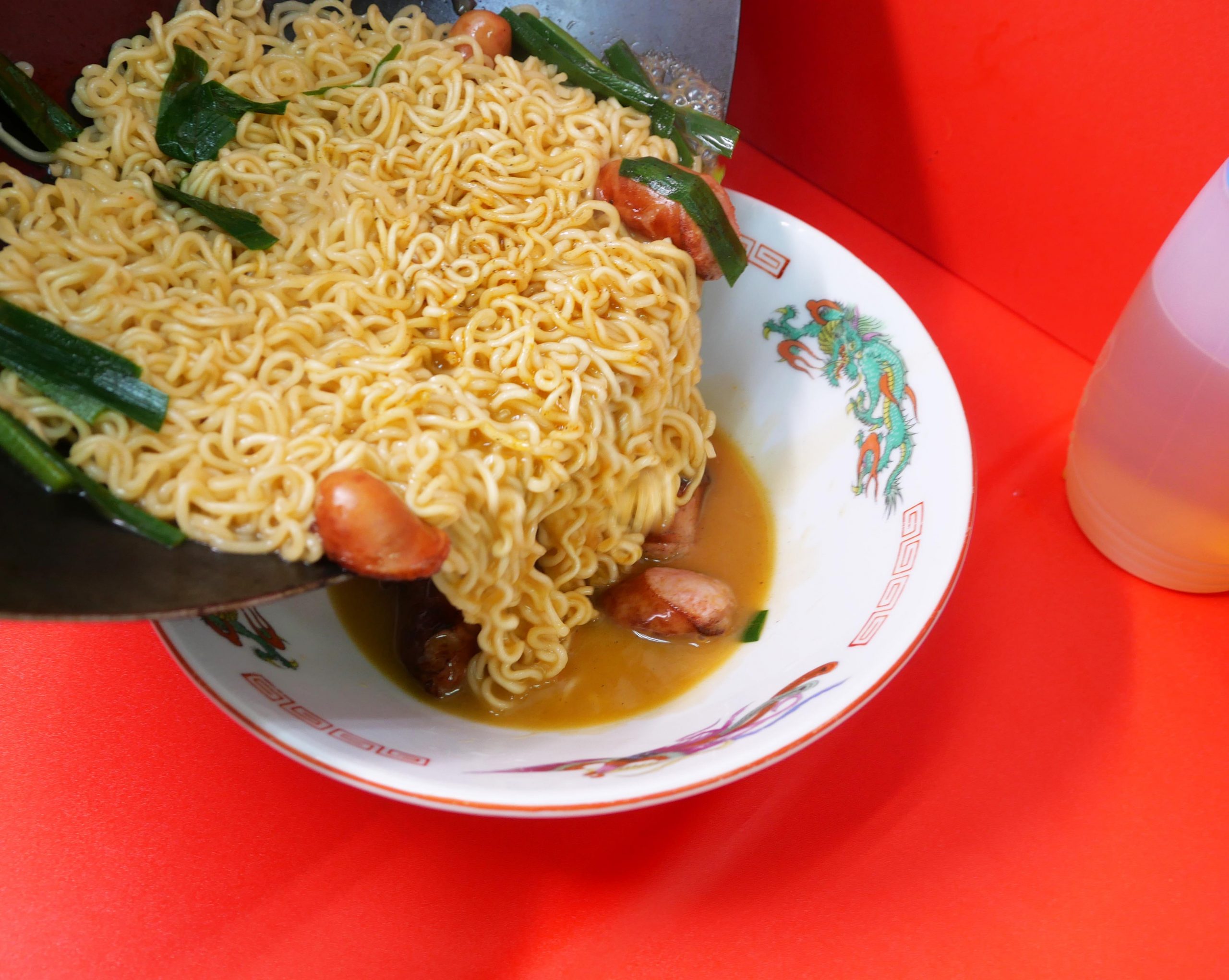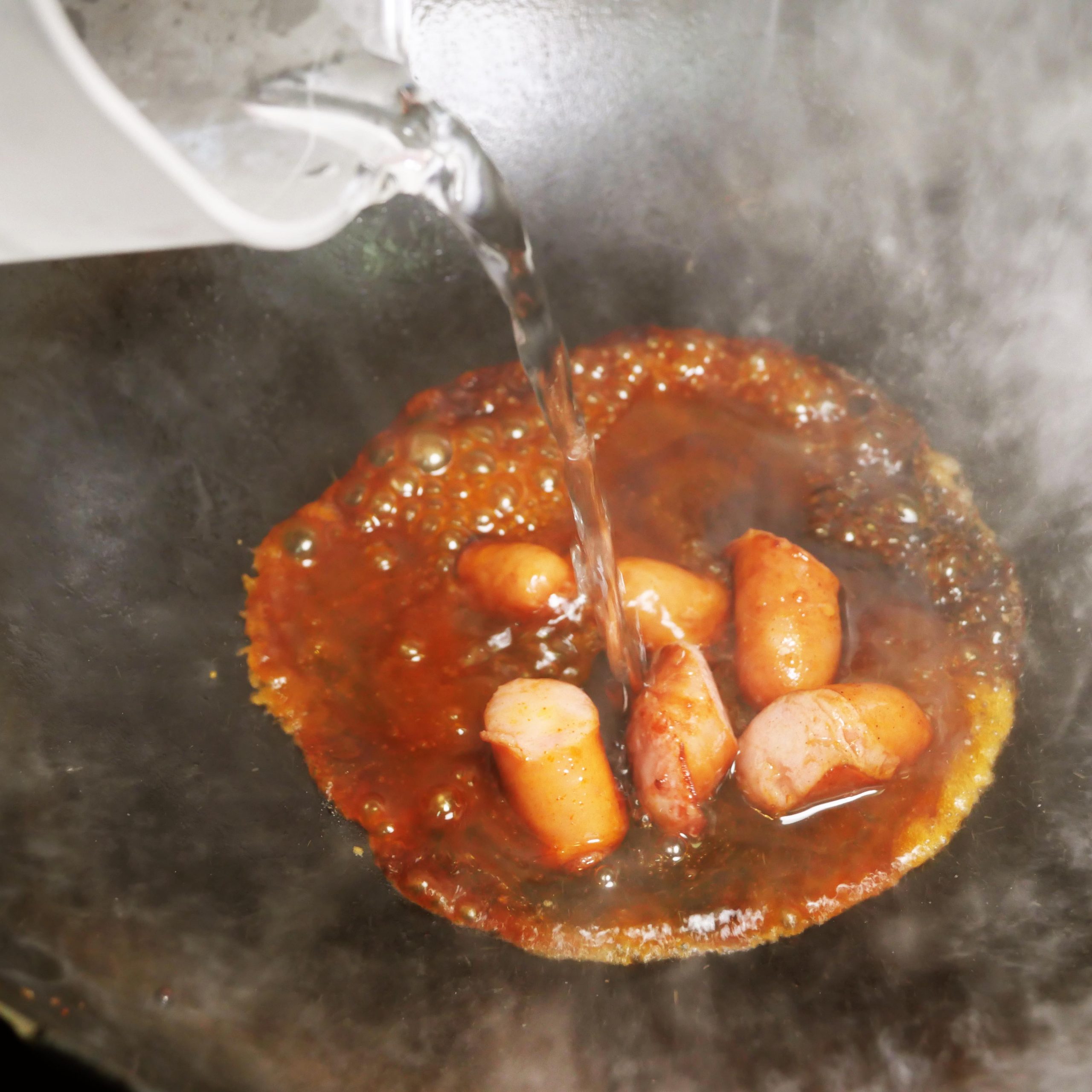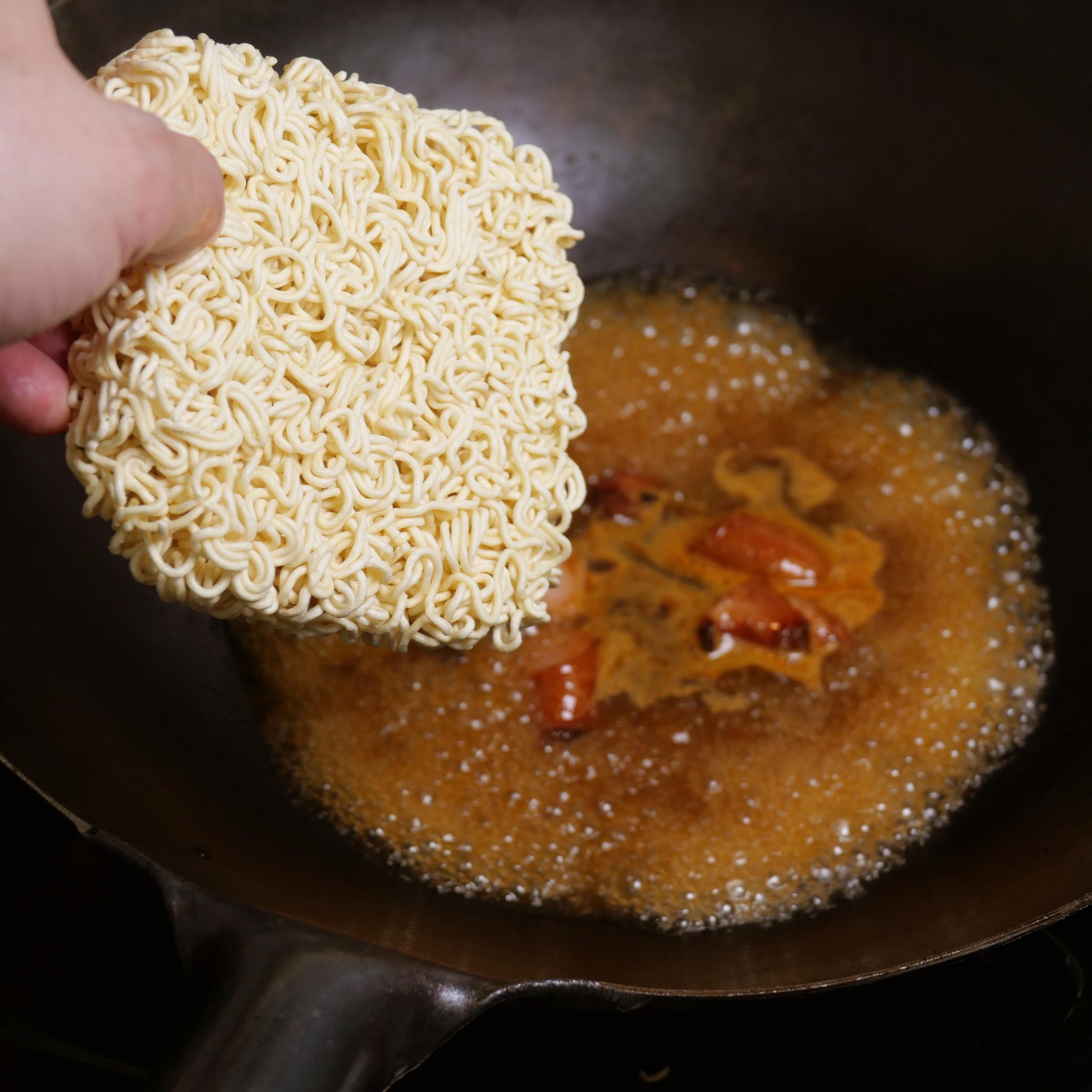 2. 鍋にごま油をひき中火で熱し、ウインナーを炒め、焼き目がついたら「LOVERZたれつゆ 辛旨醤」と水を入れる。沸騰したら、即席中華めんとにらを入れ、めんが柔らかくなり始めたら、器にスープごと盛る(麺はほぐさず、そのまま器に盛ると、よりプデチゲ風の見映えに近づきます)。