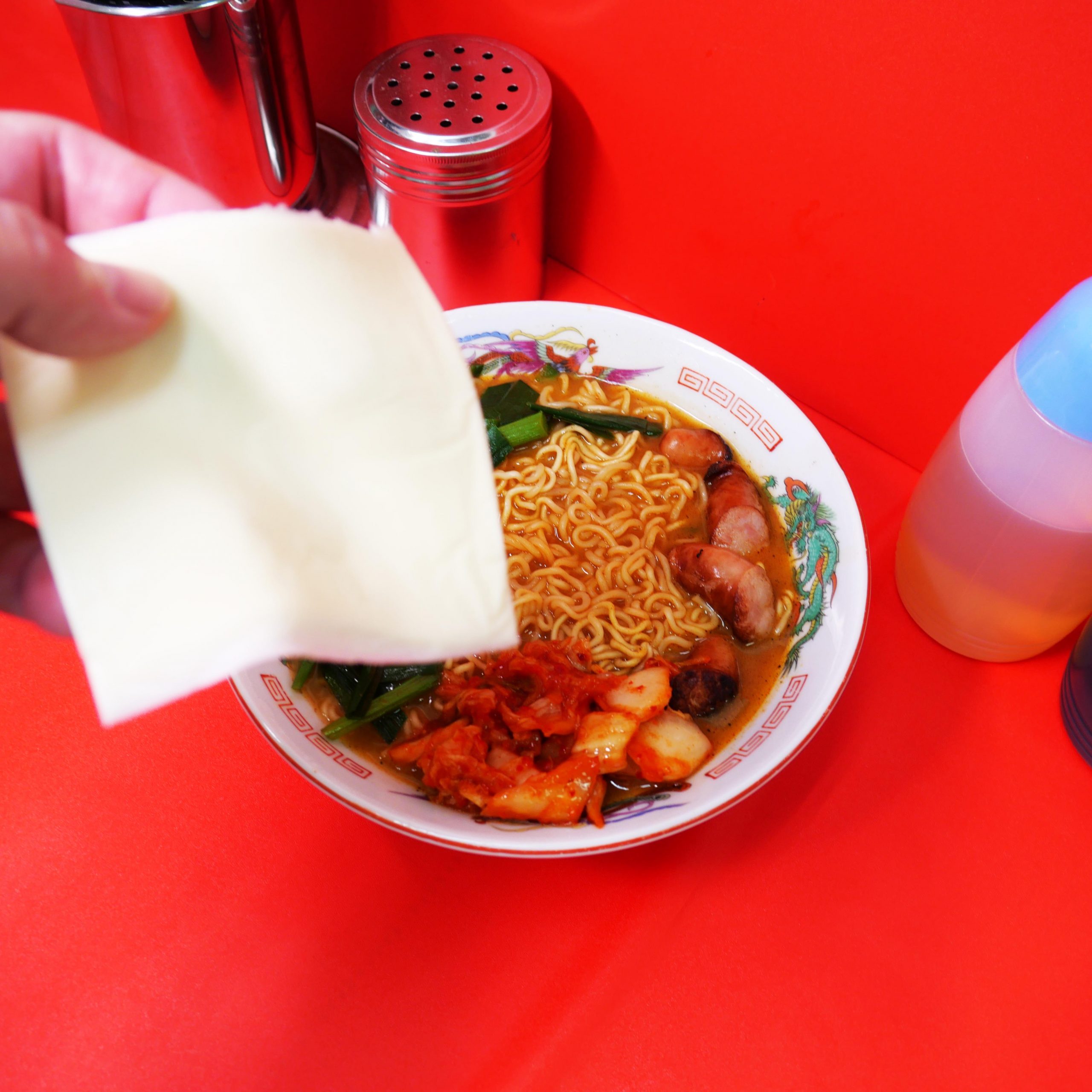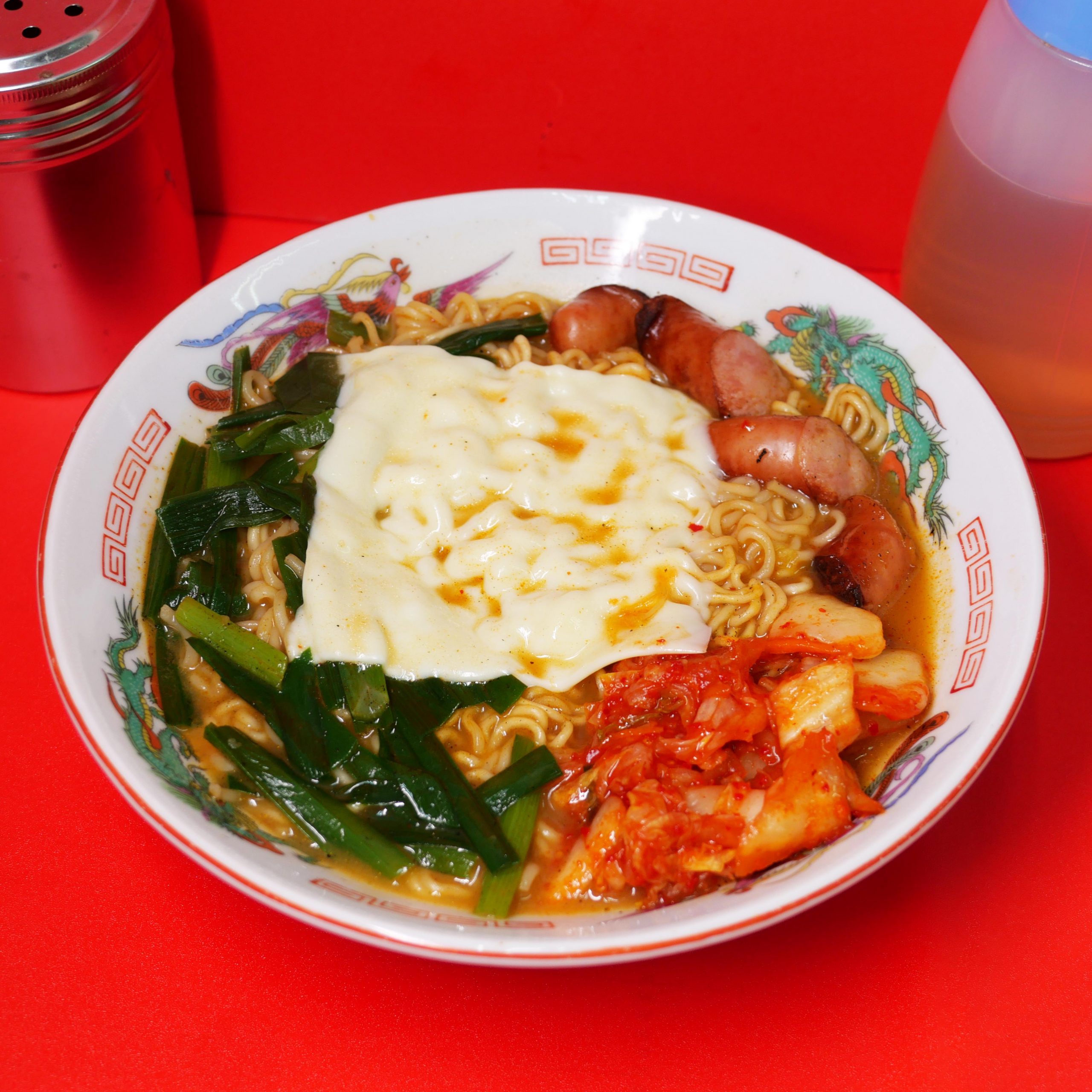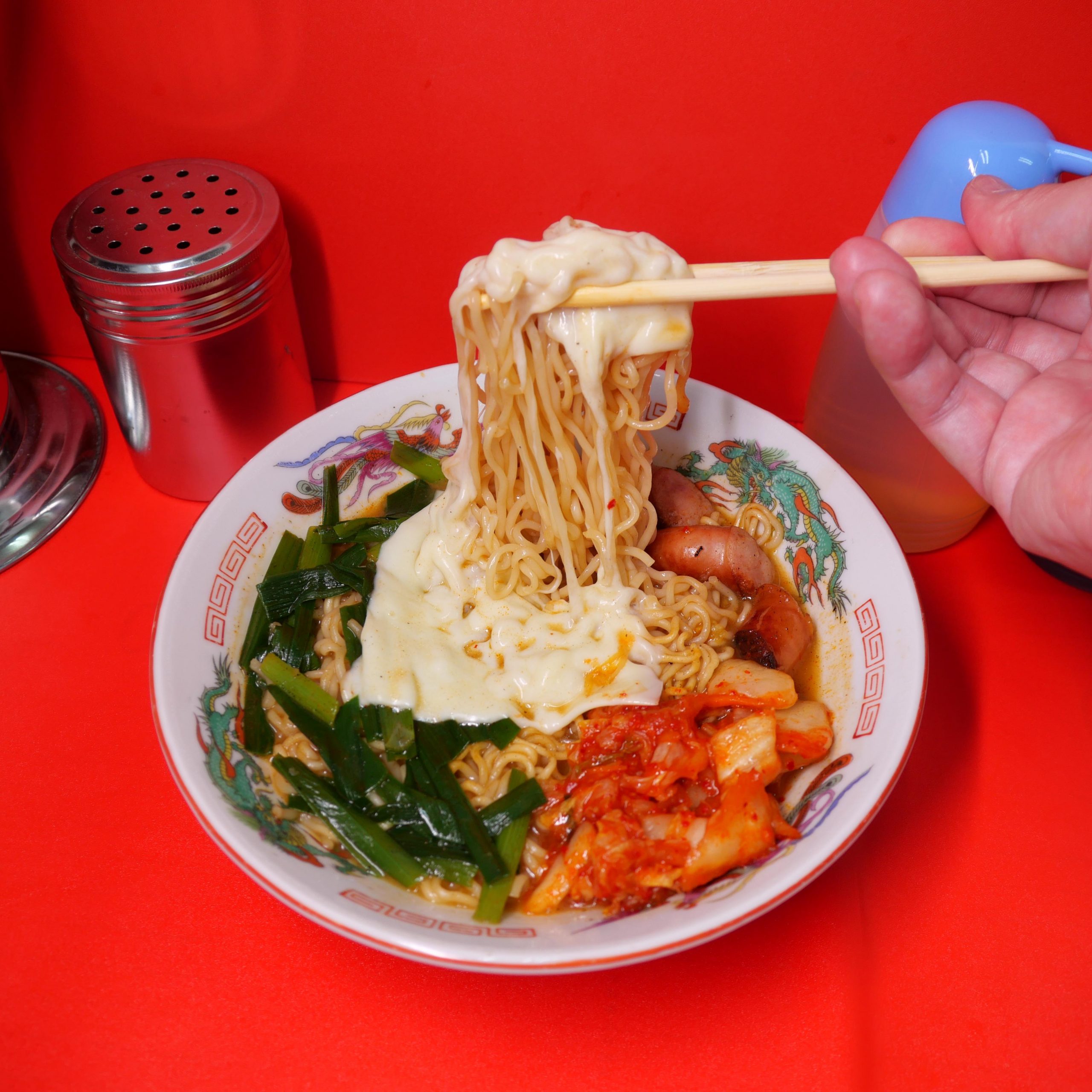 なんということでしょう♪ 深紅のスープに浮かぶスライスチーズがトロトロにとろけて、なんとも甘美で優美で艶美ではありませんこと? どうお思いですか? 皆さんも、この美しき辛旨プデチゲ風ラーメンの姿に、感動したのではありませんこと? 人の心を薫りと美しさで、食べる前から感動させるラーメン、ステキでございますわね。