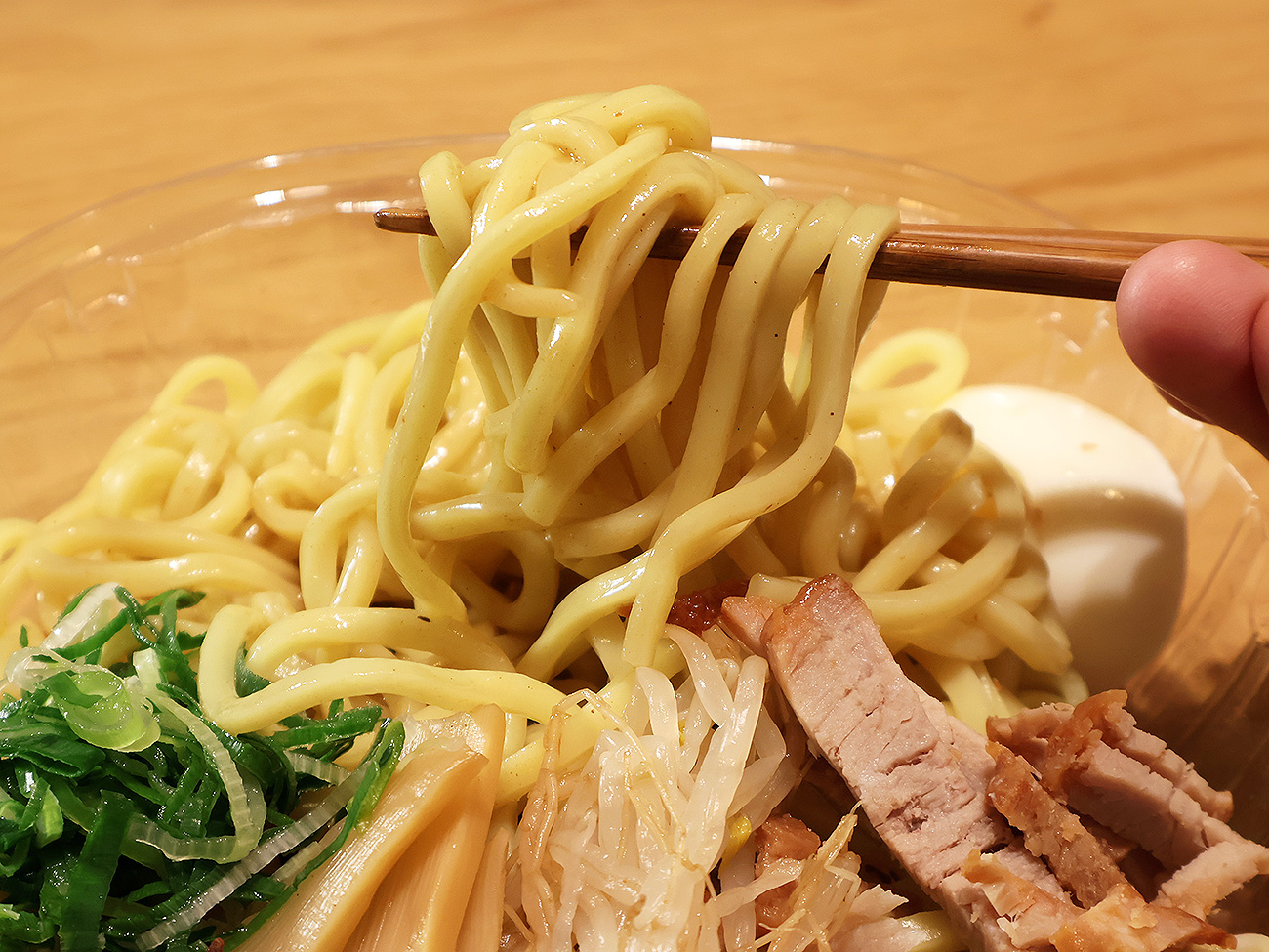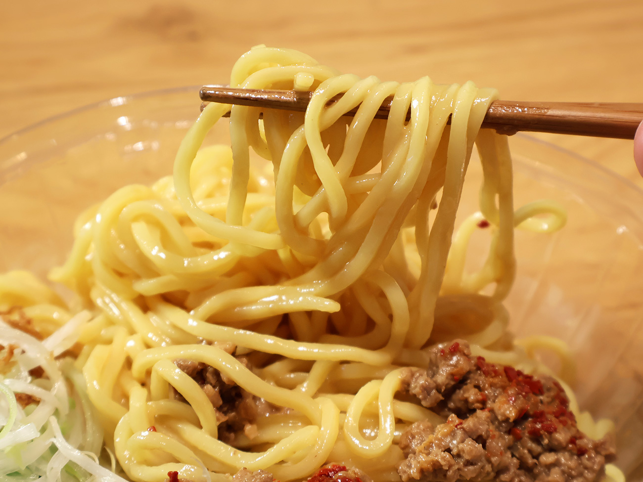 具材の構成は「頑者監修 冷し魚介豚骨まぜそば」とよく似ていて、チャーシューが肉そぼろと入れ替わっているだけ。こういうところでコストを抑えているのでしょう。麺は中太麺で、これまた量が結構多めです。