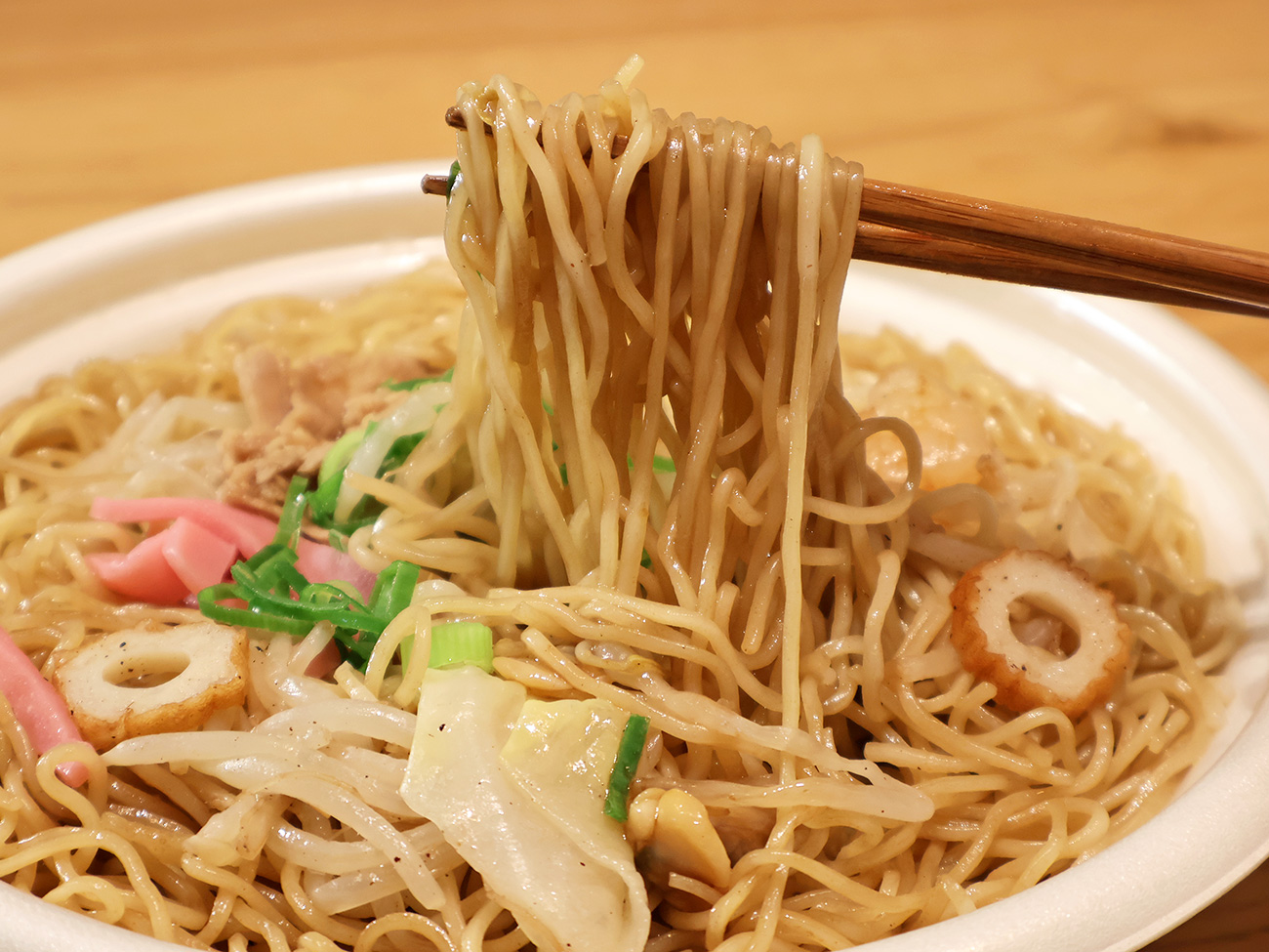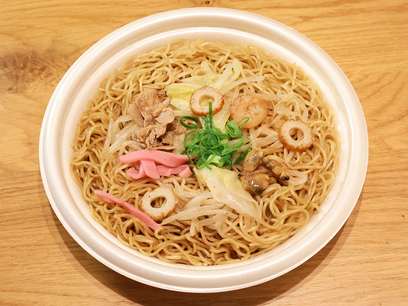 レンチンしてフタを開けてみると、思いのほか具材の種類が豊富でびっくり。豚肉、あさり、エビ、かまぼこ、ネギ、キャベツ、ちくわ、もやしあたりが確認できました。豪華です。