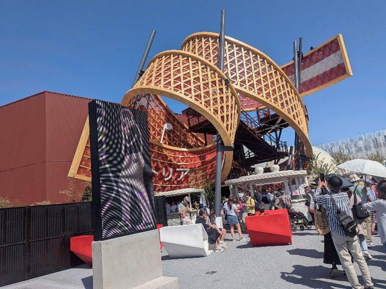 スペイン館は、階段の上部に行列ができていました。でも、大きなモニターに映像が上映され、待ち時間に観賞できました。このスペイン館や、モナコ館は、海洋の環境保護を大きなテーマの一つにしていて、自国の取り組みについて展示。それぞれセンスを感じさせましたが、お勉強的な展示を続けて見ると脳に疲労感が……。サステナビリティとかSDGsとか意識高い系の展示が多いです。
