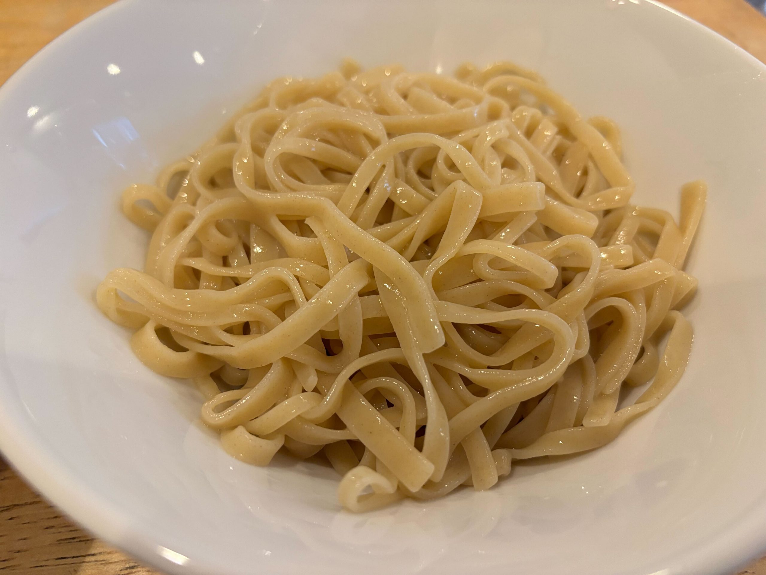 麺は平打ちのツルモチシコシコ麺。かなりのクオリティだ。讃岐うどんの乾麺でおなじみの、創業120年を誇る香川の老舗・石丸製麺の自信作だ。みずみずしさ、コシ、食感含めてパーフェクトに近い麺で、素晴らしい仕上がりだ。