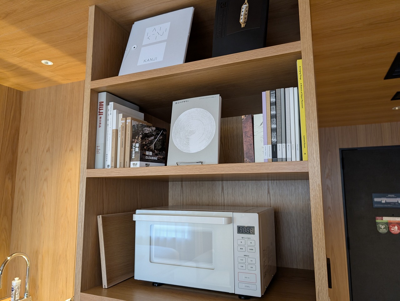 そして棚には、「MUJI BOOKS」による自社出版の本や選書も備えています。部屋には無印良品の「アロマオイル&ディフューザー」も設置され、うるおいと香りのリラクゼーション効果で心休まる空間になっています。
