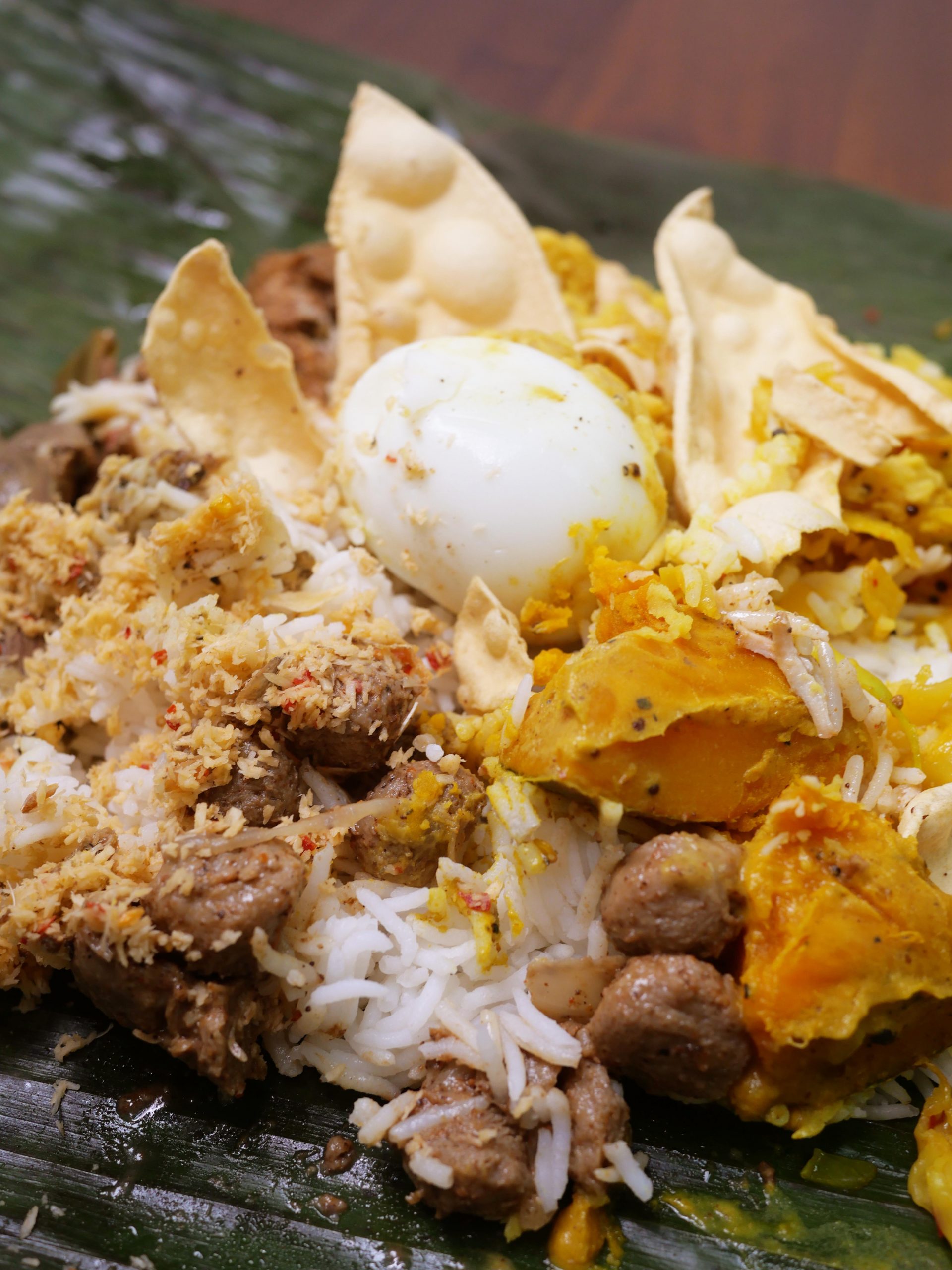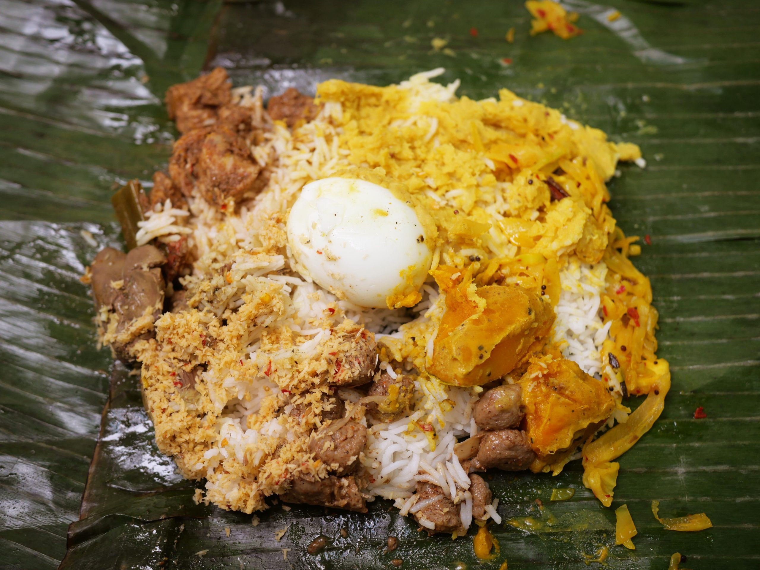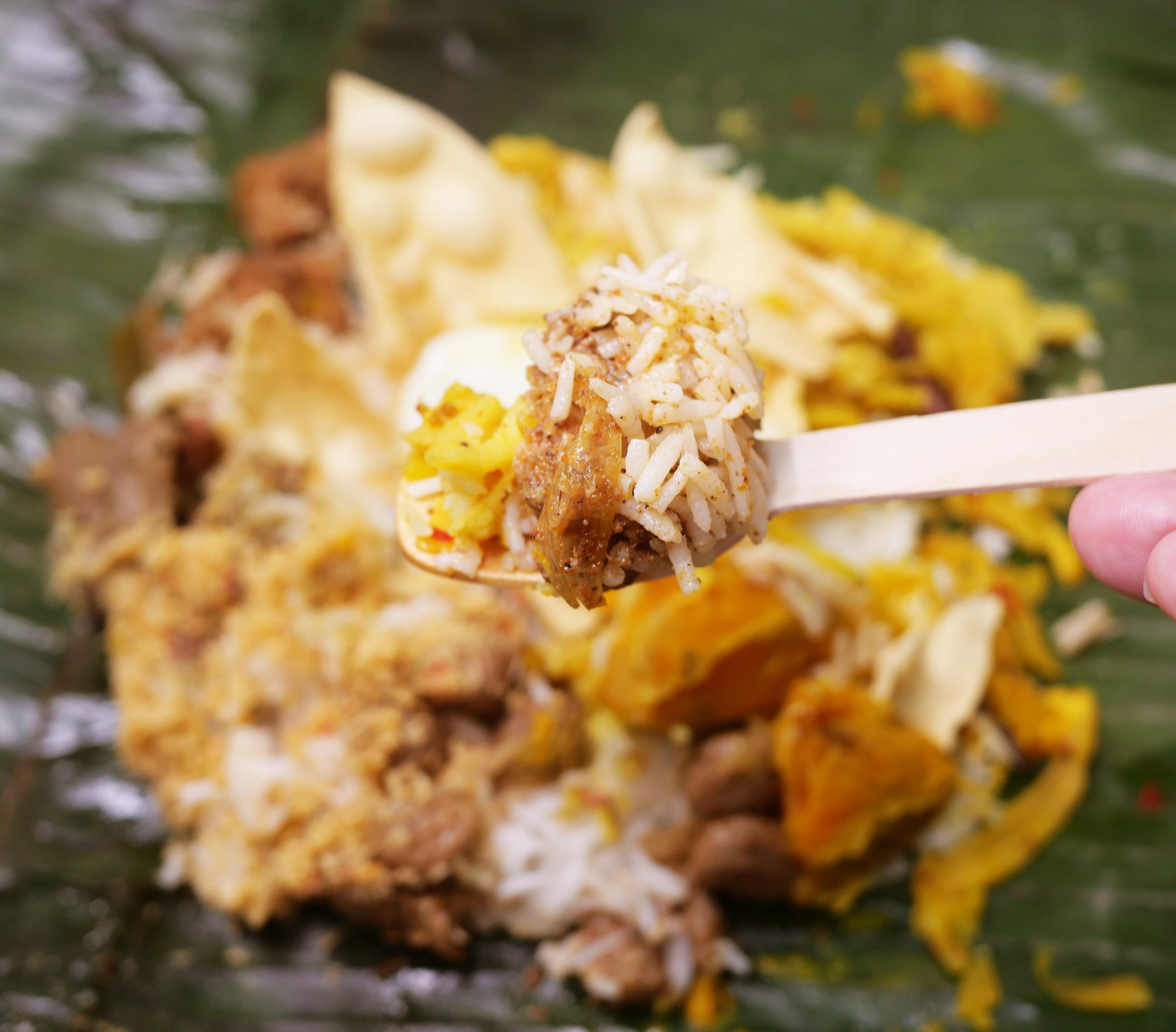 バナナリーフで包んだスリランカ料理の弁当がウマいよ。スリランカ料理専門店「アキフーズ」で買えるよ。1200円だよ。うまいやつだよ。肉、野菜、穀物、玉子、スパイス、いろいろマゼマゼにして食べるよ。パリパリのパパド的な菓子をのせて完成形になるよ。うまいやつだよ。 pic.twitter.com/wMXf1mfeHR
