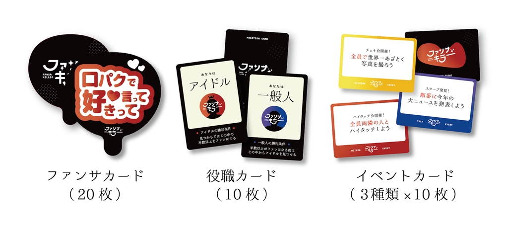 初心者でも遊びやすい簡単なルールと、いつファンサされるかわからないドキドキの心理戦がこのゲームの特徴。また、うちわ型のファンサカードなど、思わず写真を撮りたくなるようなデザインも魅力だ。パーティーやオフ会、さらには生配信でも楽しめる。