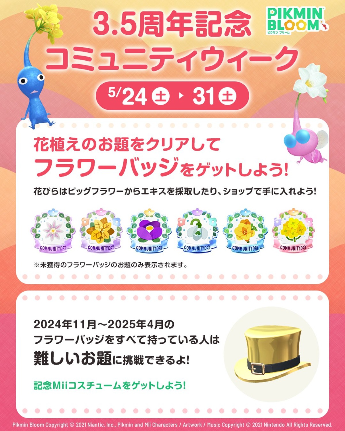 3.5周年記念のMiiコスチューム“シルクハット・黄金”が獲得できる難しいお題は、今回対象となる6種類のフラワーバッジを持っているプレイヤーにのみ発生。