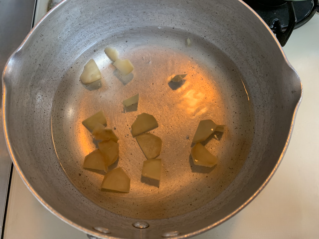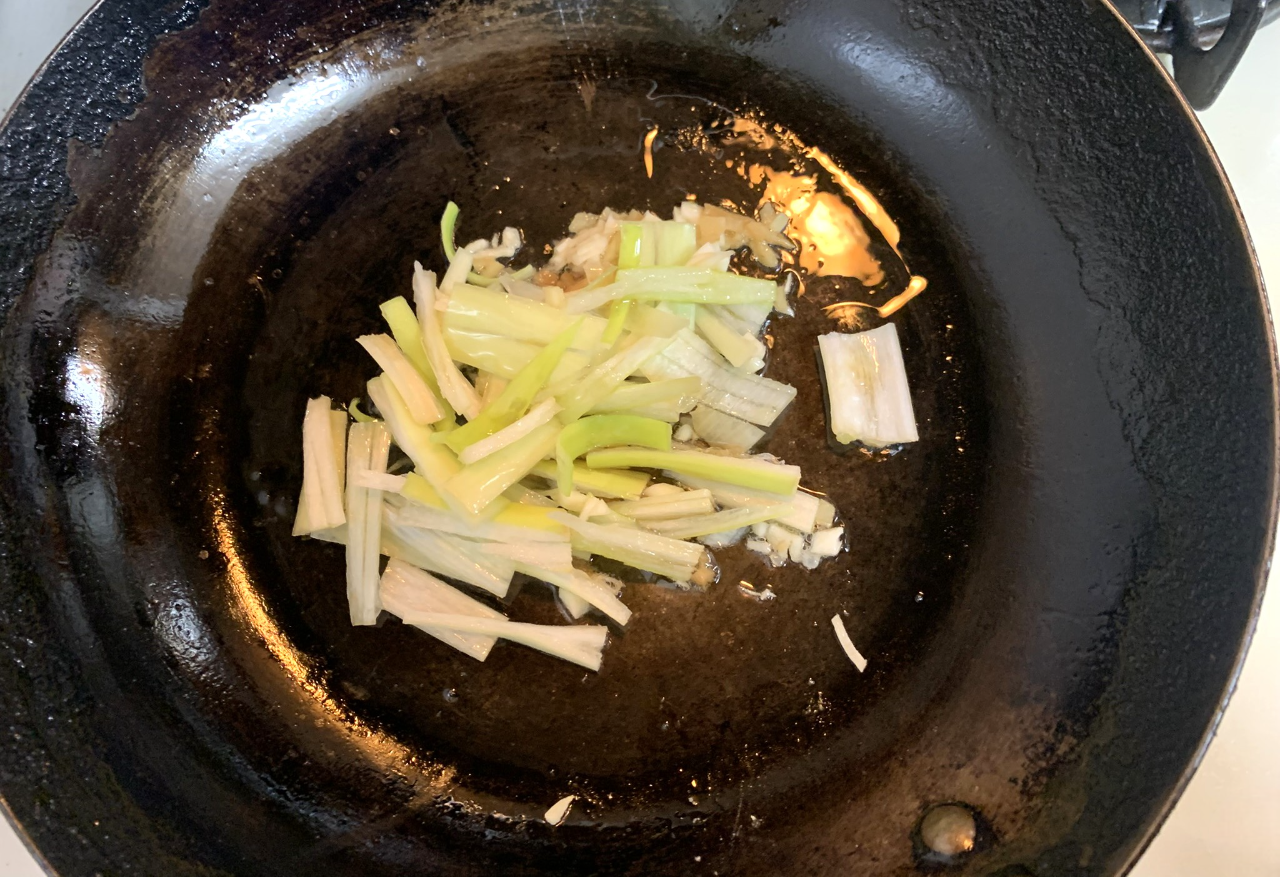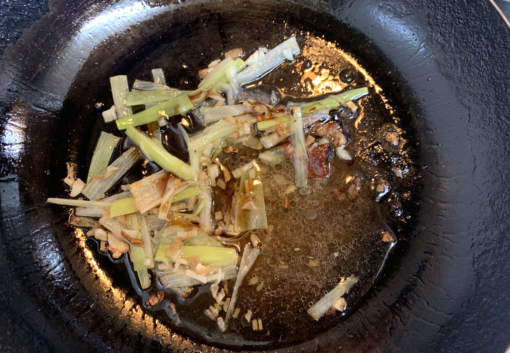 まずはニンニク・生姜のみじん切りとネギ細切りをごま油で香りが出るまで炒めます。