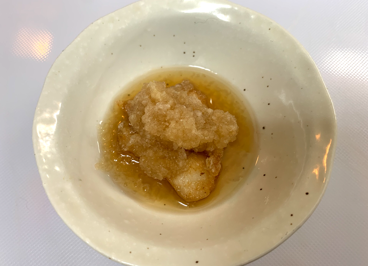 みぞれ出汁をかけたらどうだろうか? ってことで、白だし、醤油、砂糖、みりん、酒、臭み消し用の酢少々を煮詰めたものに、大根おろしをすりおろし汁ごと加えたみぞれ出汁をかけて頂きます。
