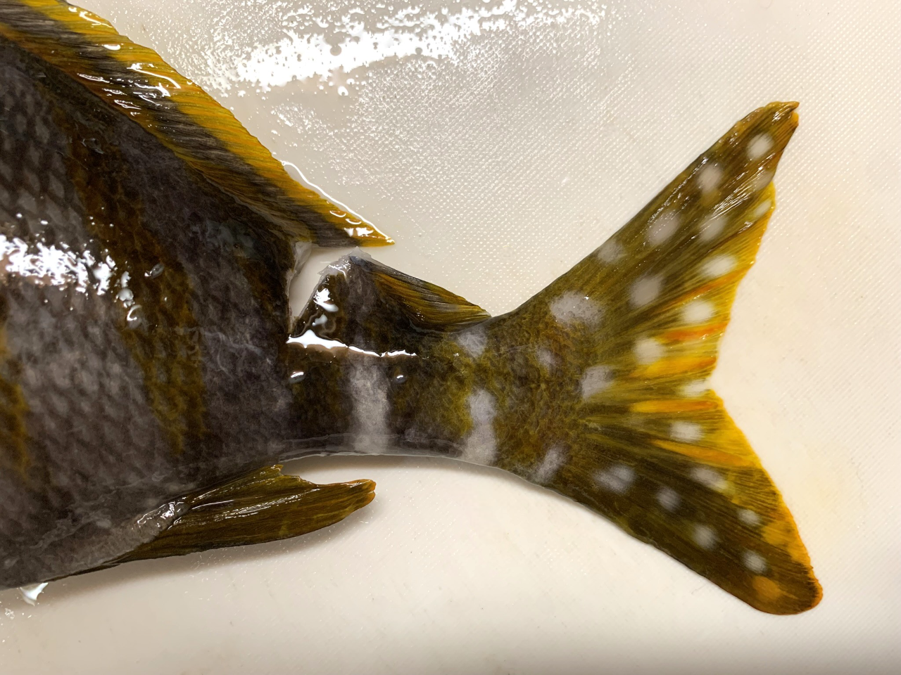いちばんの特徴は尻尾の白い水玉模様でしょうか。この尾の模様が鷹の羽に似ていることから「鷹羽鯛(タカノハダイ)」と名付けられたようです。