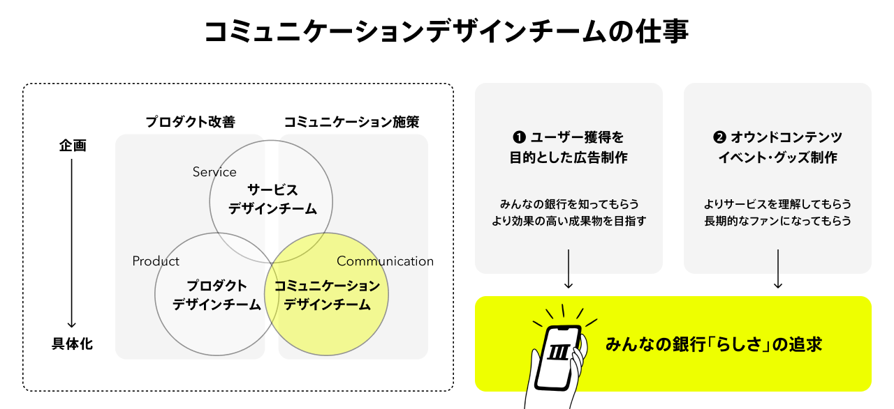 コミュニケーションデザインチームは、クリエイティブの力で、ユーザーにサービスの魅力を伝え「みんなの銀行」のファンを創る組織です。