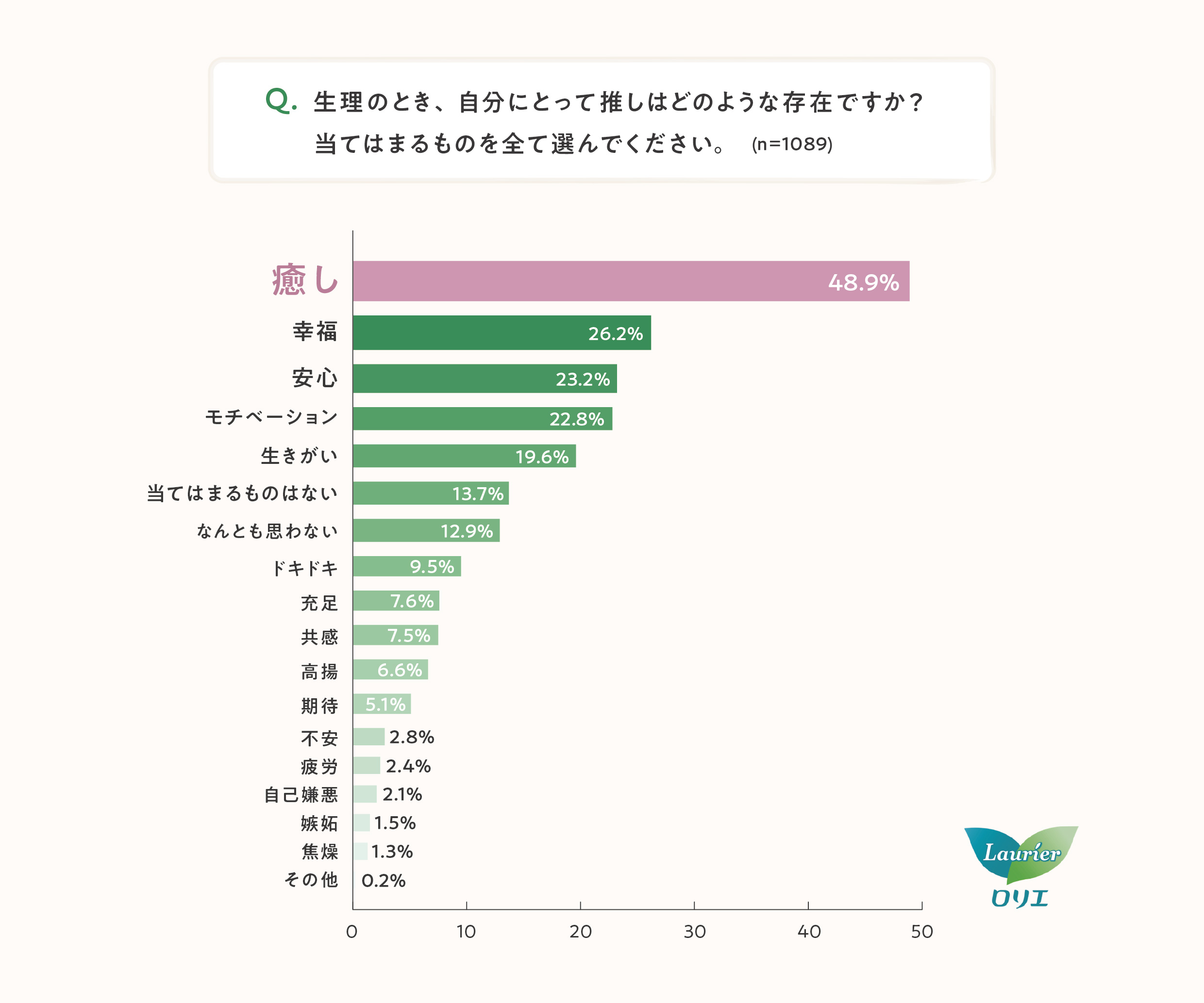 「ロリエ」の調査結果によると、生理期間中に「推し」はどのような存在か?という質問において、全体の約半数(48.9%)が「癒し」と回答されたそう。