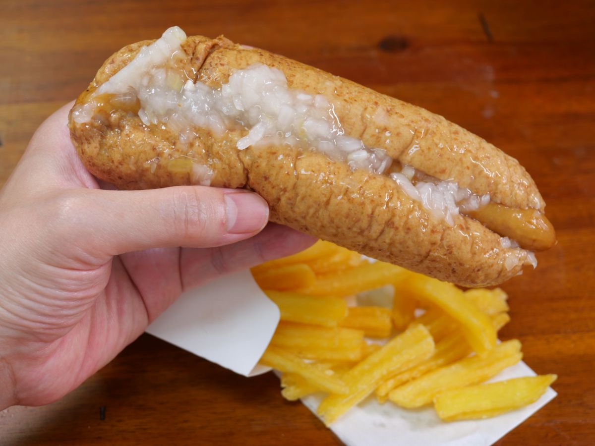 かなり弾力があるタイプだった。パンが。オニオンドッグの。トロリとしたタイプ。オニオンが。オニオンドッグの。ケチャップとマスタードかける。オニオンは塩味強め。つまり全体的にパワフルな塩味。だがそれがいい。受け止めるパンがいい。香ばしいパンだから。穀物感ある。オニオンドッグいいぞ。
