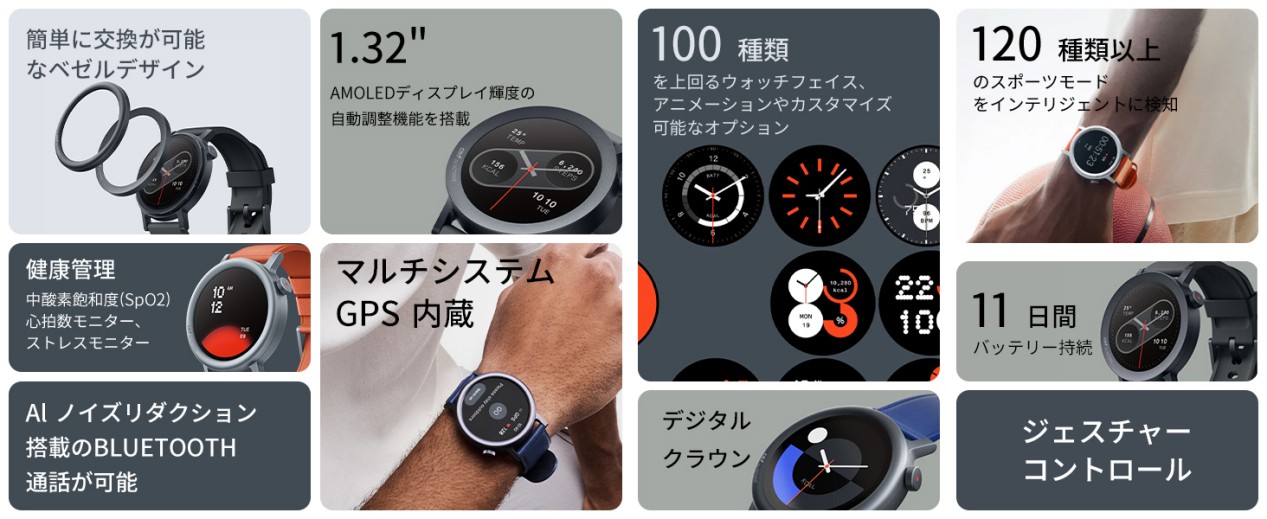 1.32インチの高解像度AMOLEDディスプレイを搭載。明るい屋外でも視認性抜群で、常時表示モード(AOD)にも対応。天気・歩数・通知・心拍など、必要な情報を一目で確認可能です。