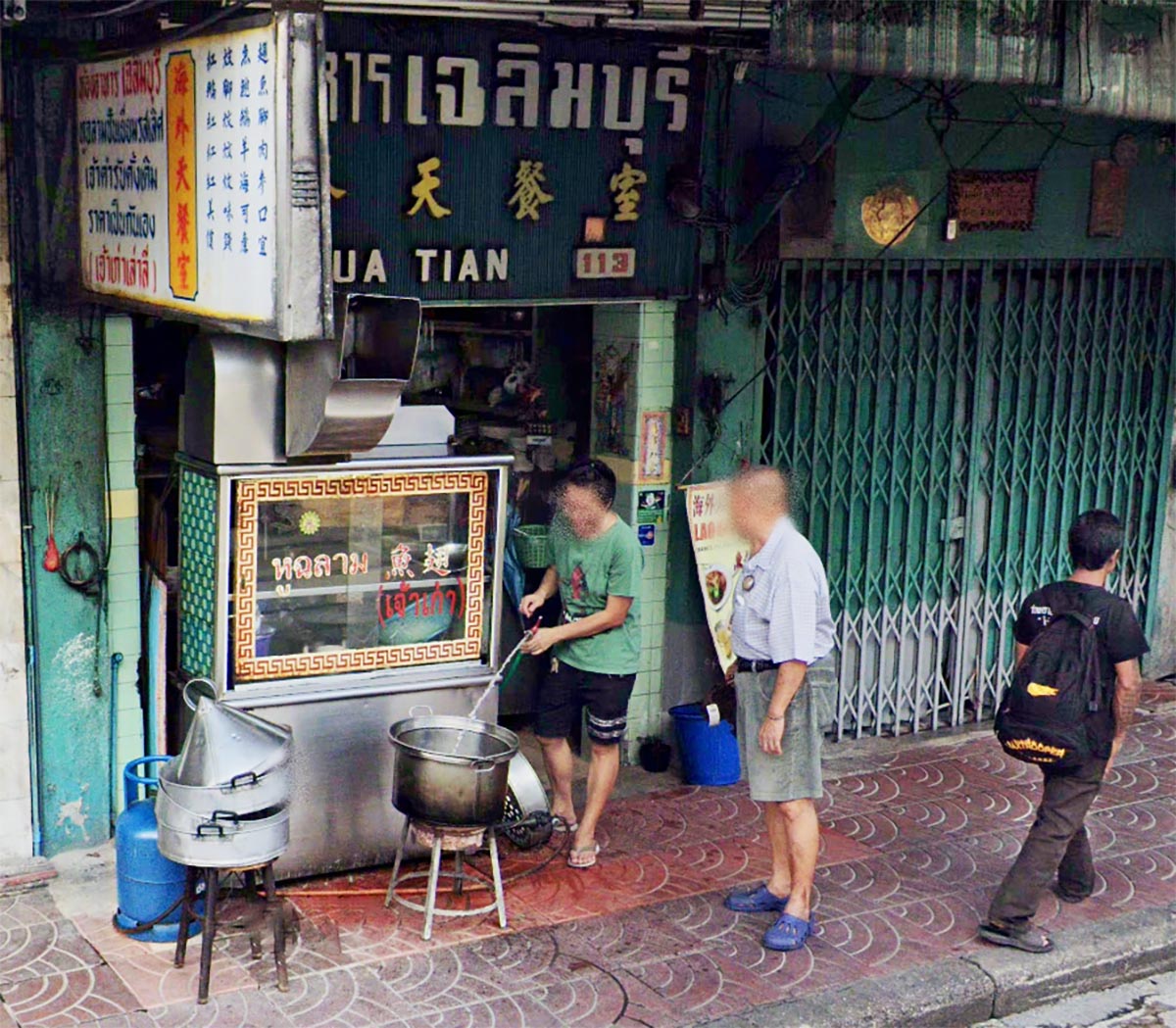 その食堂の描写には、タイ語と中国語が確認できる。雰囲気からしてタイの食堂のように見えるが、事実、タイの食堂がモデル店だったようだ。その店名は「Hai Hua Thian / チャラームブリー」(113, 115 Song Sawat Rd, Samphanthawong, Bangkok)で、タイの首都・バンコクに存在していた食堂だ。