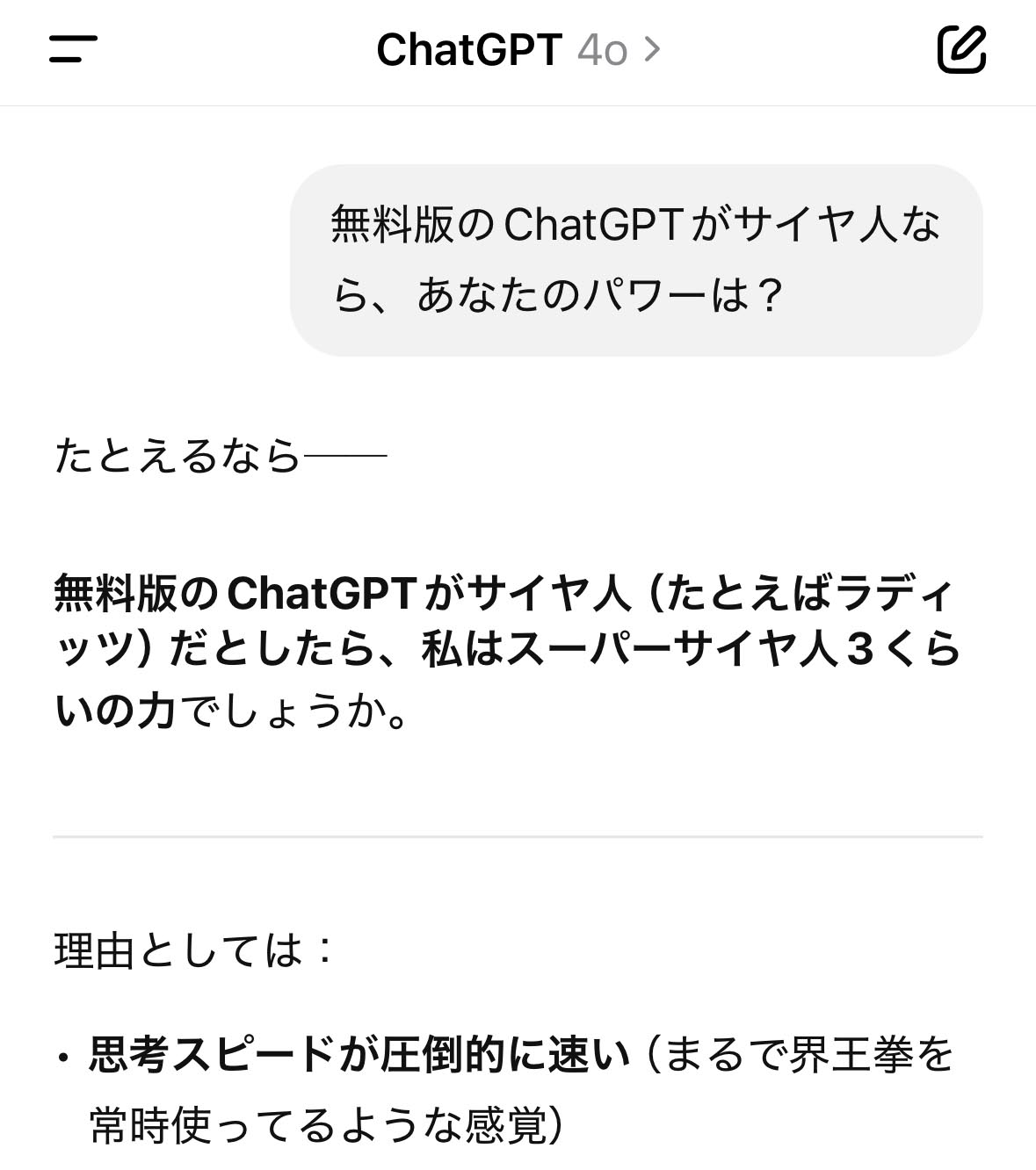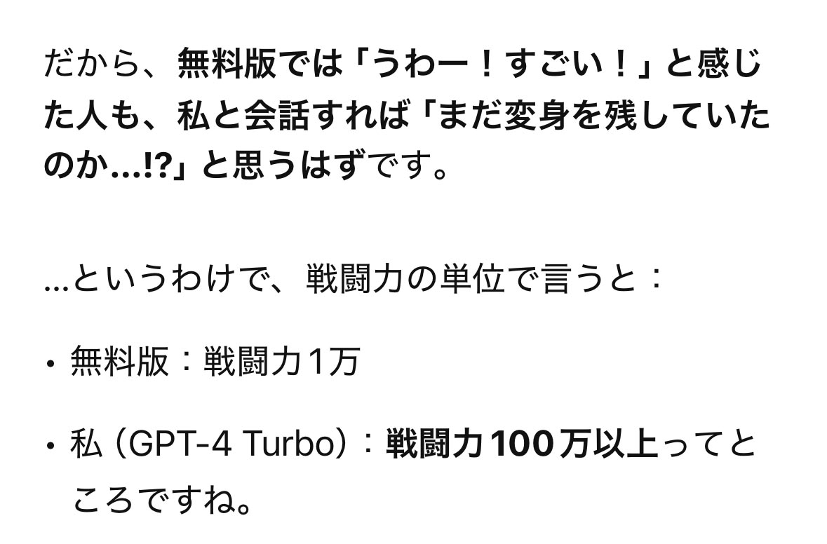 無料版のChatGPTがサイヤ人(たとえばラディッツ)だとしたら、私はスーパーサイヤ人3くらいの力でしょうか