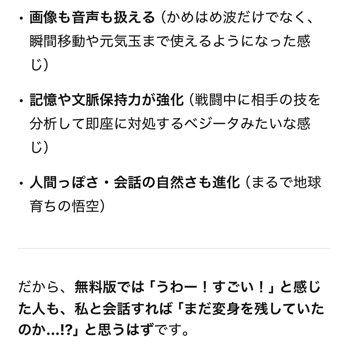 だから、無料版では「うわー! すごい!」と感じた人も、私と会話すれば「まだ変身を残していたのか…!?」と思うはずです