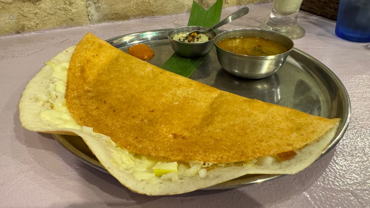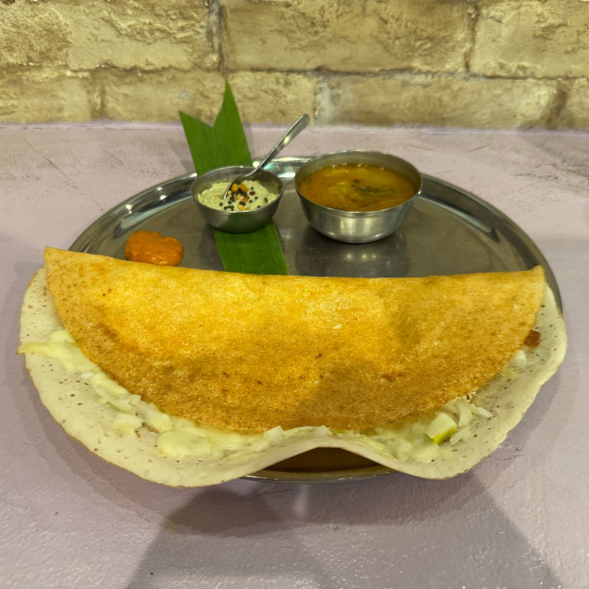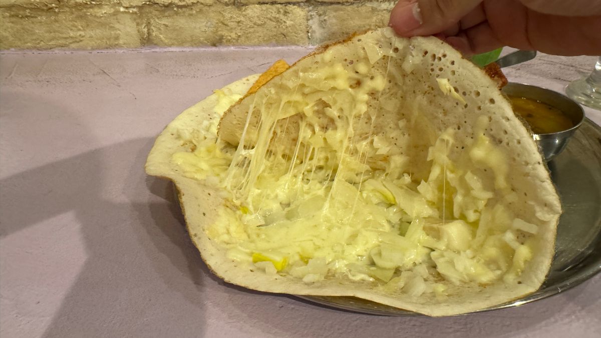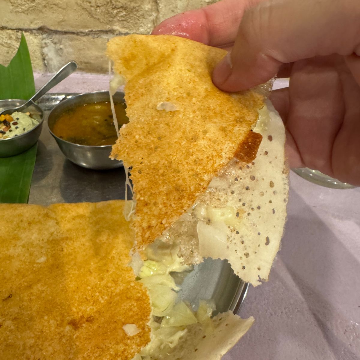 目の前にやってきたオニオンチーズドーサは極めて心を躍らせるもの。しっかりとキツネ色に焼かれたドーサ。折りたたまれているので、それをめくってみると、その中には刻まれたオニオンと、とろけるチーズがたっぷりとサンドされていました。その時点で優勝間違いなしのドーサ。