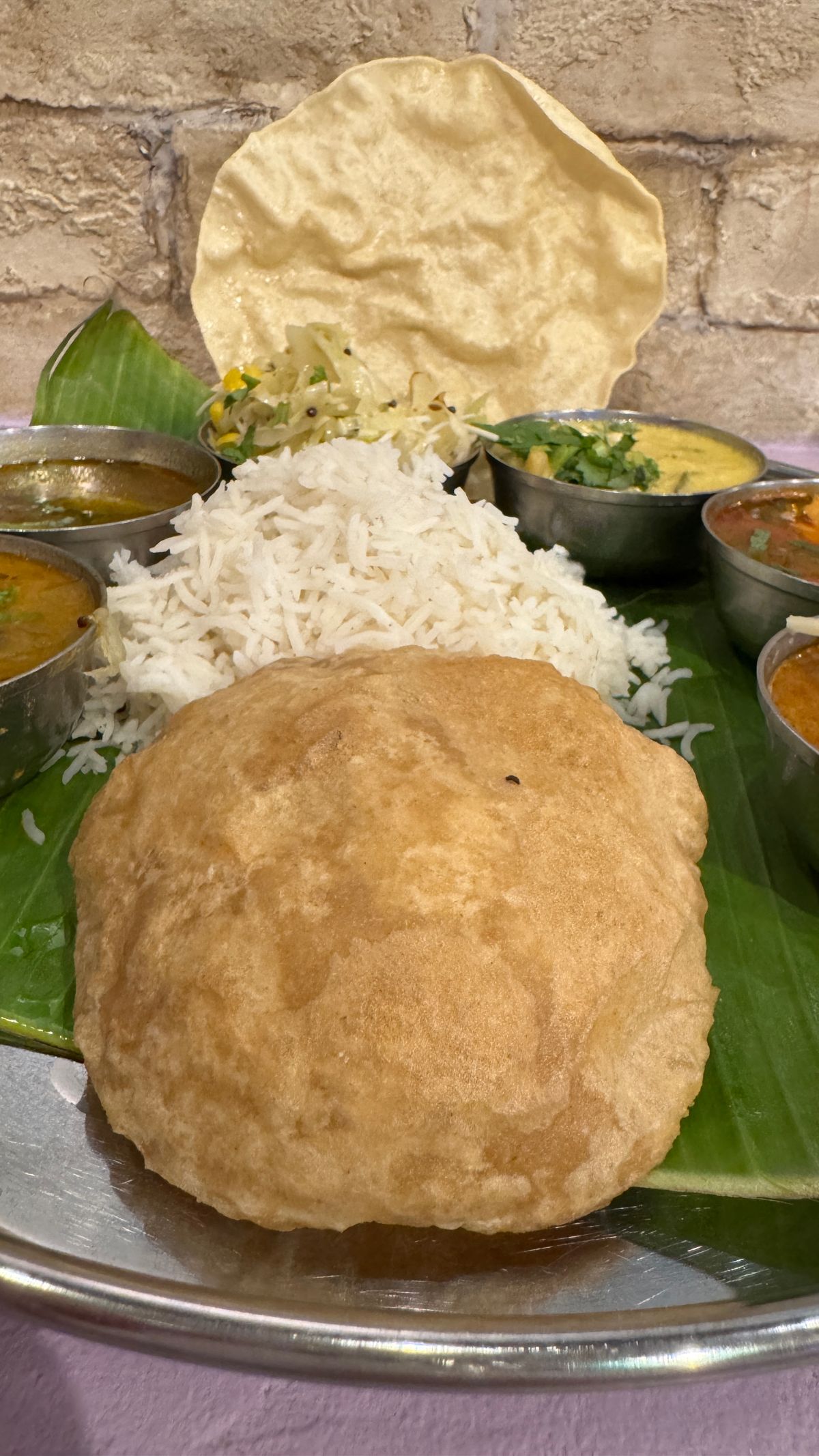 オニオンチーズドーサを食べ終えると、バワンミールスがやってきました。おおっ! これはリッチなインド盛り合わせ料理なゴージャス感。最初はカレーをひとつひとつ楽しみつつ食べ進めます。あぁ、スパイスが濃くて「これはよいものだ」。パンはバトゥーラというもので、薄生地の揚げパン。油シミシミの生地が現地感あって良いです。うまい。
