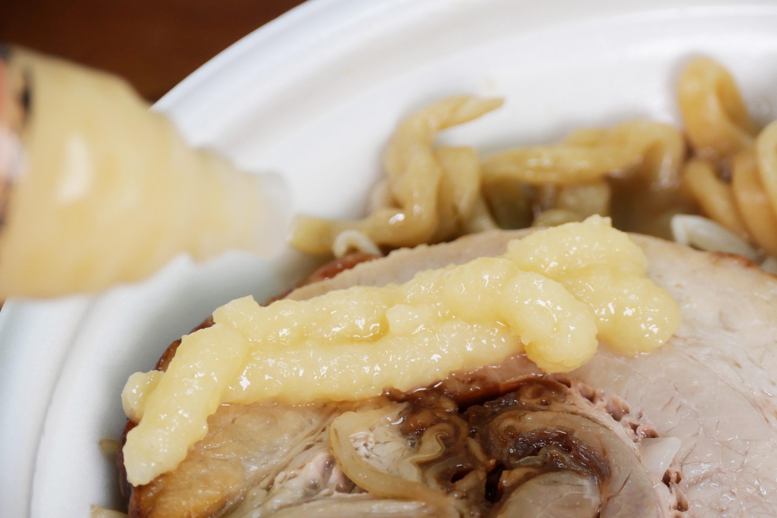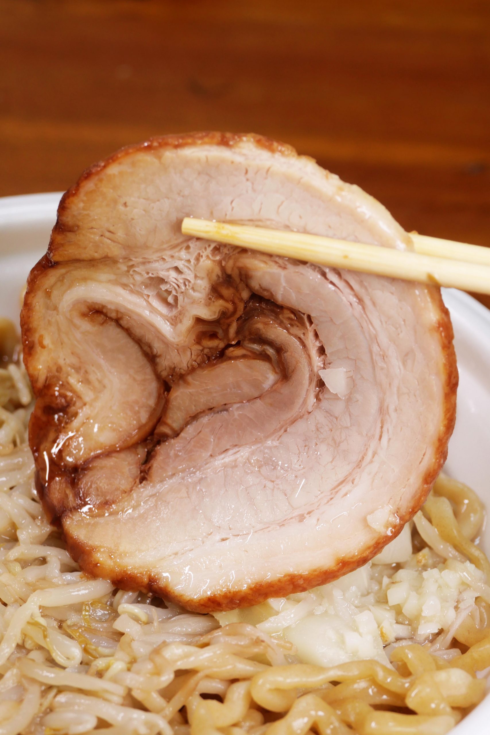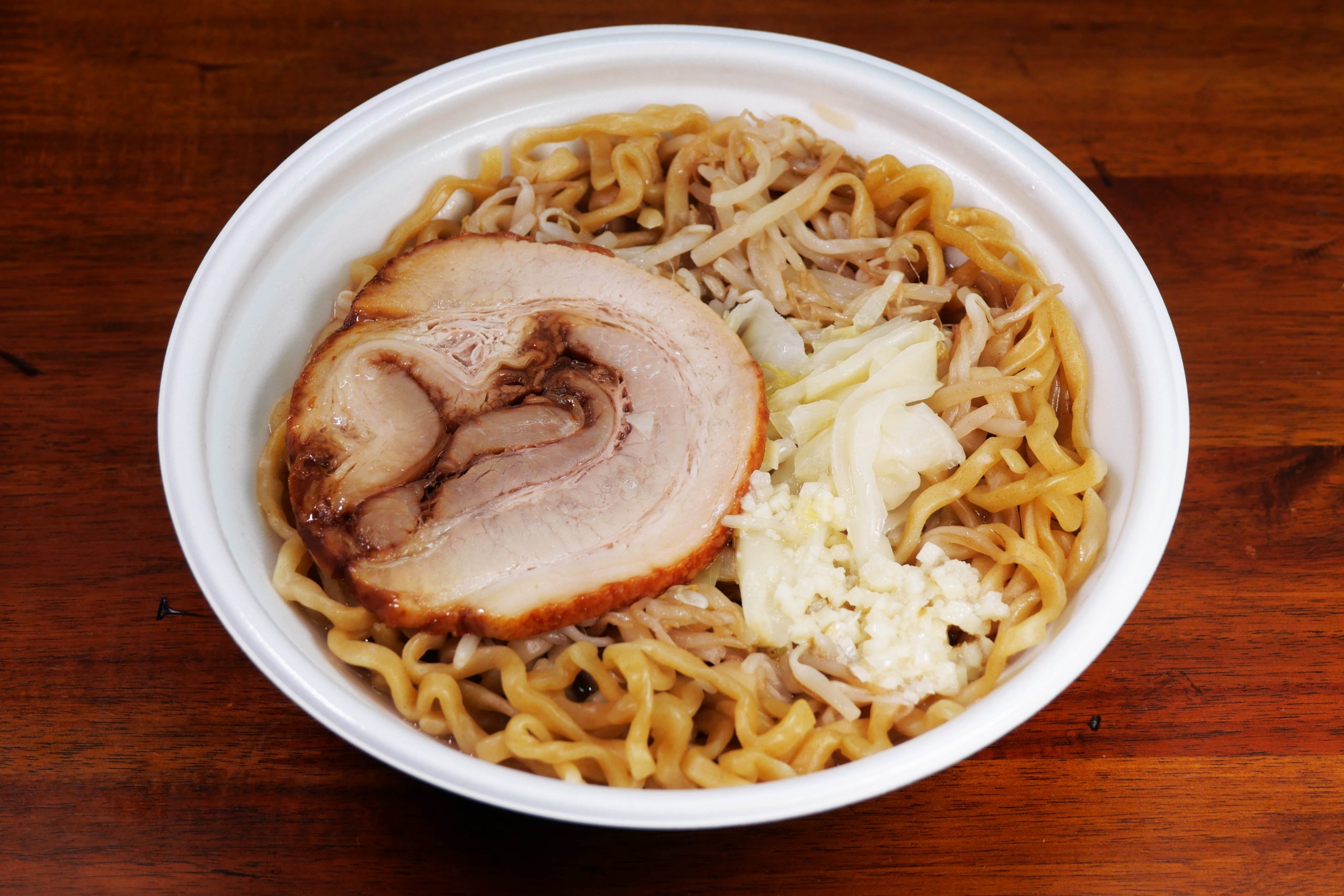 巨大なブタとゴワゴワ麺に特化した振り切れ感が潔くてGOOD。ラーメン二郎系のニンニク入りスープで、ブタをとことん楽しみ、ゴワゴワ麺をとことん楽しむ。まさにラーメン二郎の醍醐味であり、それを追求した感がある。ヤサイのボリュームが控えめだが、ブタとゴワゴワ麺に特化したのは間違いではないと思う。
