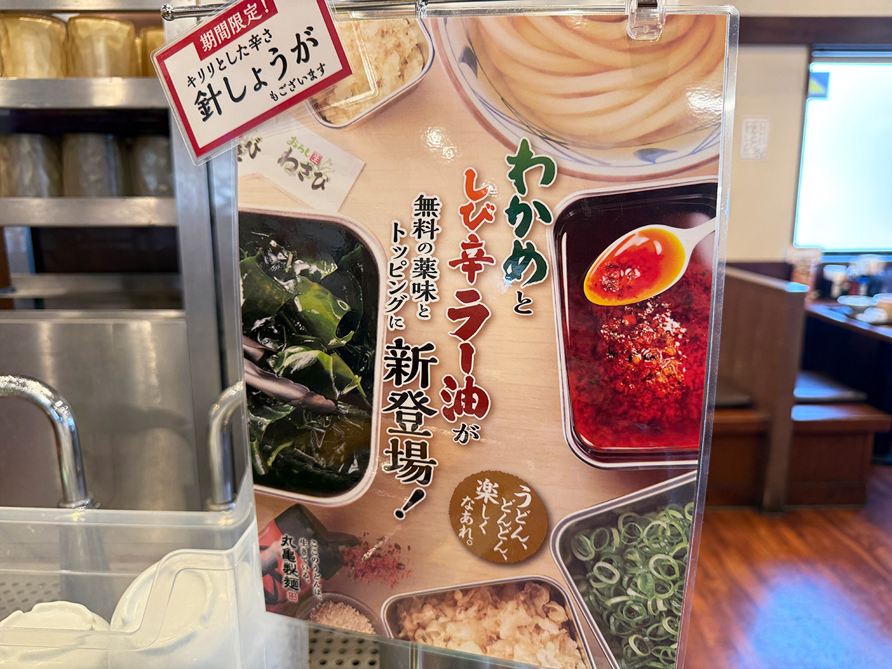 丸亀製麺は無料で使えるネギや天かすなどのトッピングが充実していますが、5月9日から新無料トッピングメニューとして「わかめ」と「しび辛ラー油」の2種が登場! 値上げばかりで辟易としてしまいそうな飲食業界に久々に入ってきた嬉しいニュースでした。