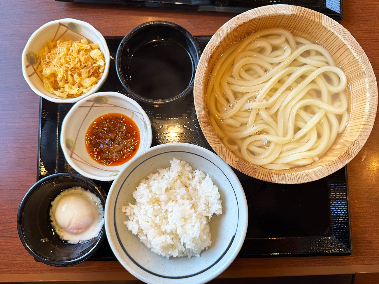 なのでベストの布陣は釜揚げうどん+ごはんを軸に、無料トッピングで天かすとしび辛ラー油。さらにできれば有料トッピングの温泉玉子(110円)もセットにしましょう!
