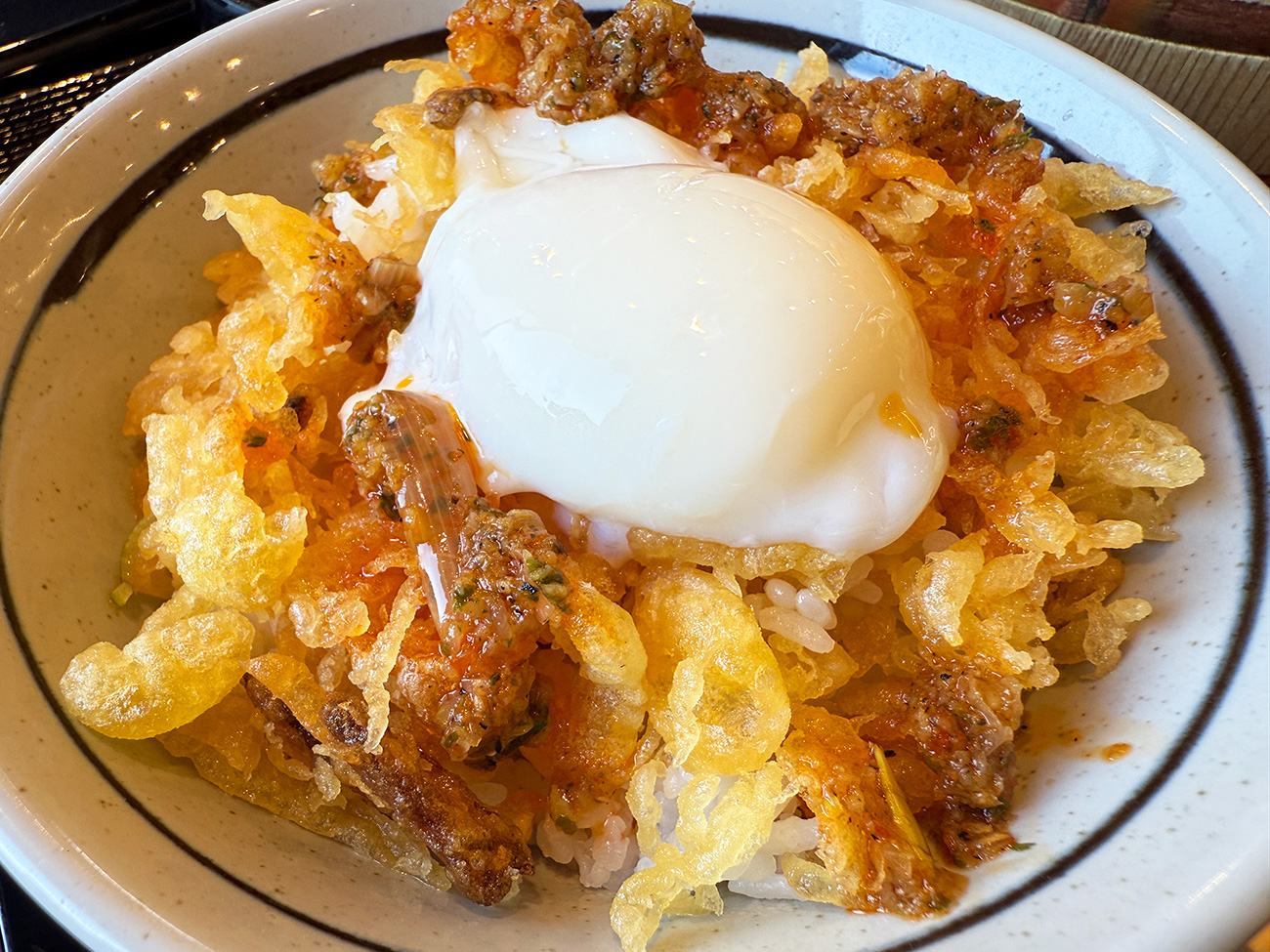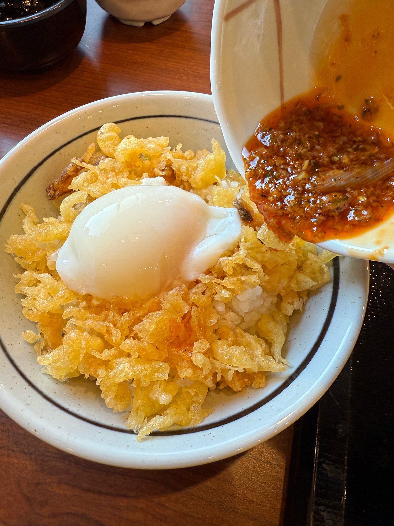そしてごはんの上にたっぷりと天かすを乗せたら中央に温泉玉子も置き、天かすの上からしび辛ラー油をたっぷりと!