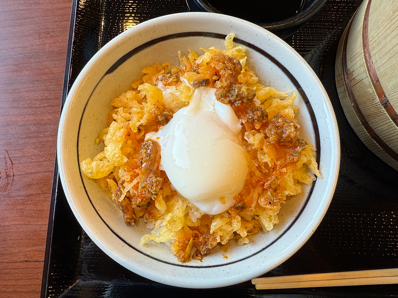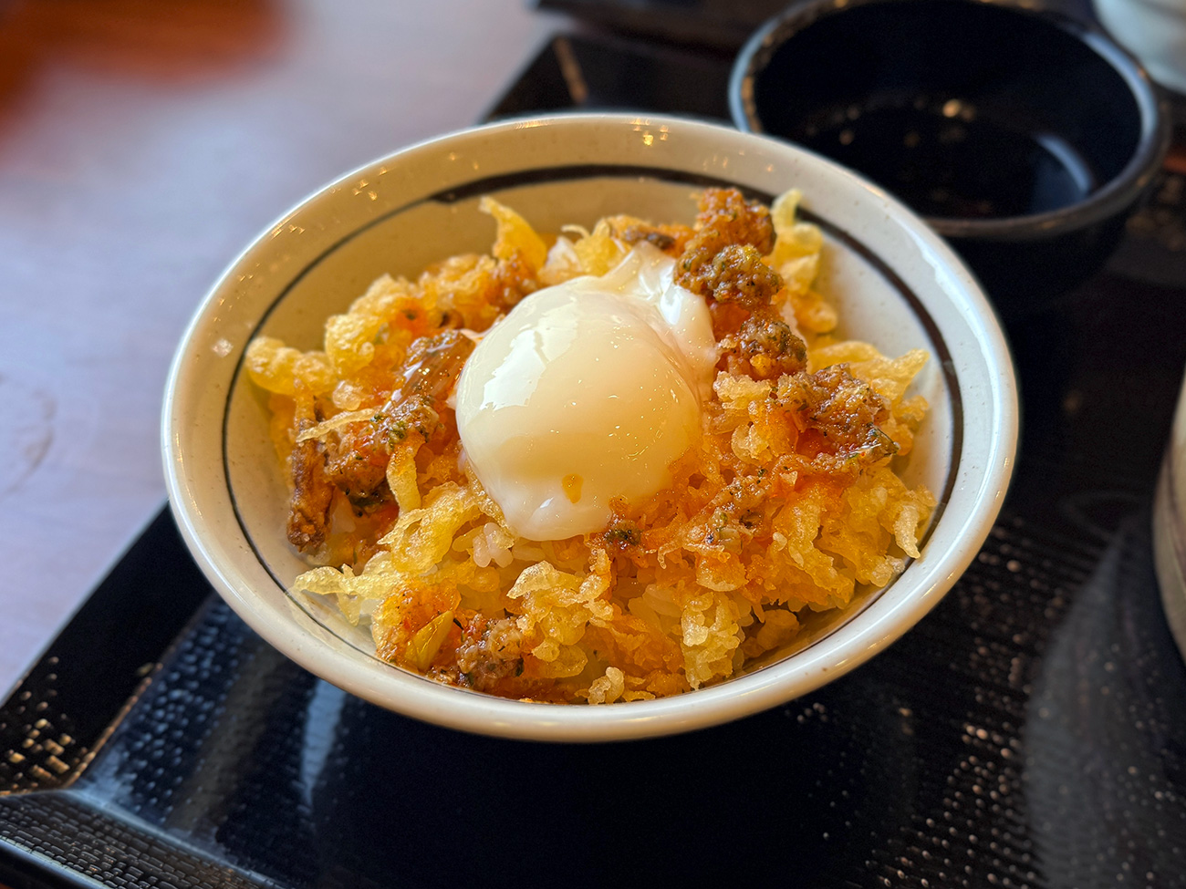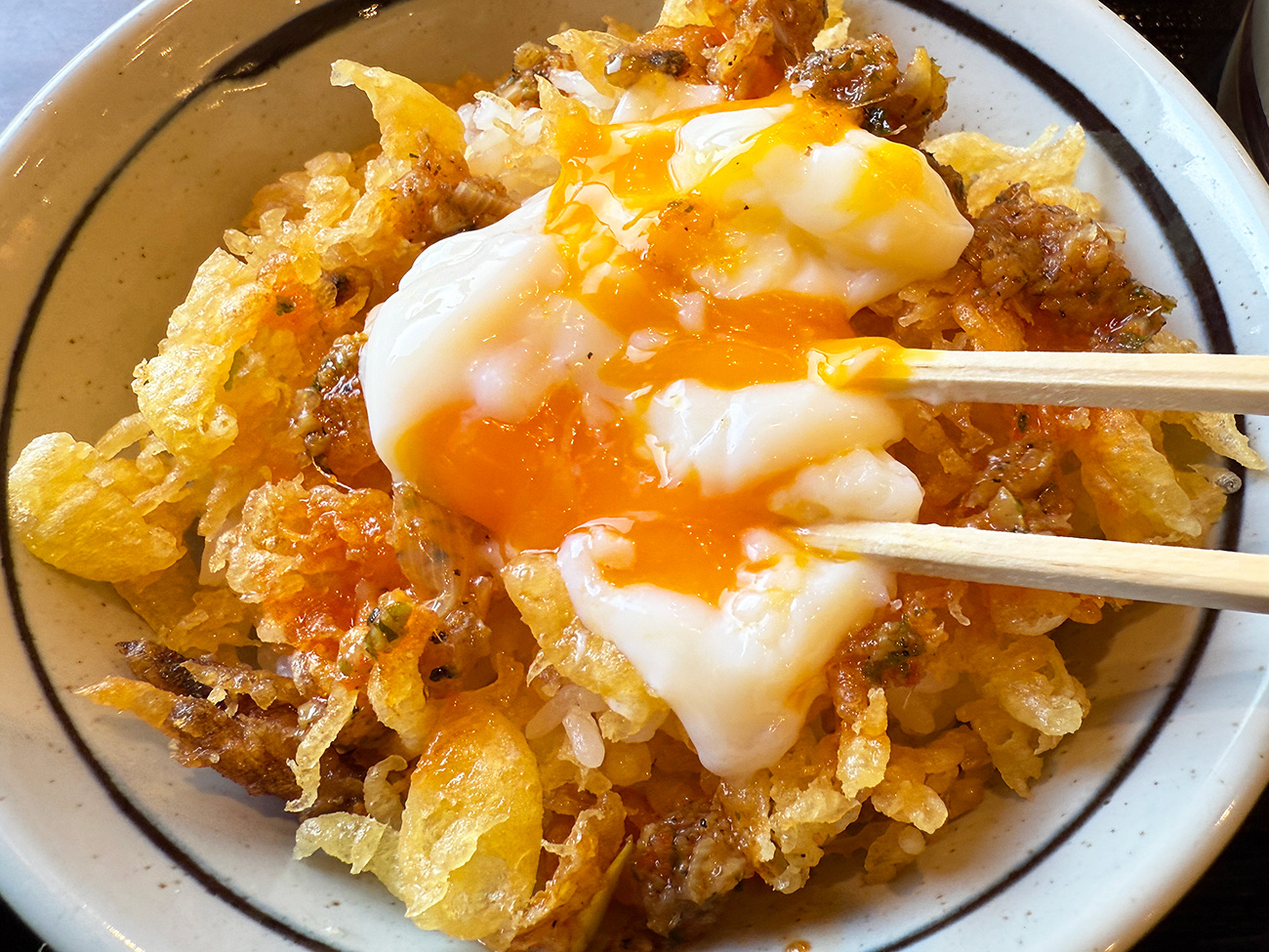 さらに、ここで釜揚げうどんのめんつゆを少し拝借して軽くかければできあがり。安く済ませたいなら無料の天つゆでもOKです。あとは半熟玉子を割って、全体を混ぜながら食べるだけ!