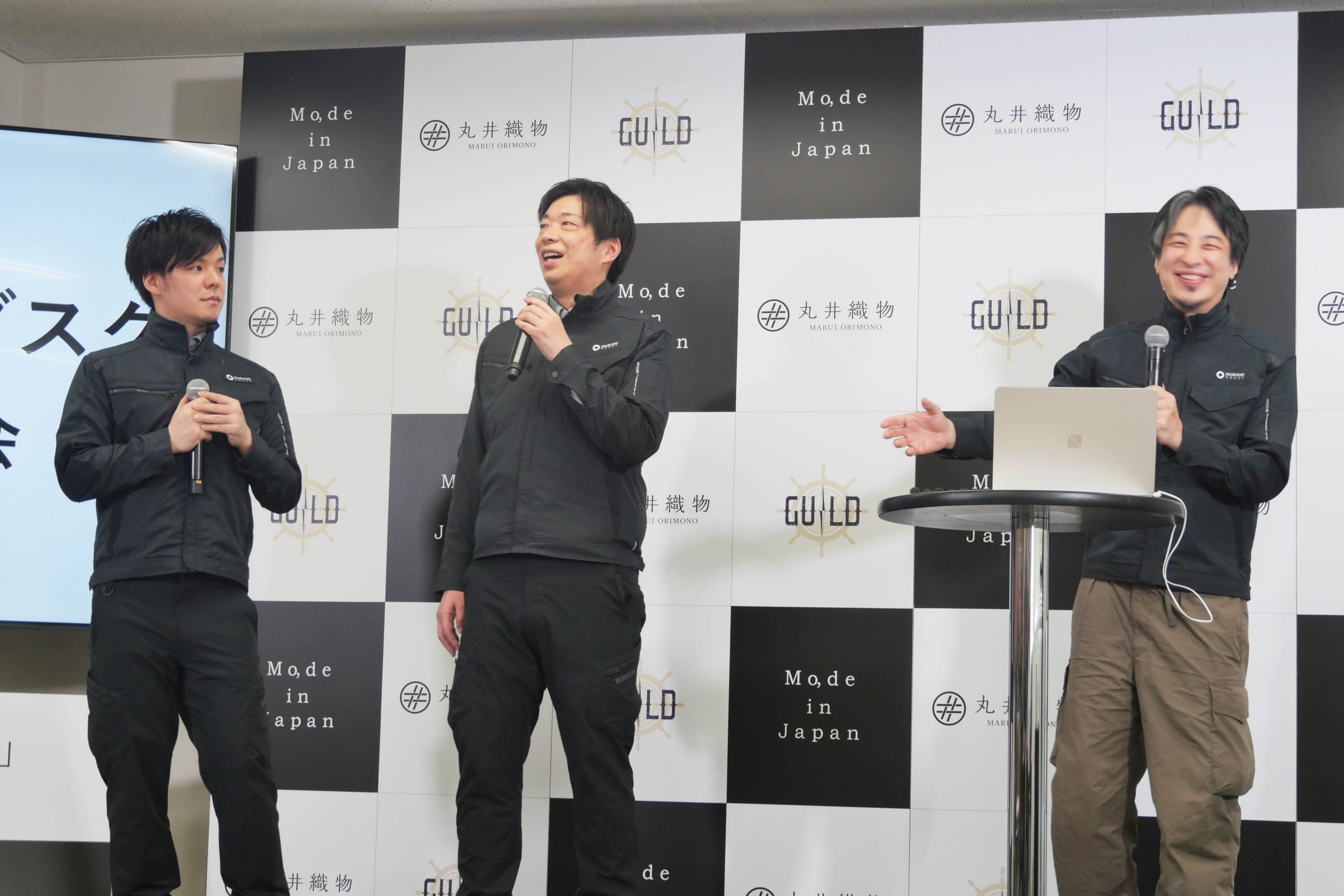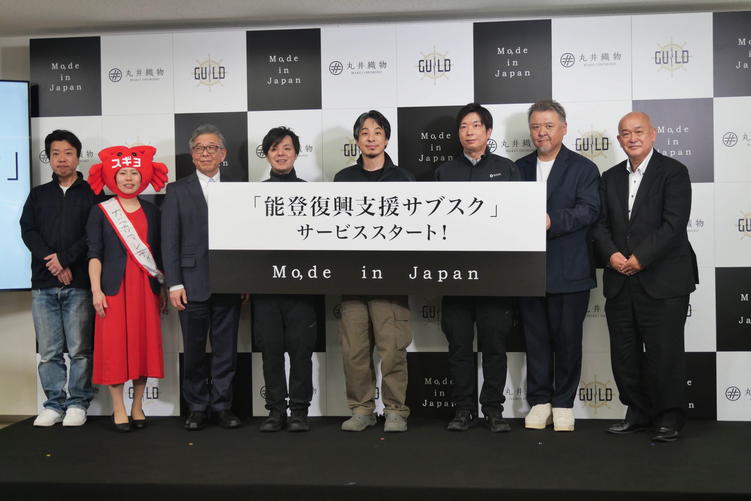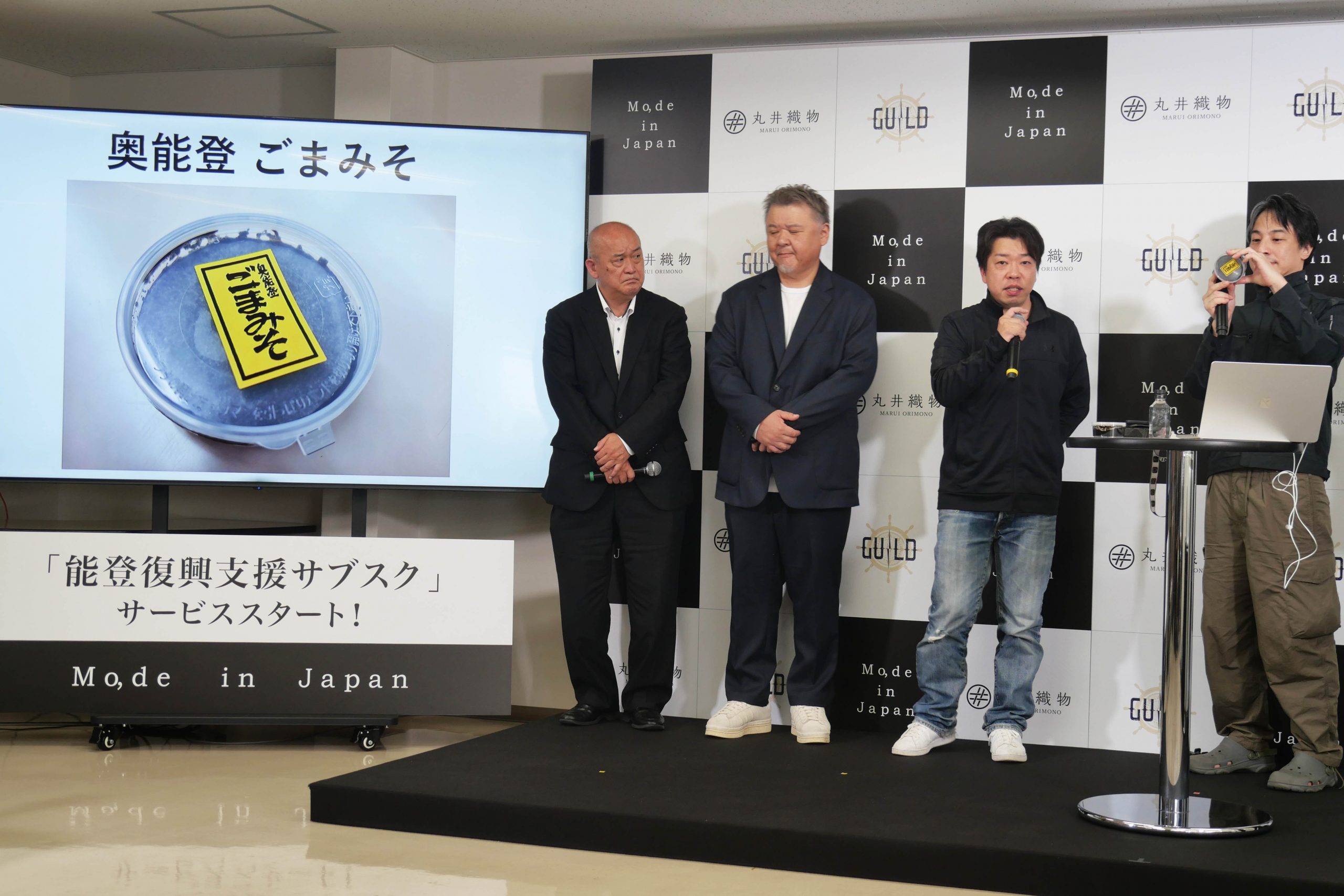 サービス発表会では、ひろゆきさんだけでなく、能登復興支援サブスクに携わる丸井織物株式会社の宮本智行さん、株式会社GUILDの高橋将一さんも登壇。MCはインターネット有名人のひげおやじさんが担当した。