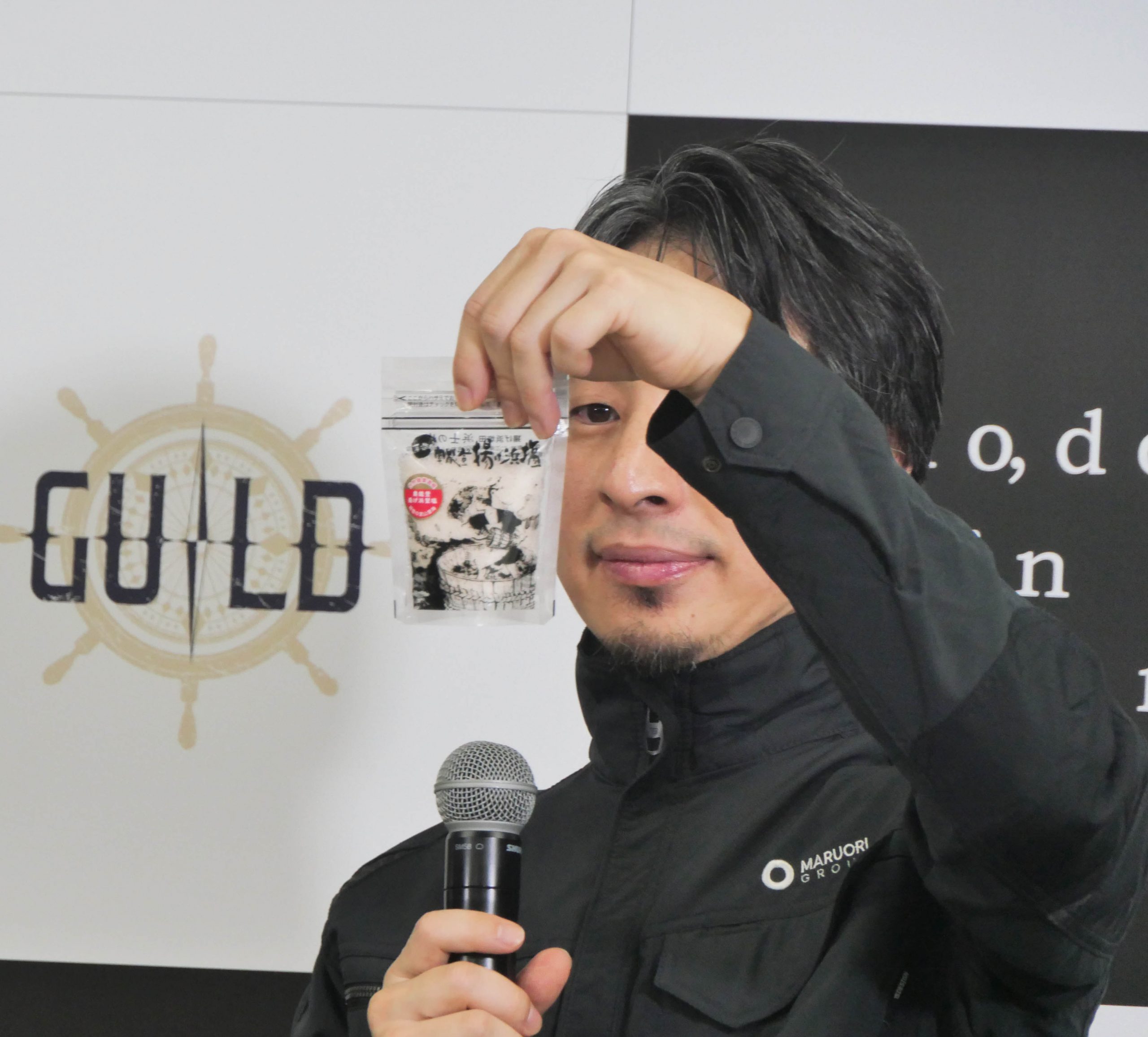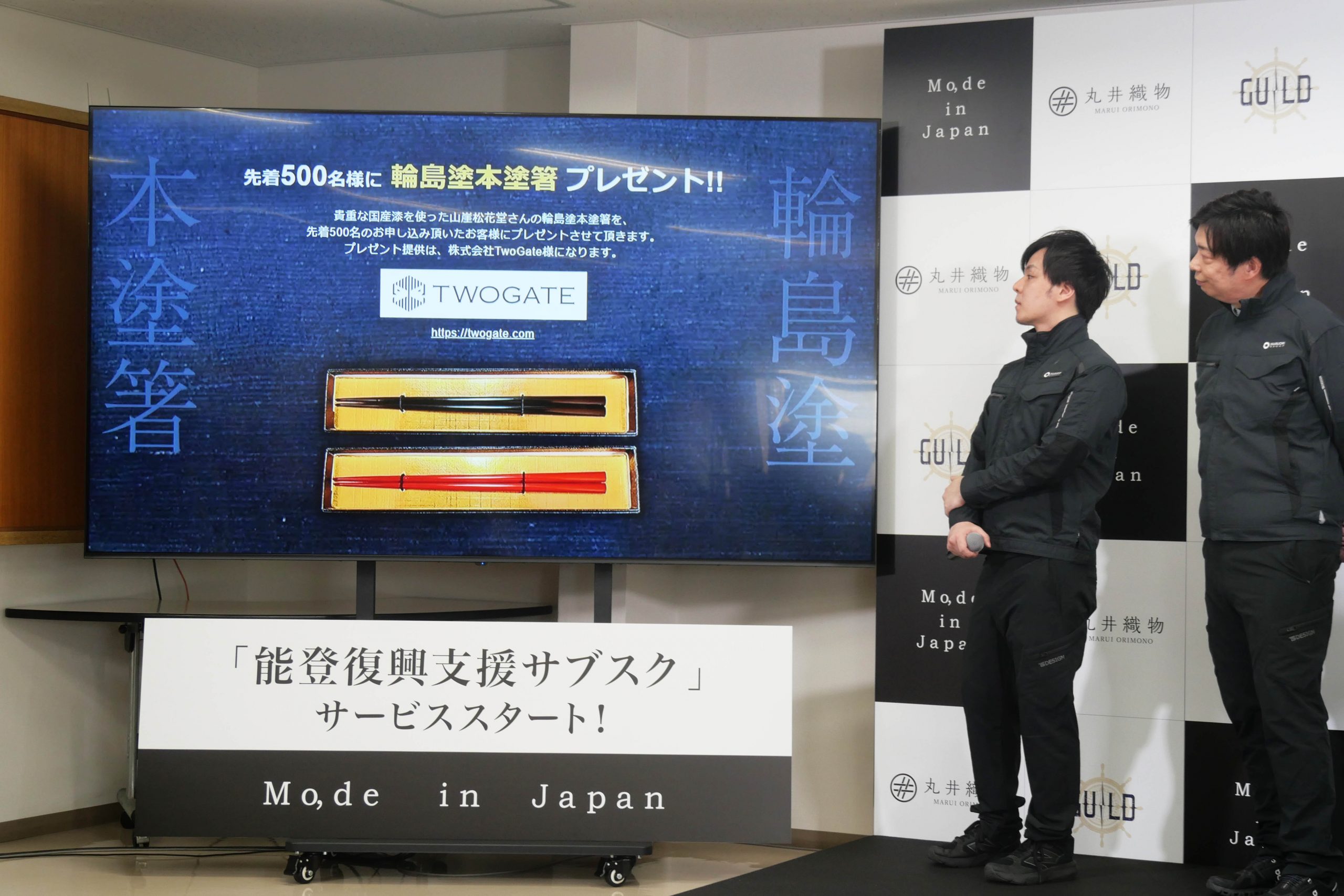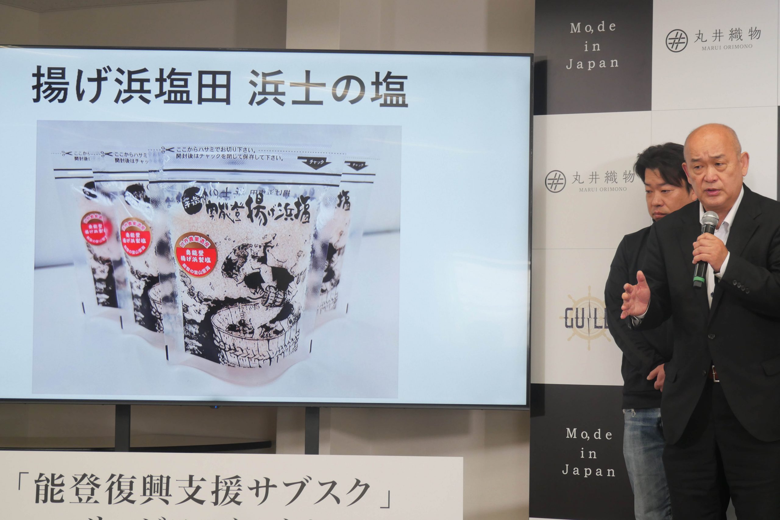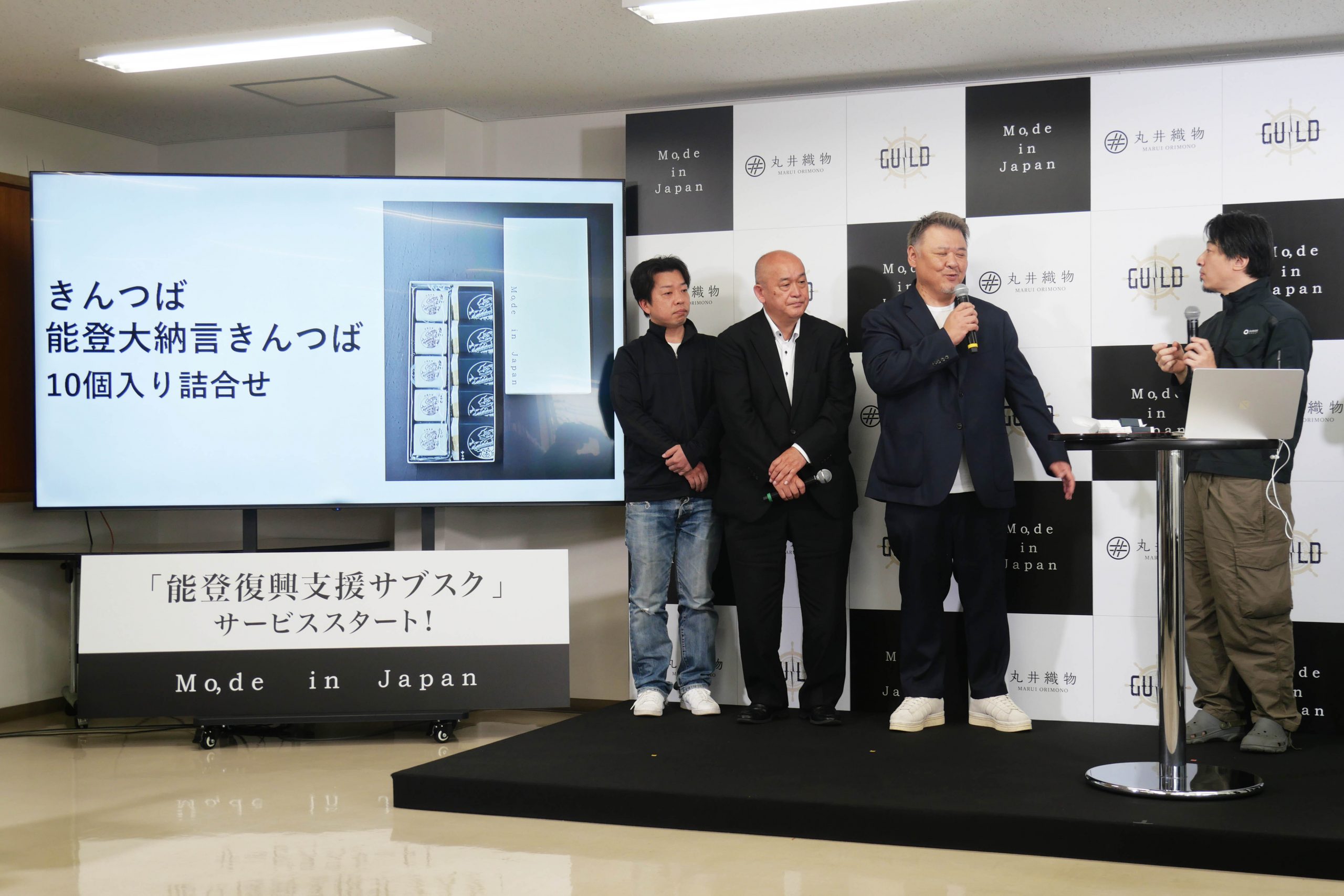 今回の発表会では、能登復興支援サブスクの商品を製造・販売しているスタッフも登壇。今後配送される予定の商品説明をしつつ、そこに込めた思いを語った。