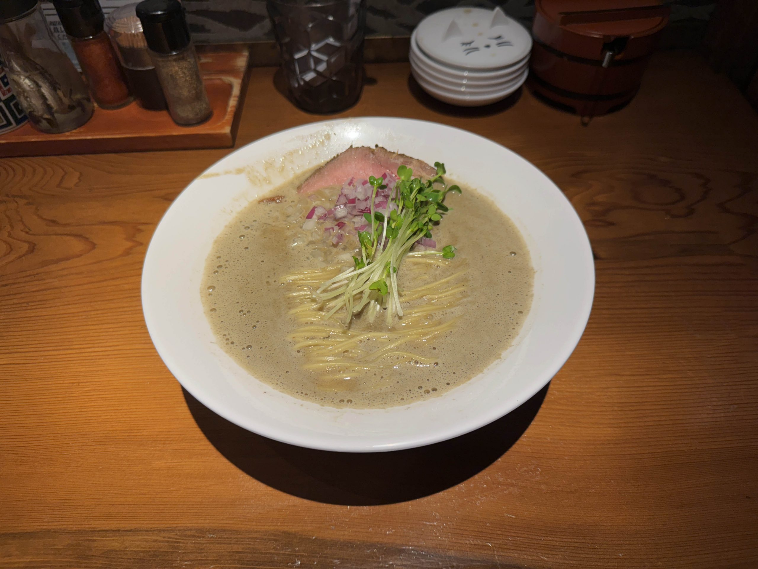 目の前にやってきた特濃煮干豚骨ラーメン。かなりスープが濃そう。濃厚スープに、さらに煮干しを追加しているらしい。濃いのに、もっと濃くしたらしい。濃いスープが大好物なので期待しかない。