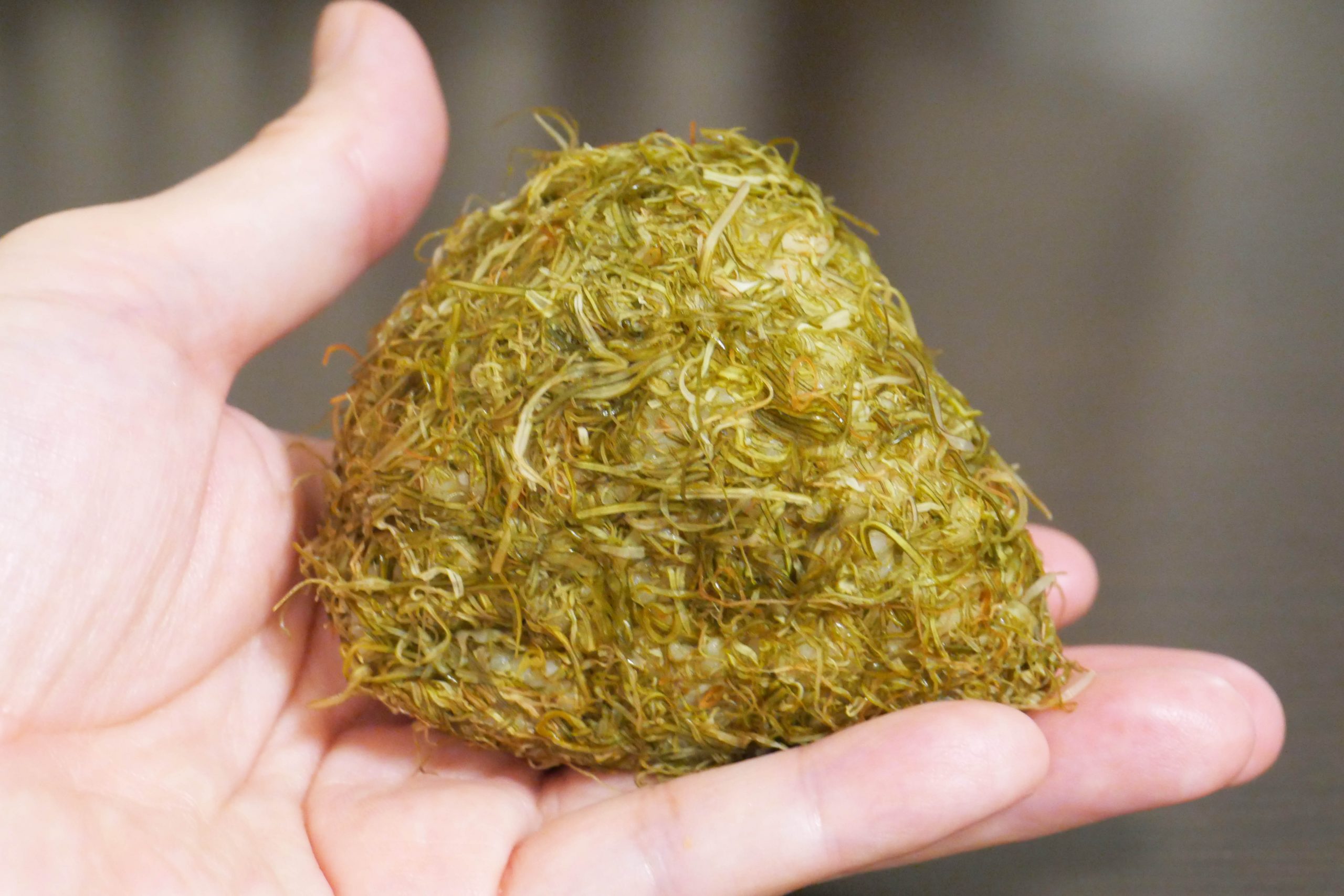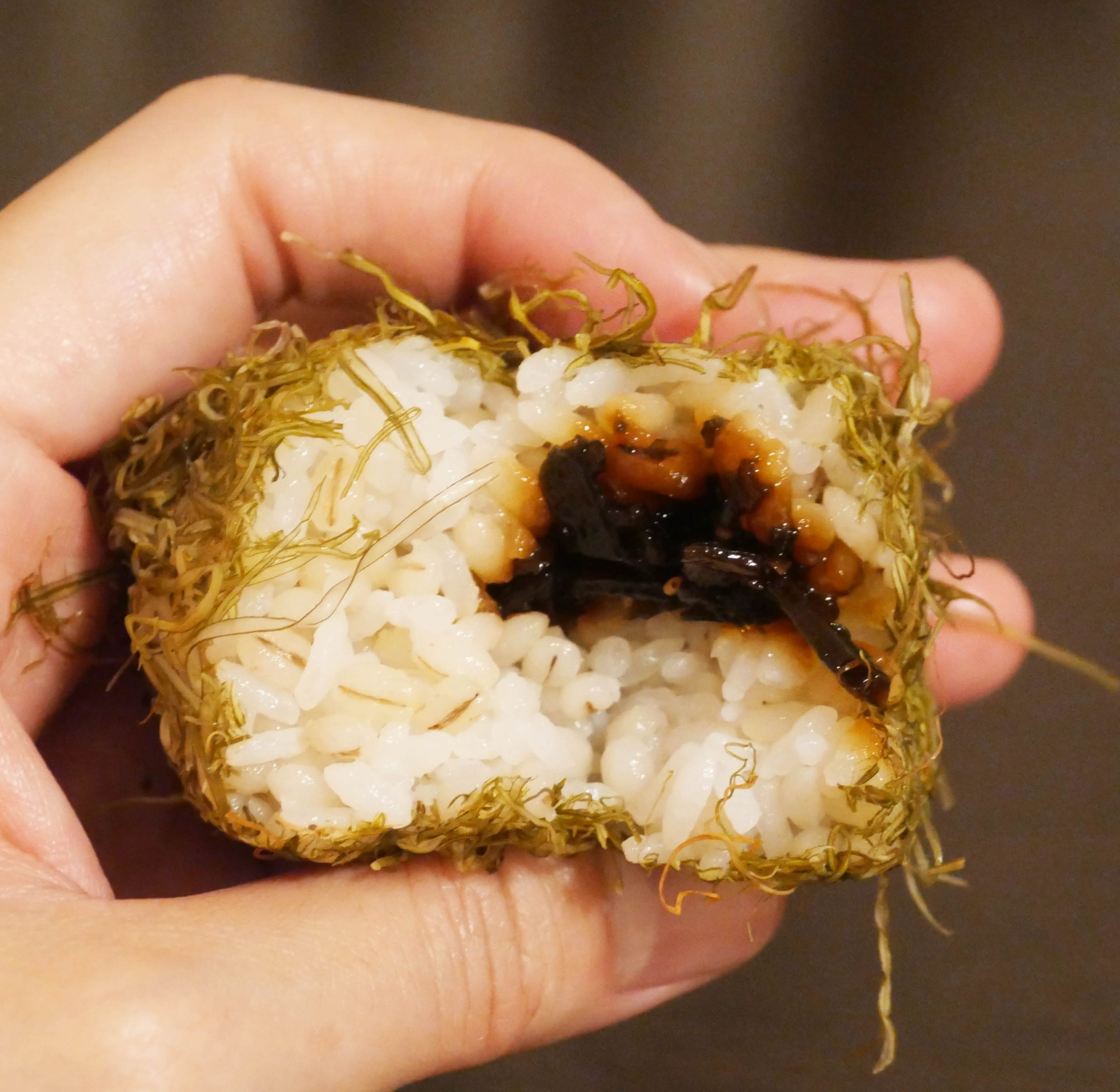 そんなに大きくないと思うけど、手に持つと重さをズッシリ感じる。でも米はふんわりしている。食べると、黒とろろを通して海の薫りが! それと同時に、とろろ的な「ほんのりと感じる酸味ありそうな薫り」が嗅覚にやってきて、あとから酸味が味覚にやってくる。イイ感じに爽やか。