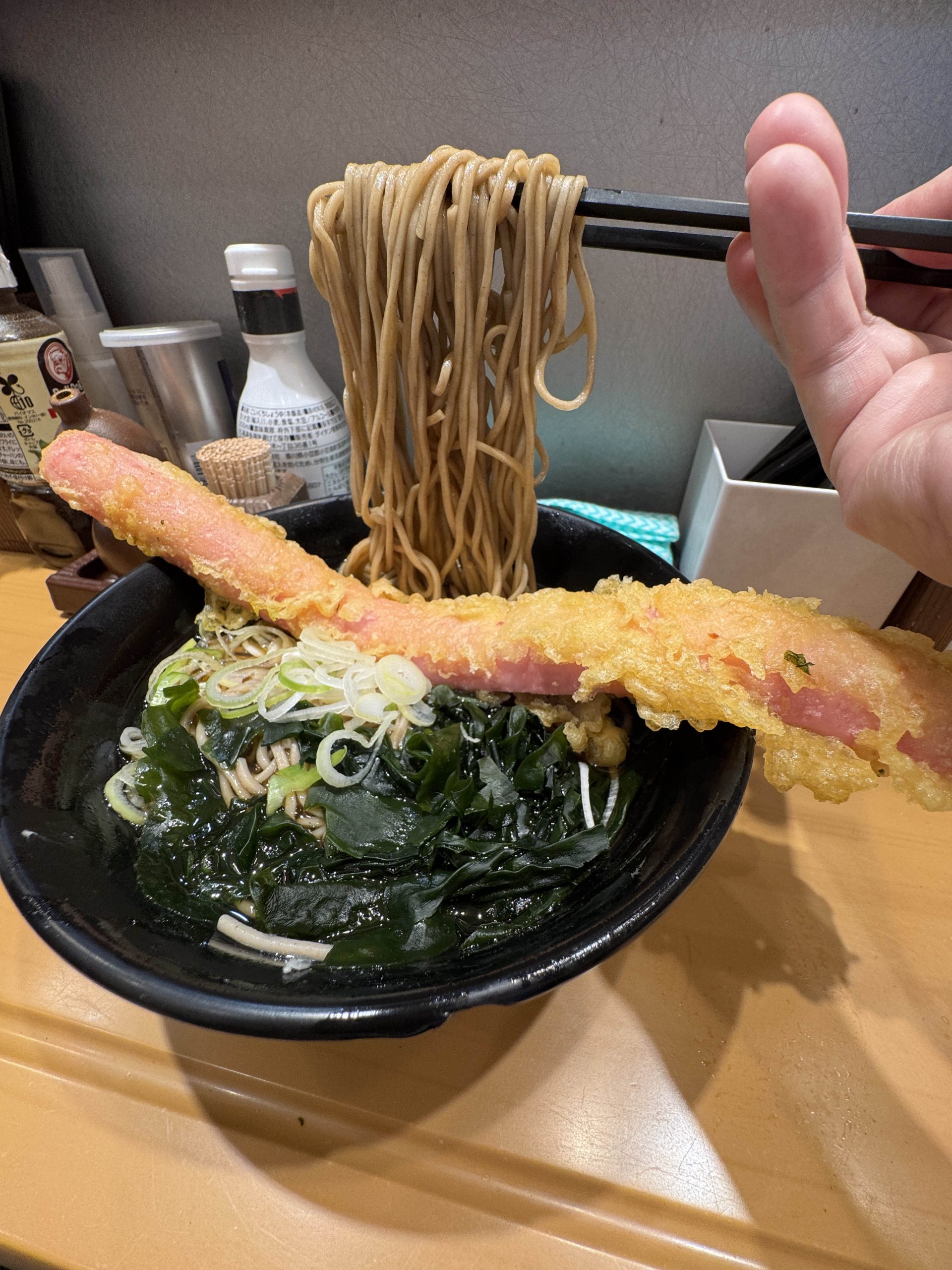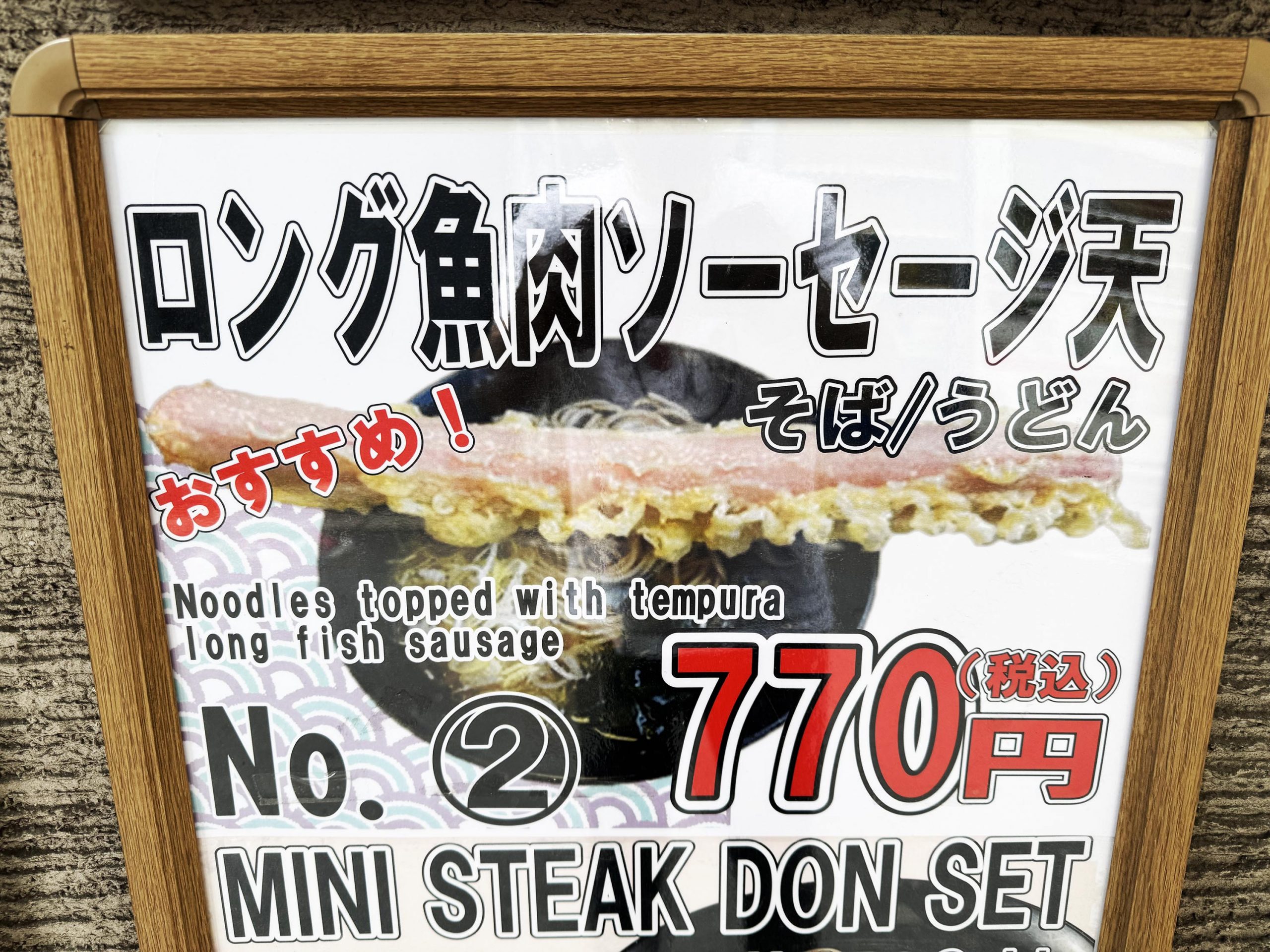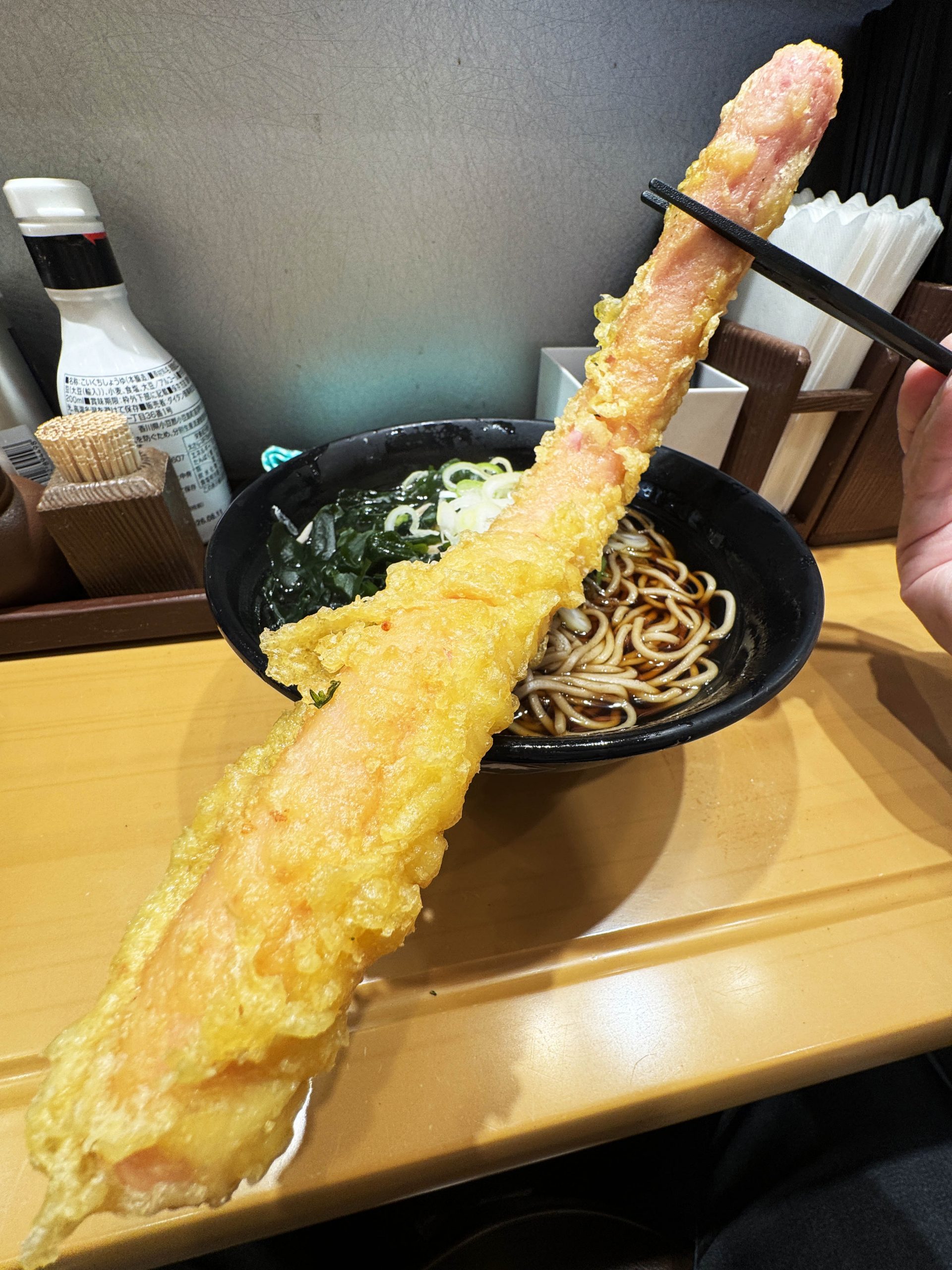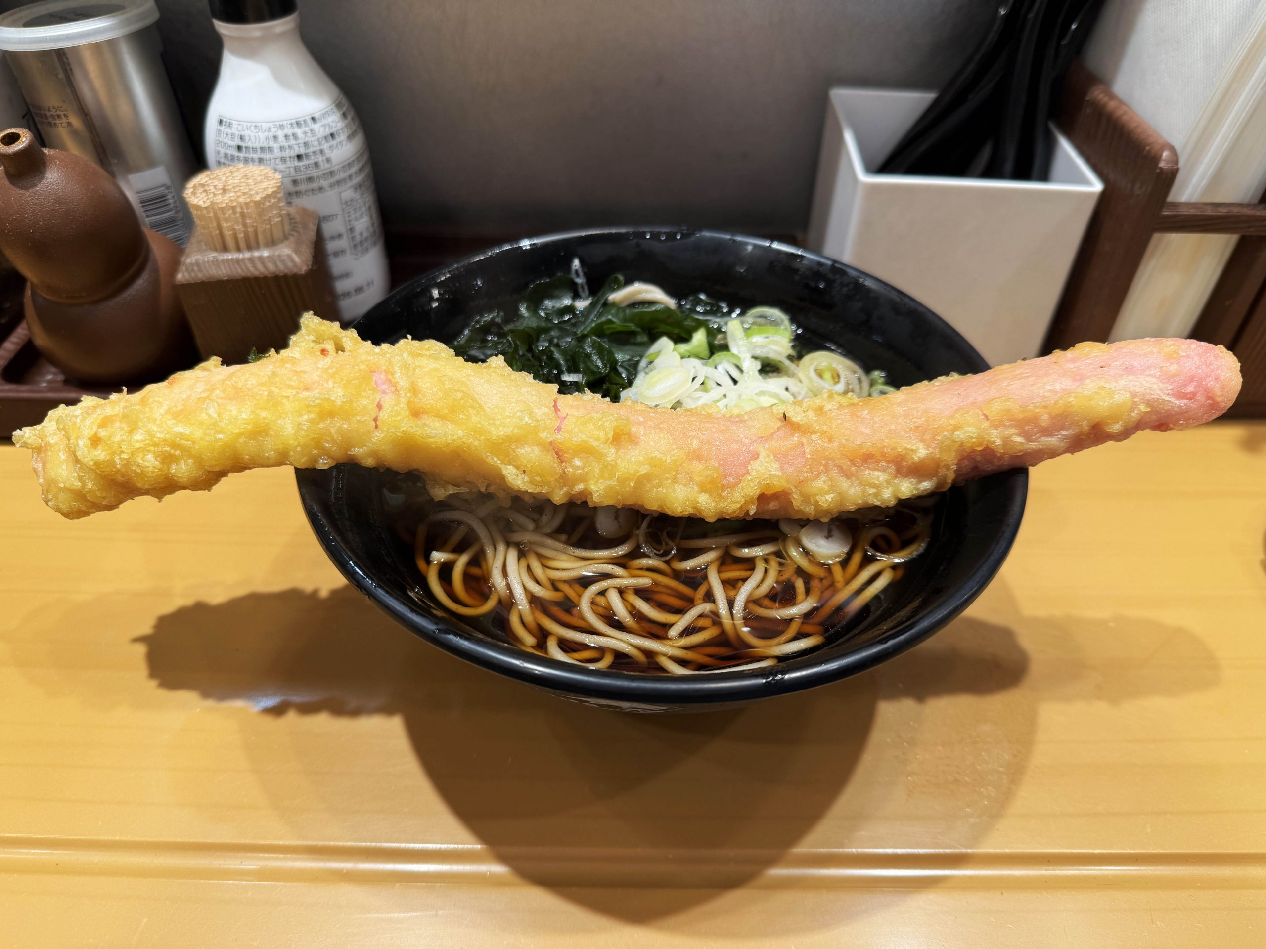蕎麦をすすり、富士そばだからこそのおいしいおつゆを楽しむ。そしてかじる、ロング魚肉ソーセージ天。衣の油の香ばしさと、ロング魚肉ソーセージの「あぁ魚肉ってこうだよなァ」と心の底から思えるおいしさ。すする、かじる、すする、かじる、それを交互に楽しむ。