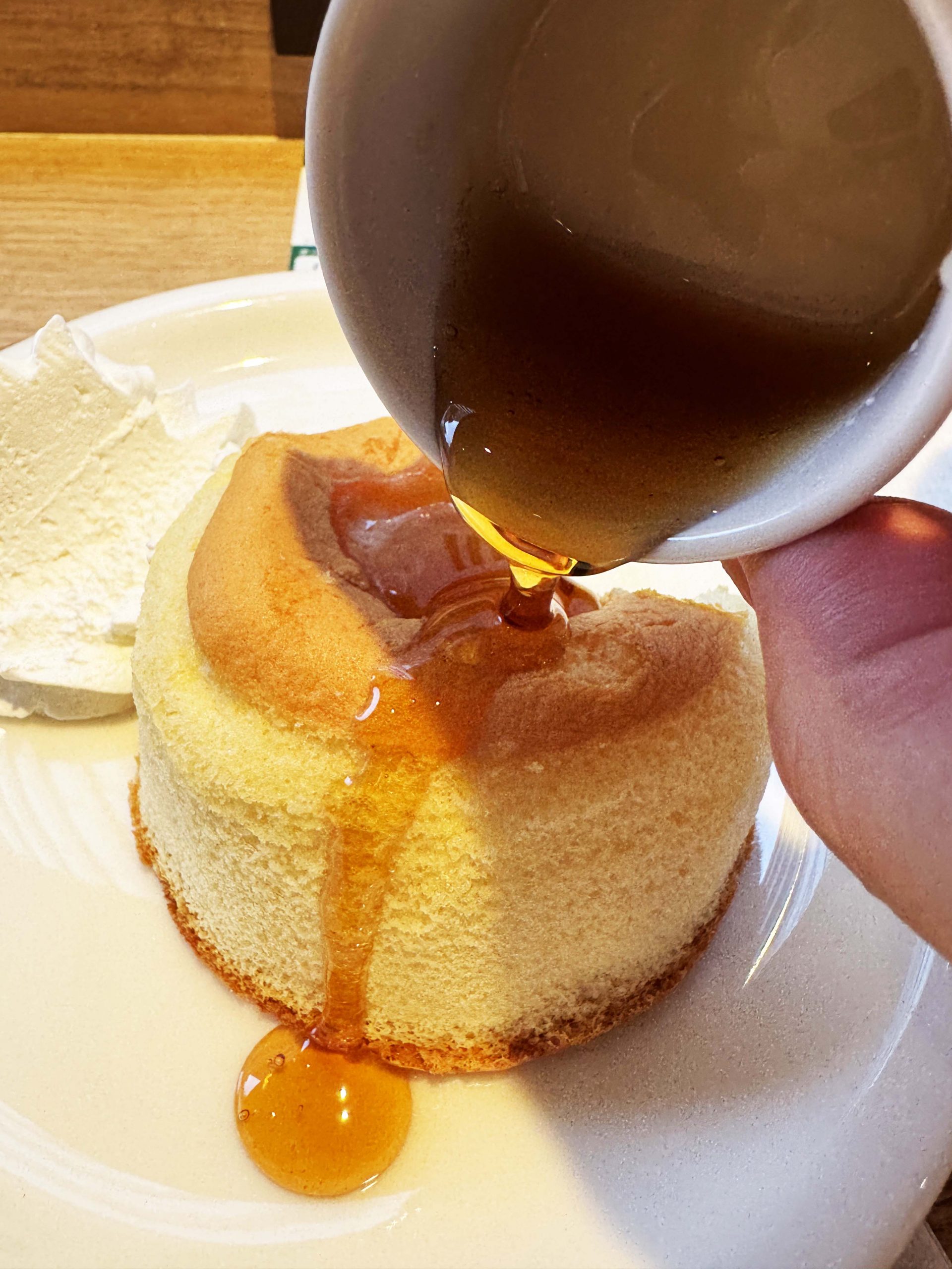 最初のひとくちはそのまま食べて、あとからメイプルシロップをかけて食べる。おおっ!! なるほど、生地が上品な甘さである理由がわかった。メイプルシロップの甘さが生地の繊細な甘さを補完するのだ。しっかりと、味と味のバランスを考えて仕上げられている。
