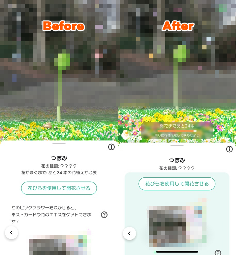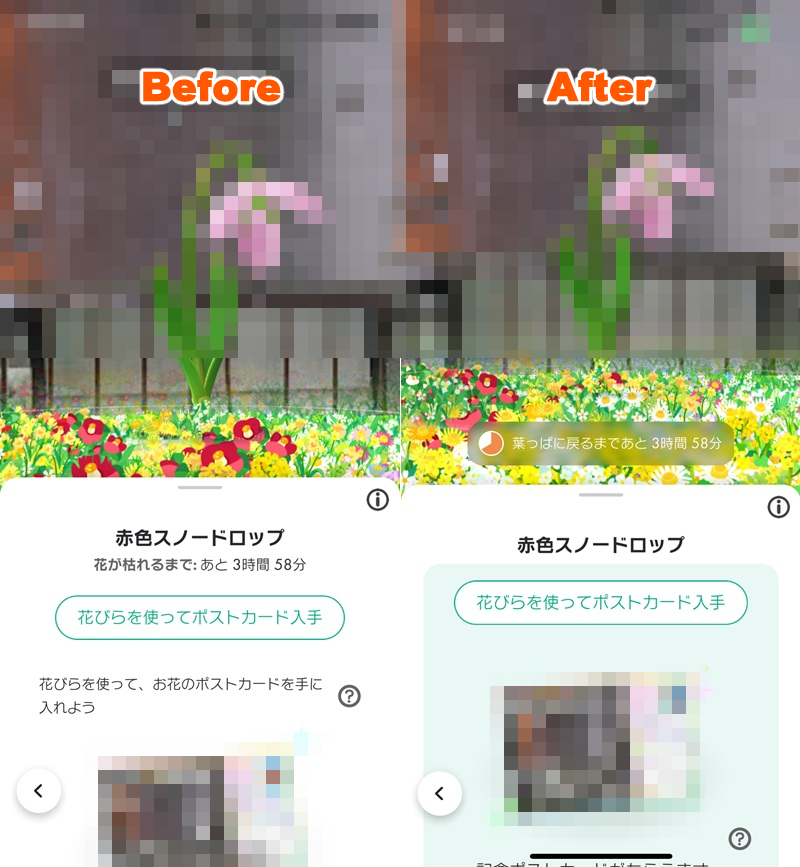 花が咲くまでと葉っぱに戻るまでの表記にゲージを取り入れ可視化され反面、文字まわりに関しては背景と被って視認性が低下。