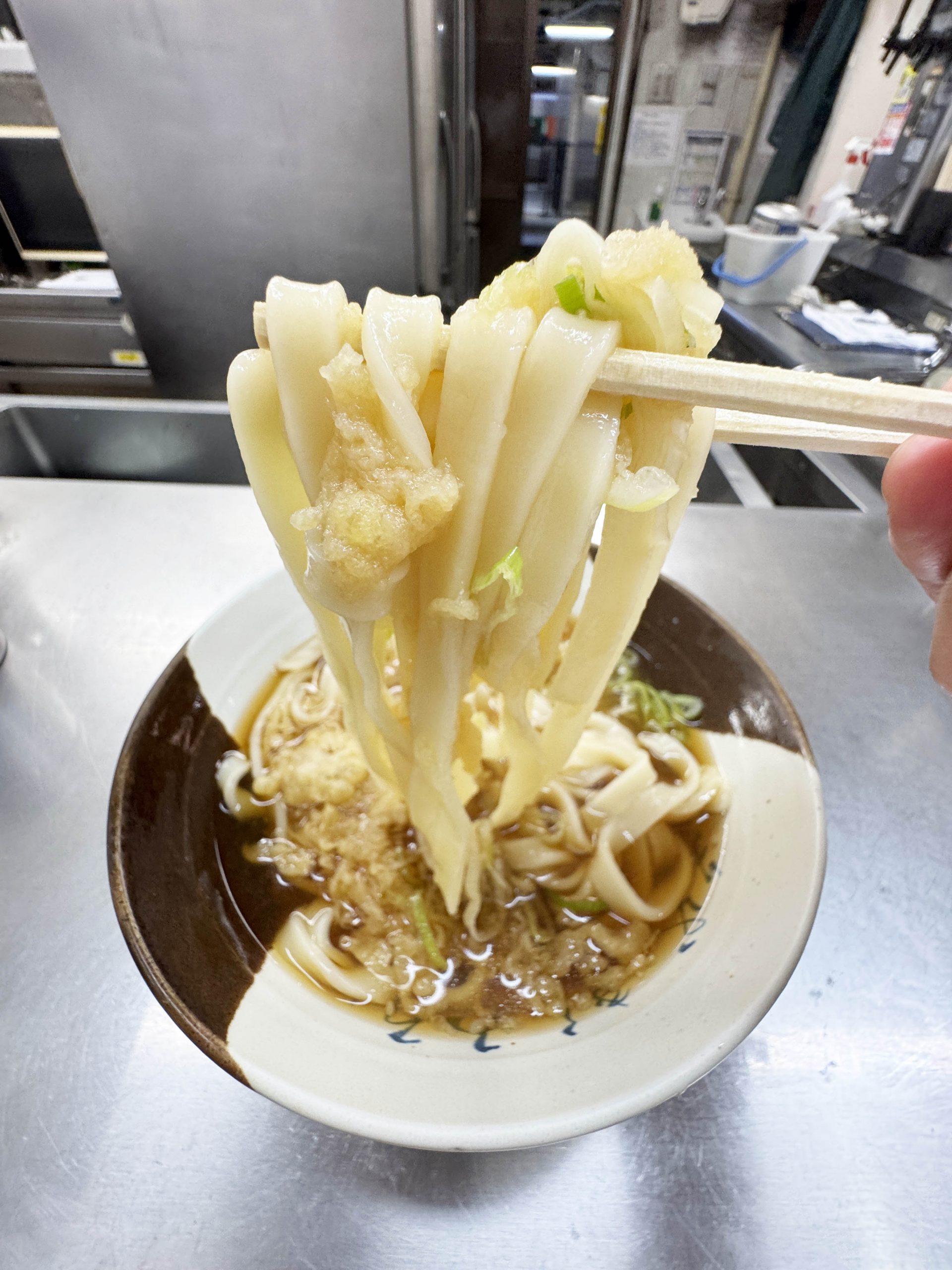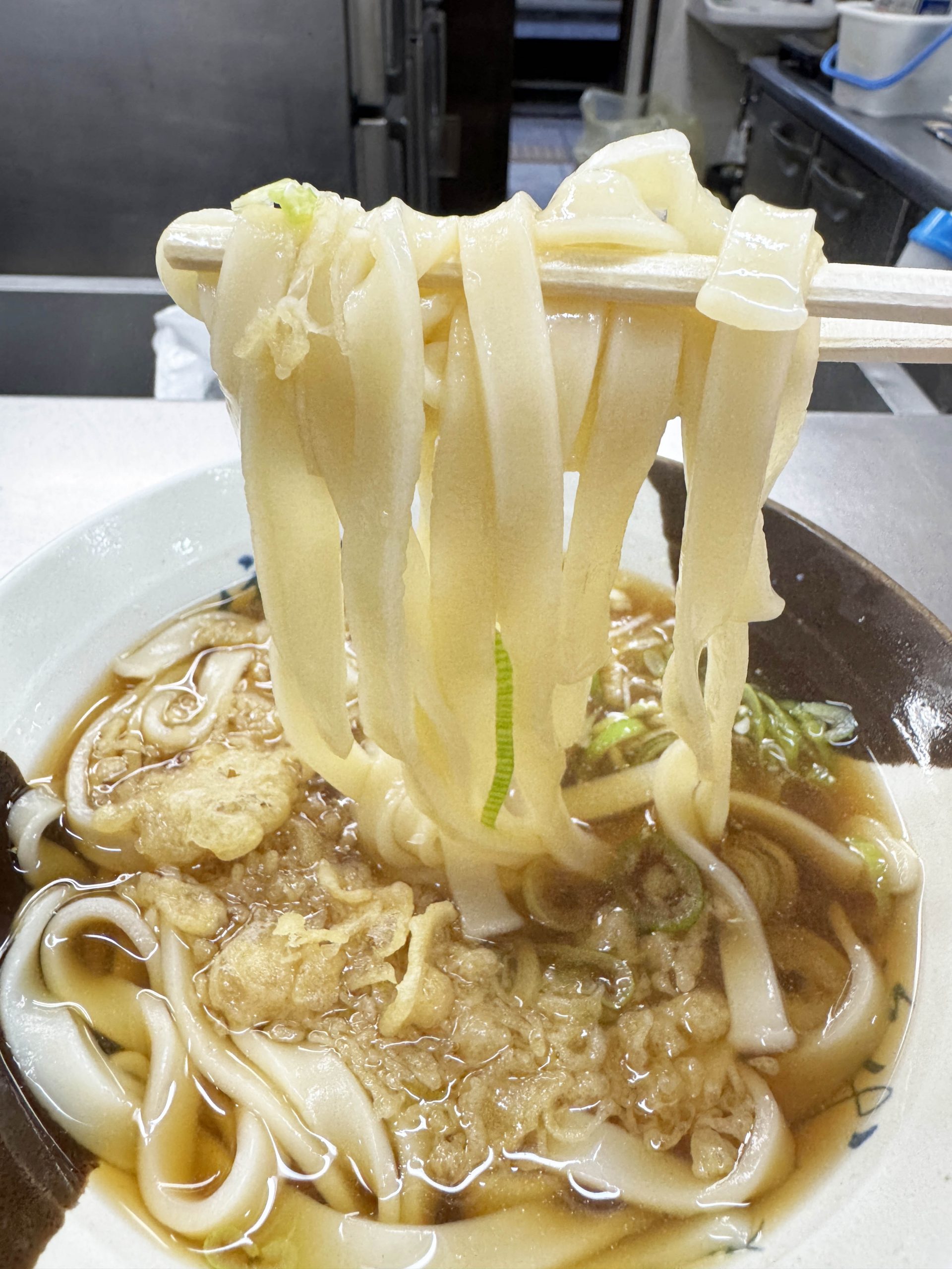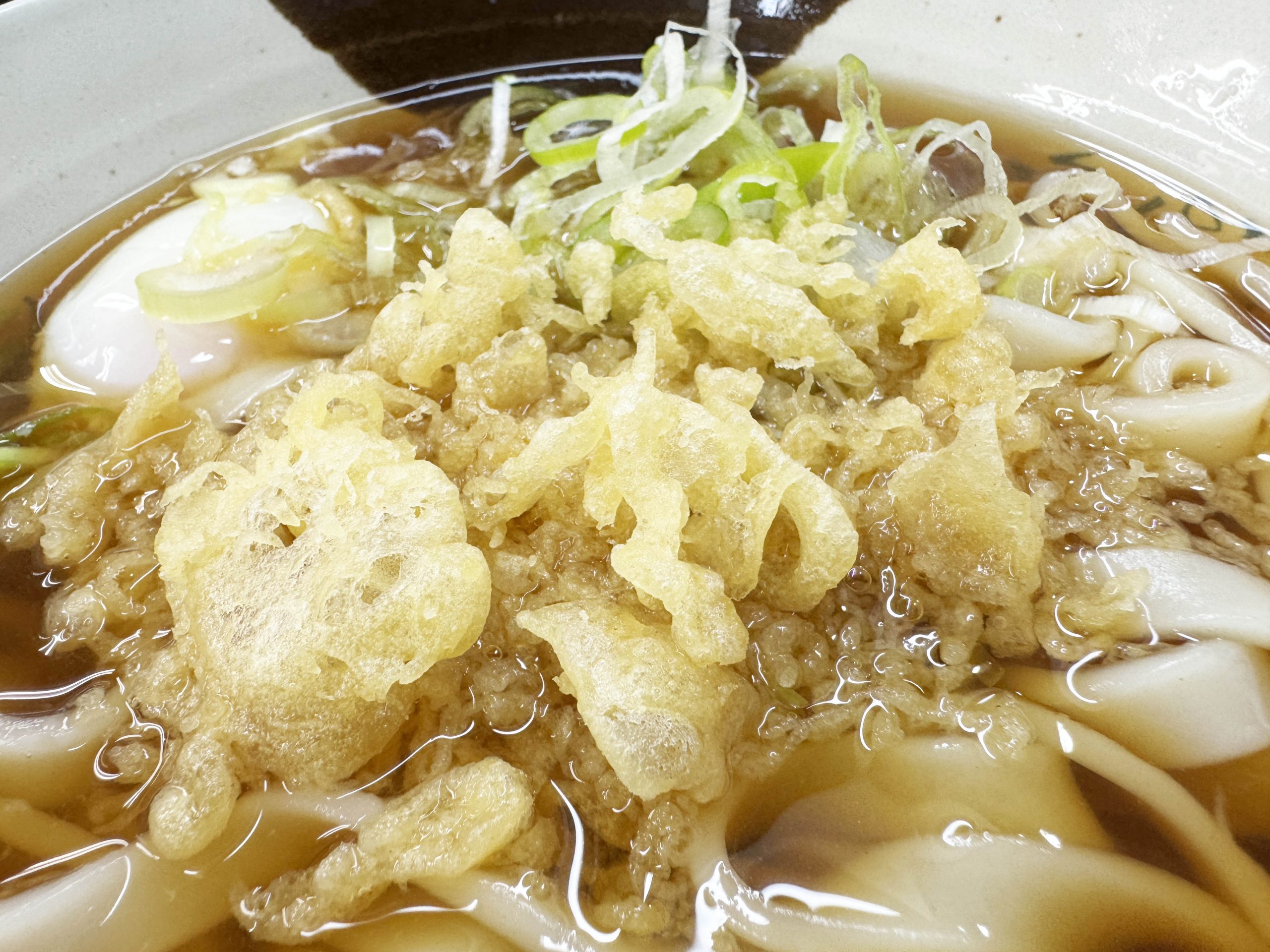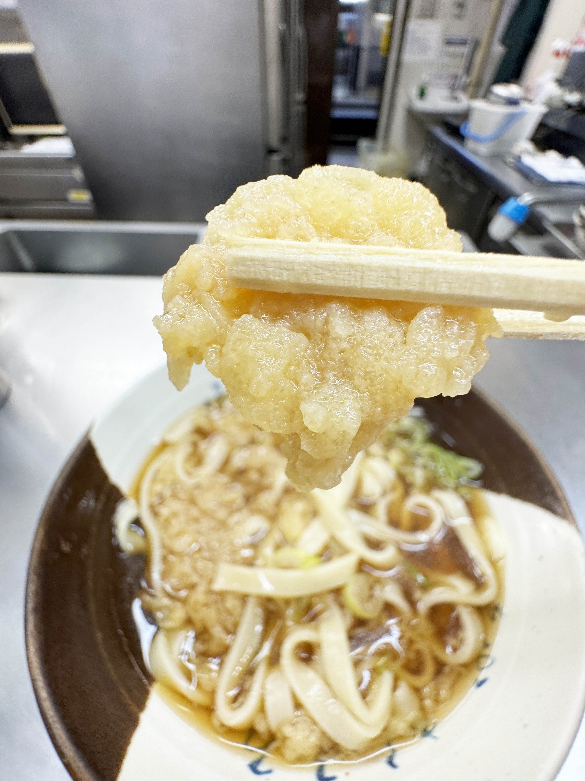 揚げ玉から流れ出る油がきしめんに香ばしさと旨味