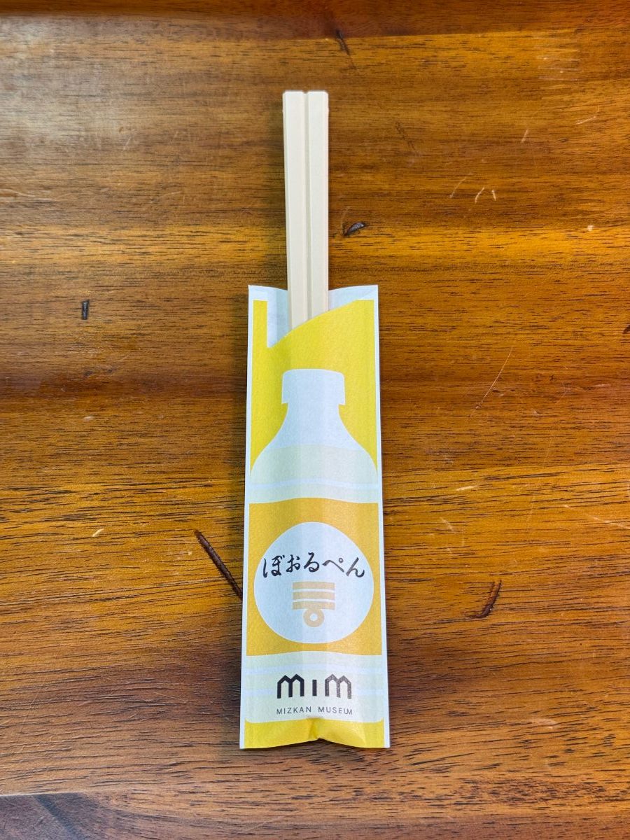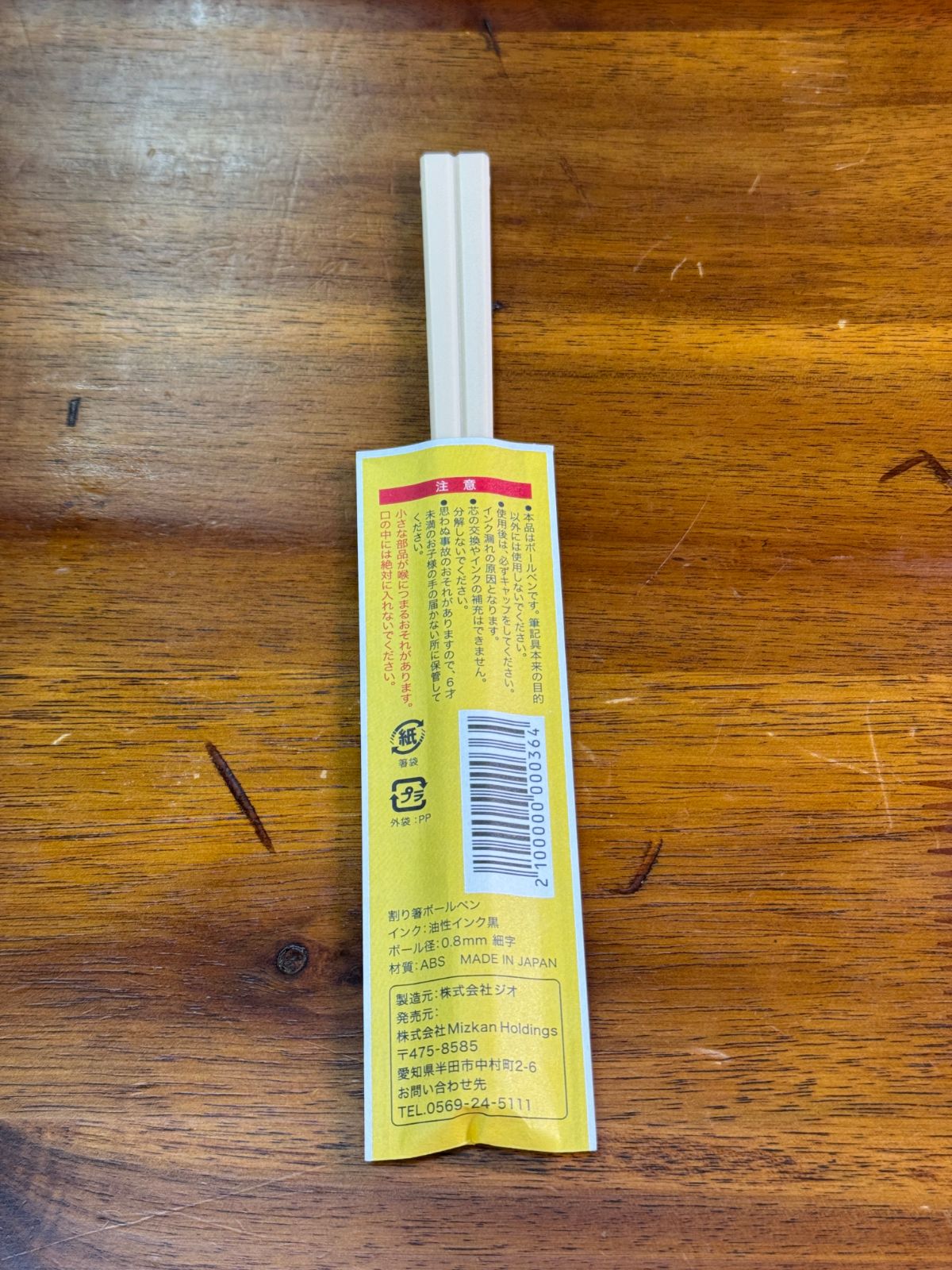 これ、割り箸に見えるけど、割り箸じゃあないんですよ。ボールペンなのです。お酢や納豆などのグルメフードで有名なミツカンが発売したボールペンで「ミツカンミュージアム」(愛知県半田市中村町2-6)で売っていたので買ってみました。