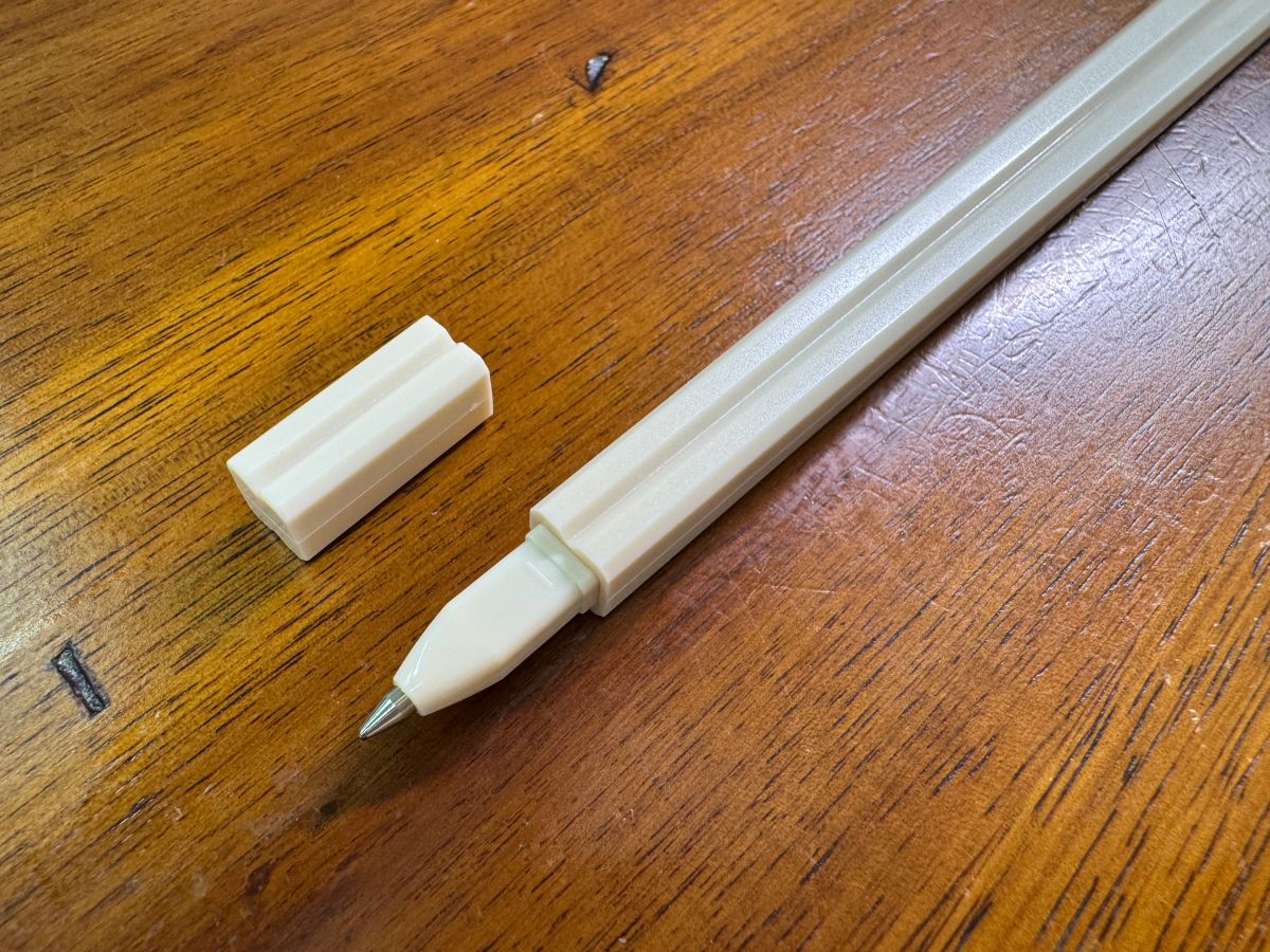 先端部分がキャップになっています。キャップを外すと、ようやく、ボールペンっぽくなりました! 相変わらず、先端以外は完全に割り箸ですが! でも、本当に、文字が書けるの? 書いてみることにしました。