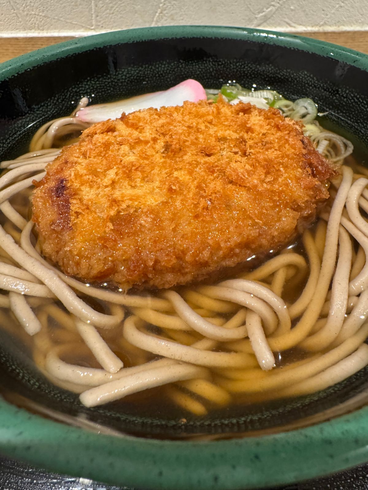 そもそも「能登牛」というだけで心が躍るコロッケです。目の前にやってきた能登牛コロッケそばは、かなりシンプル。蕎麦! かまぼこ! 能登牛コロッケ! という潔い構成。能登牛コロッケがけっこう大きくて厚みもある感じ。